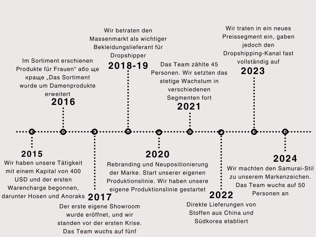 Deshalb orientieren wir uns im Entwicklungsprozess an der Philosophie von Apple: Unsere Produkte bilden ein eigenes Ökosystem, und unsere Botschaft besteht darin, nicht nur Kleidung anzubieten, sondern einen Lebensstil – die Zugehörigkeit zu einer besonderen Gemeinschaft von Samurai.