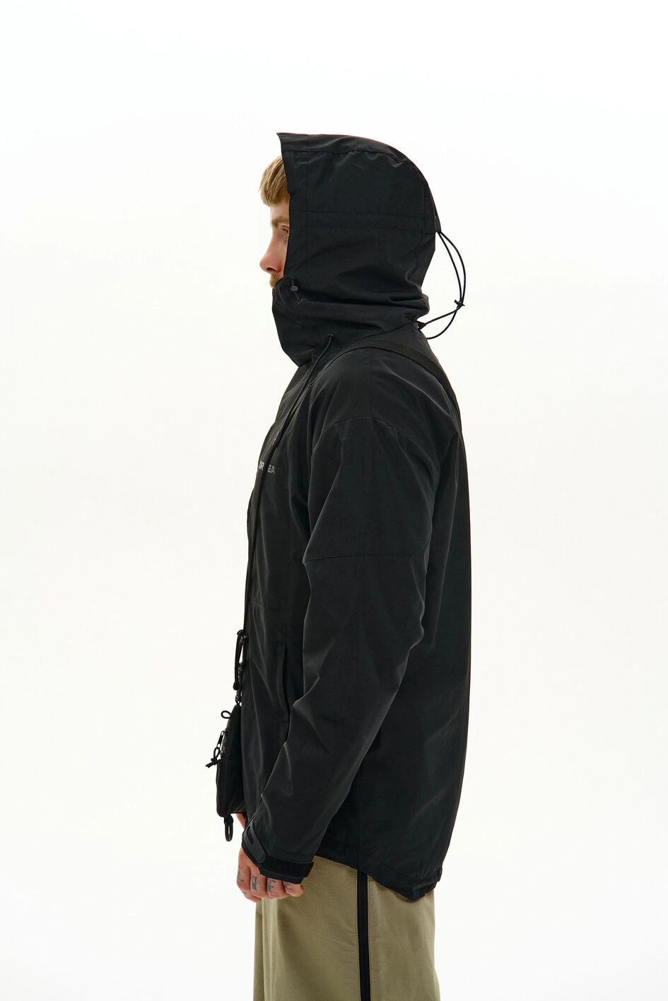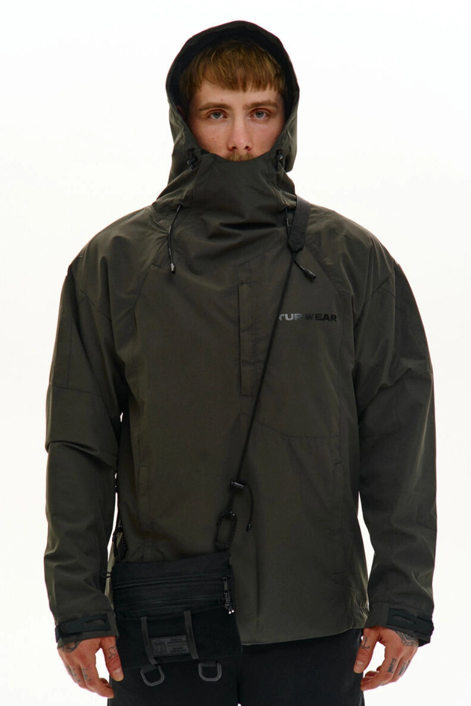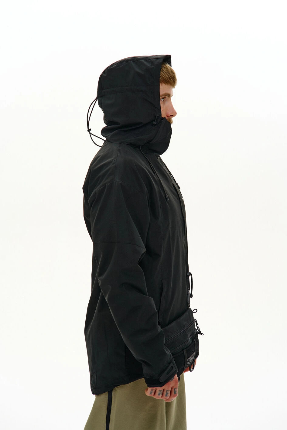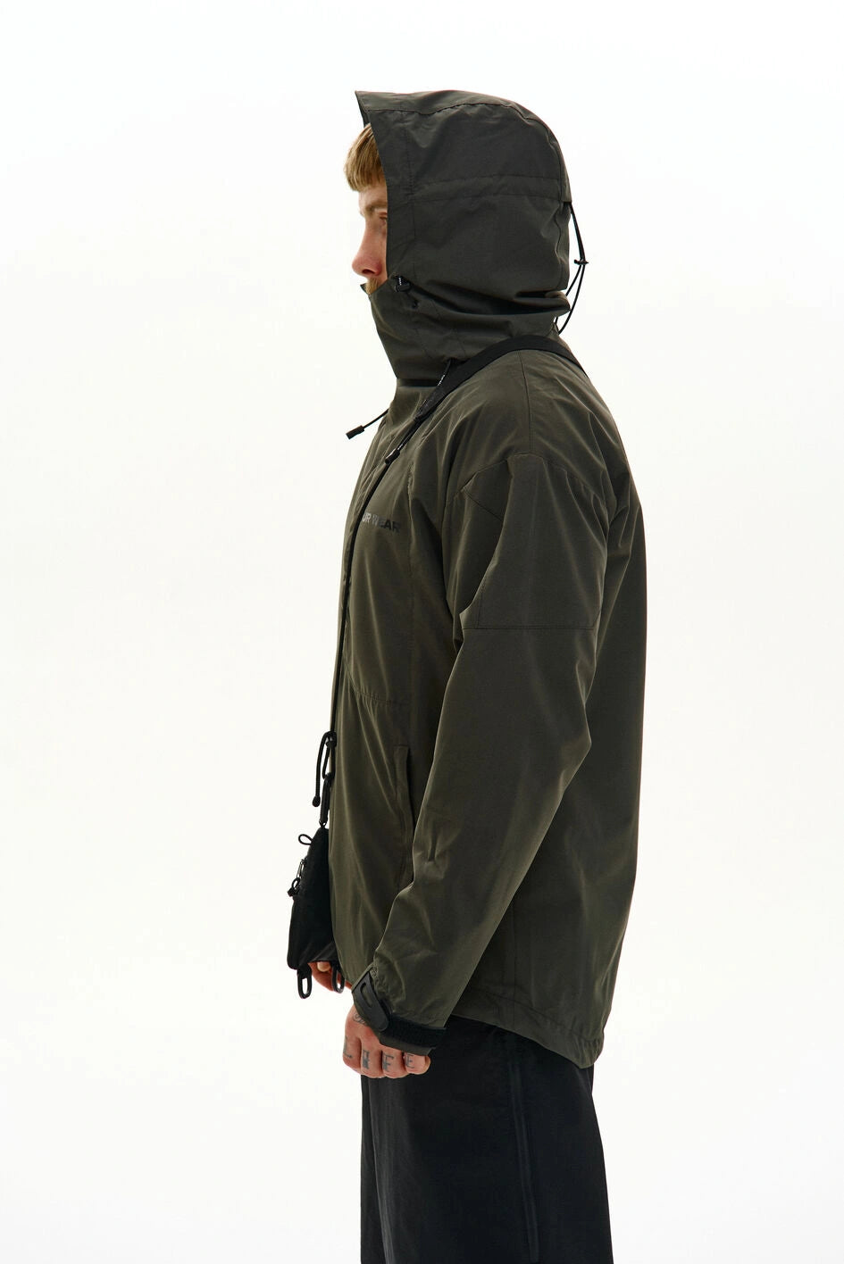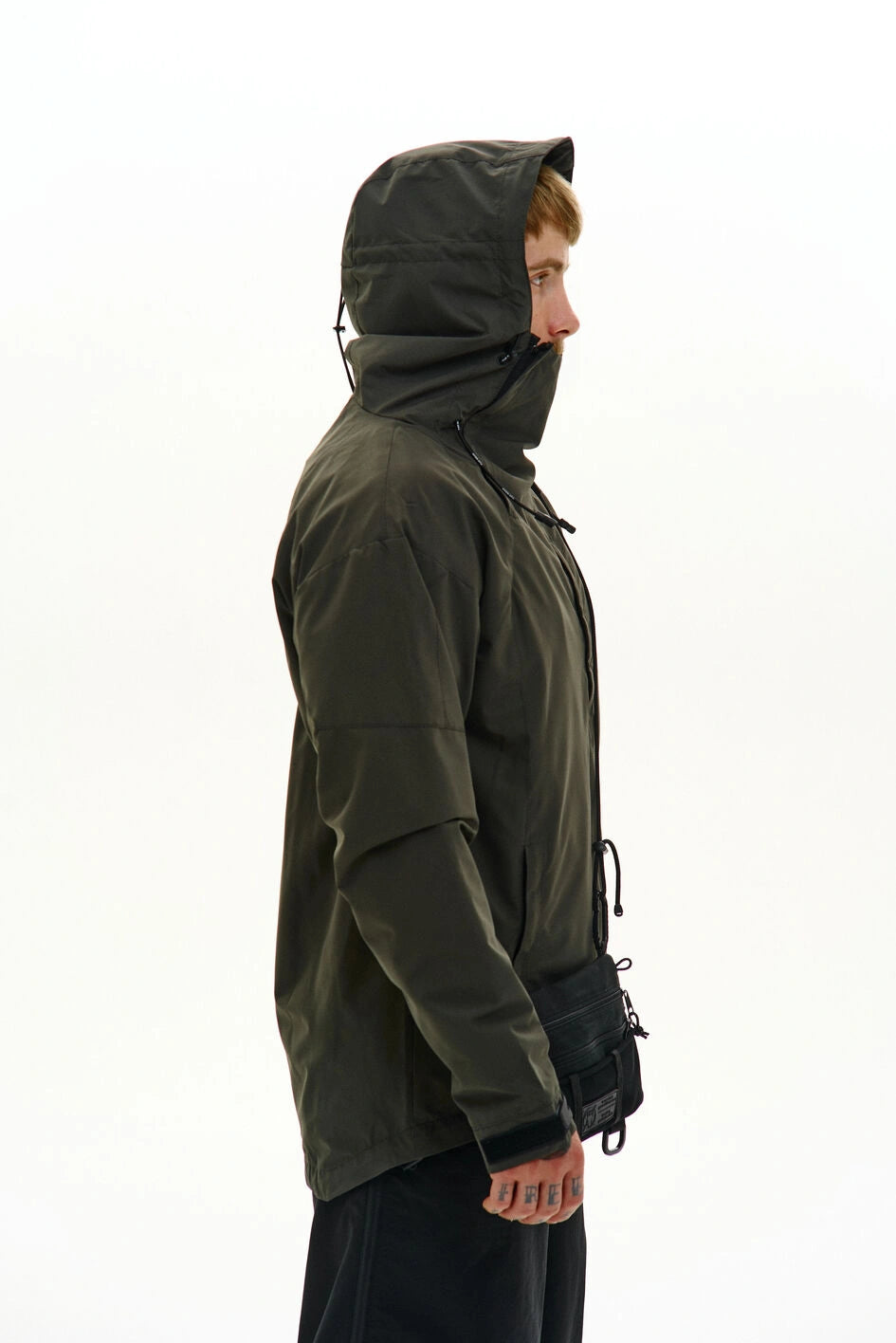 Anorak mit asymmetrischem Schnitt aus einem membranbeschichteten Regenjackenstoff, Futter aus leichtem, angenehm zu tragendem Material. Manschetten mit Klettverschluss und komplexer anatomischer Schnitt der Ärmel, Kapuze mit Schirm. Der asymmetrische Reißverschluss befindet sich auf der rechten Seite. Verfügt über eine Brusttasche und eine Kängurutasche, beide mit Reißverschluss verschließbar. Die Kapuze ist vertikal und horizontal verstellbar. Im unteren Bereich kann die Weite mit einem elastischen Kordelzug reguliert werden.