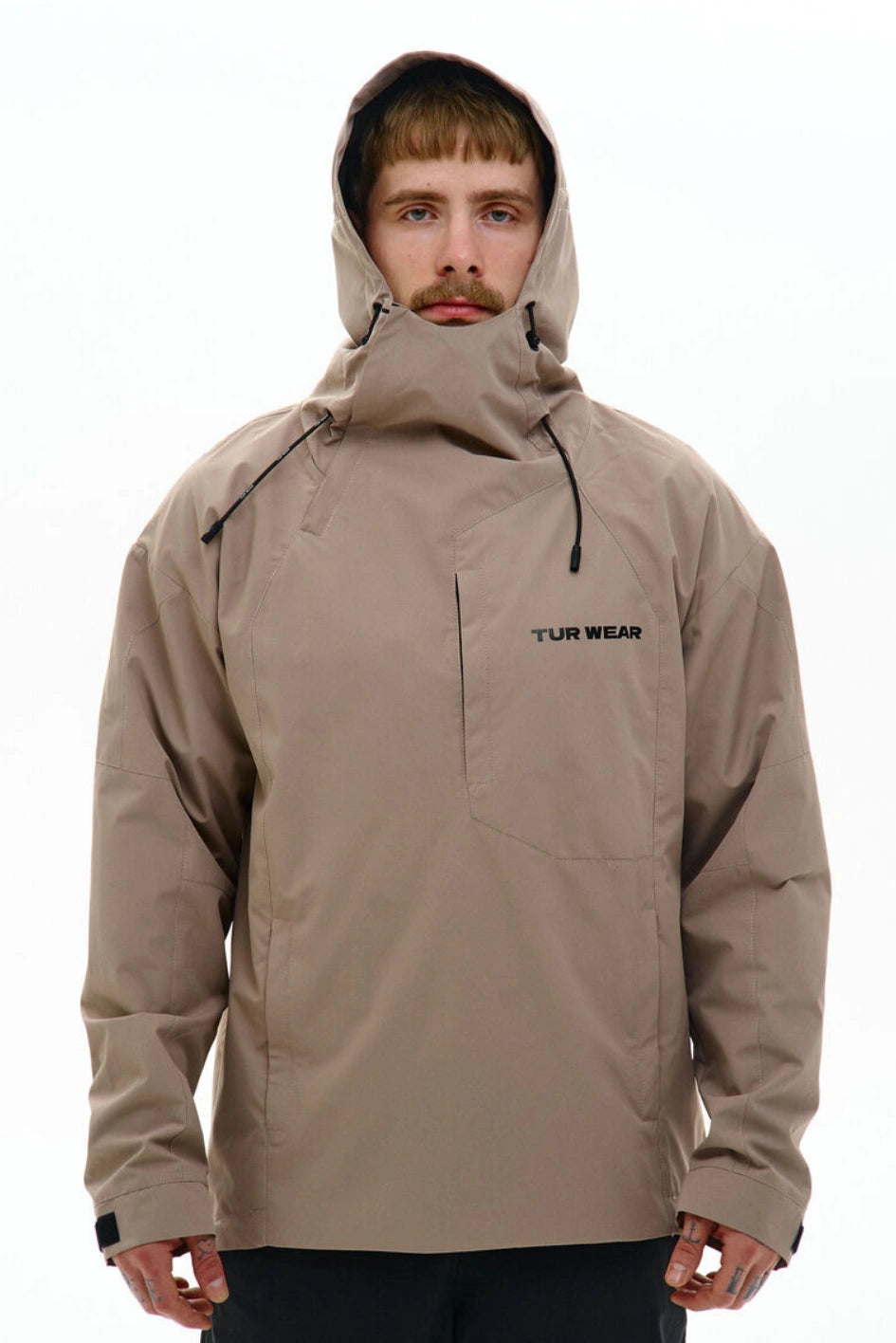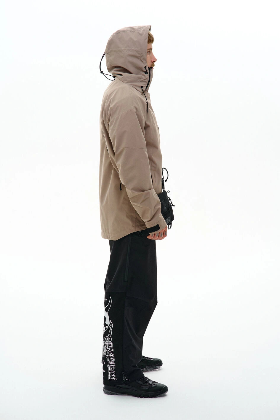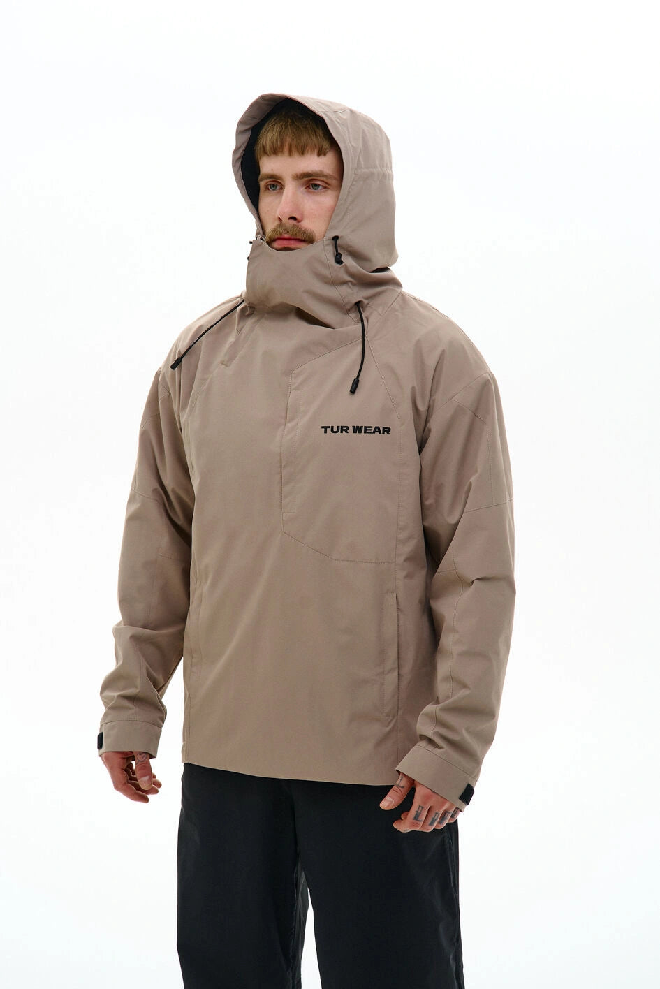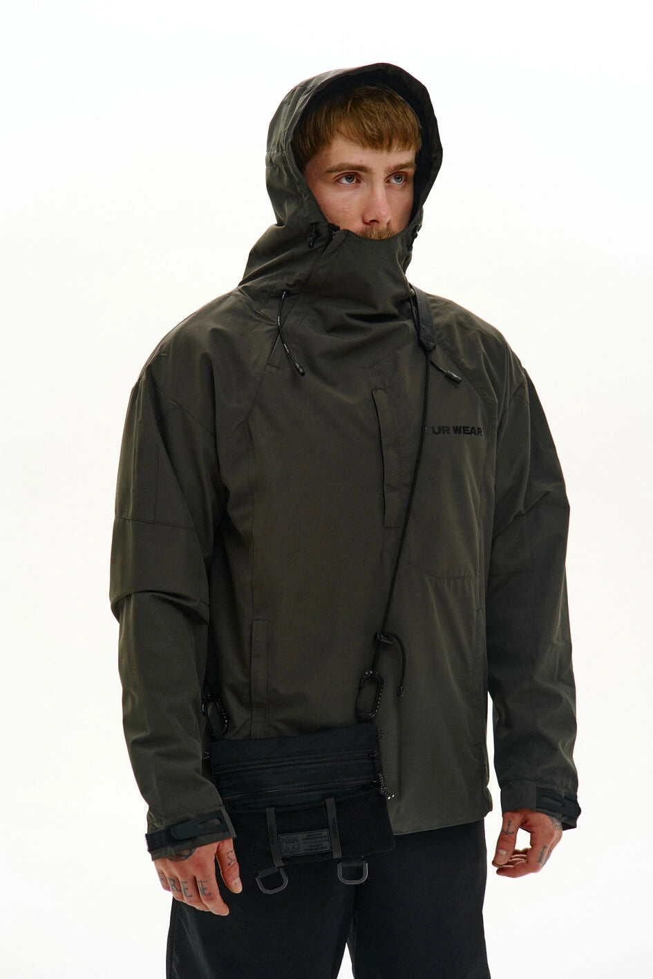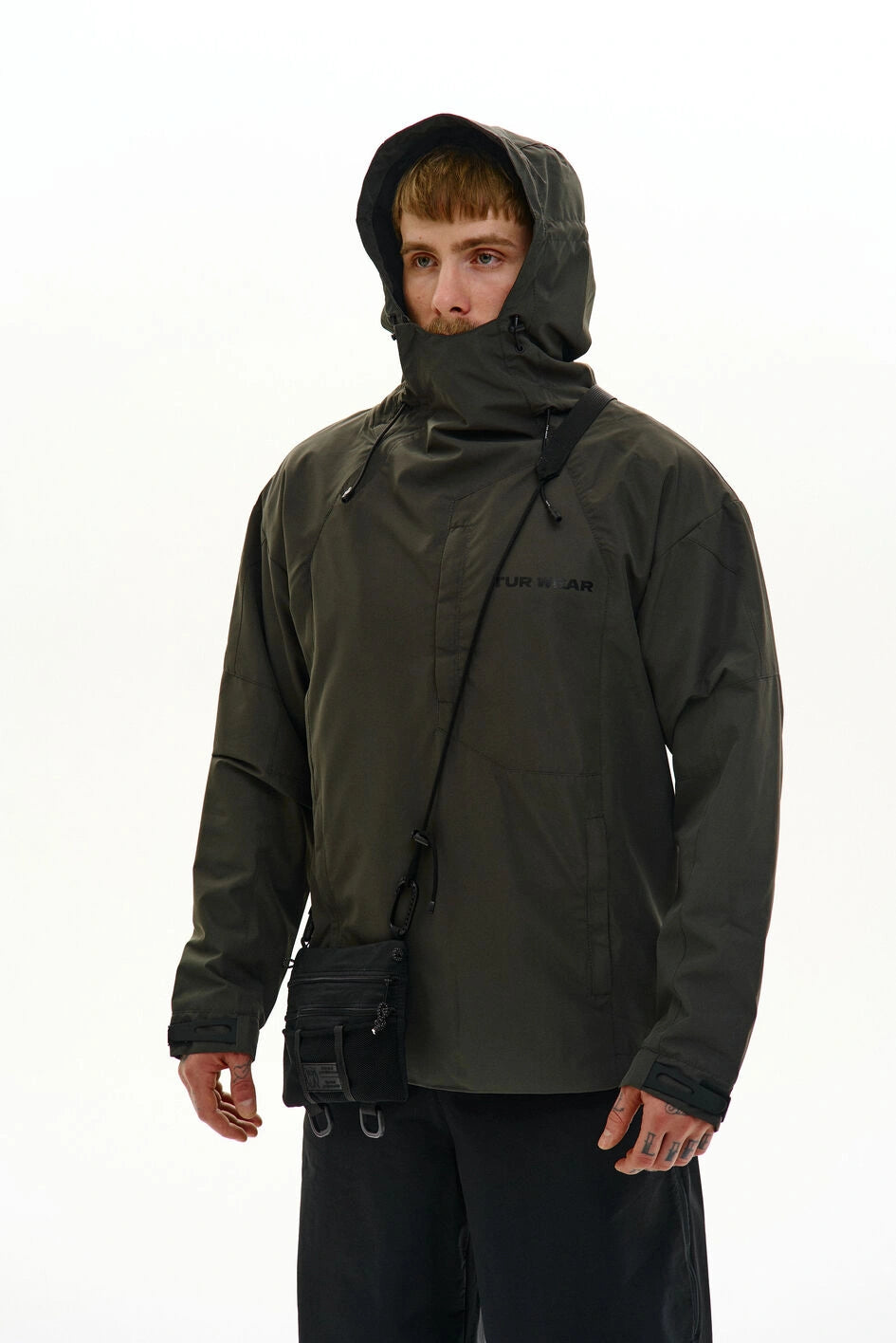 Anorak mit asymmetrischem Schnitt aus einem membranbeschichteten Regenjackenstoff, Futter aus leichtem, angenehm zu tragendem Material. Manschetten mit Klettverschluss und komplexer anatomischer Schnitt der Ärmel, Kapuze mit Schirm. Der asymmetrische Reißverschluss befindet sich auf der rechten Seite. Verfügt über eine Brusttasche und eine Kängurutasche, beide mit Reißverschluss verschließbar. Die Kapuze ist vertikal und horizontal verstellbar. Im unteren Bereich kann die Weite mit einem elastischen Kordelzug reguliert werden.