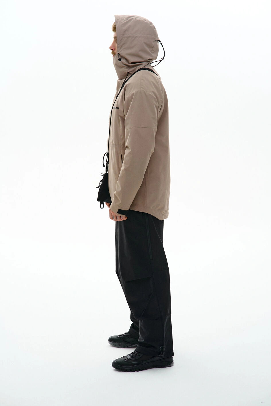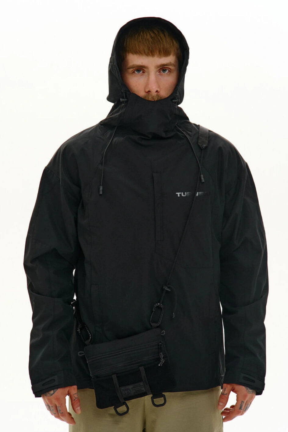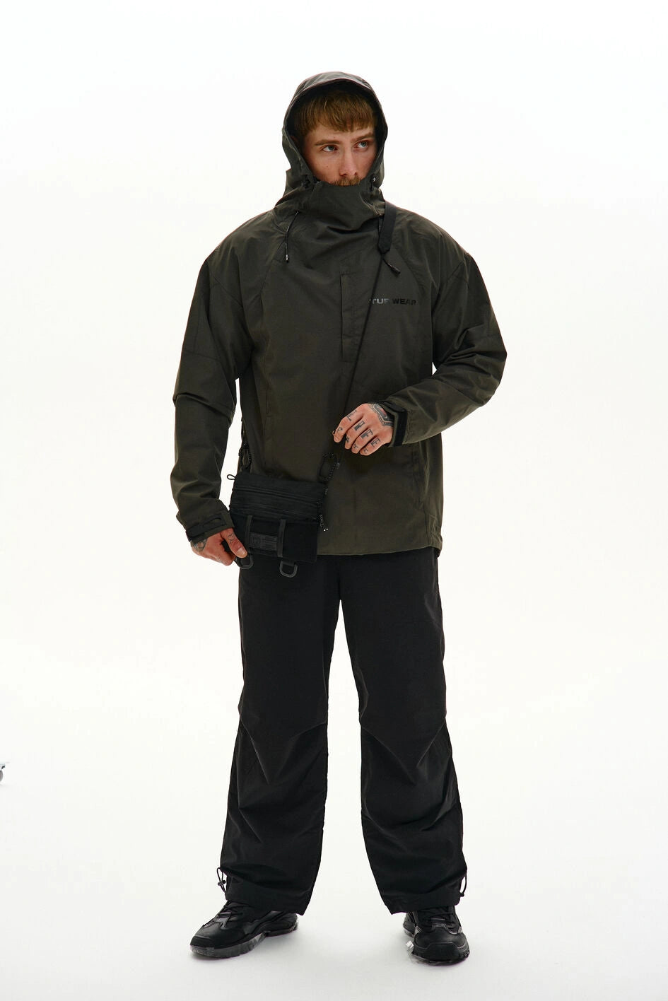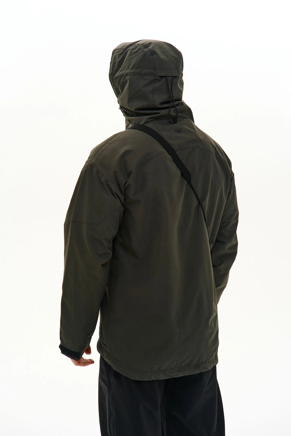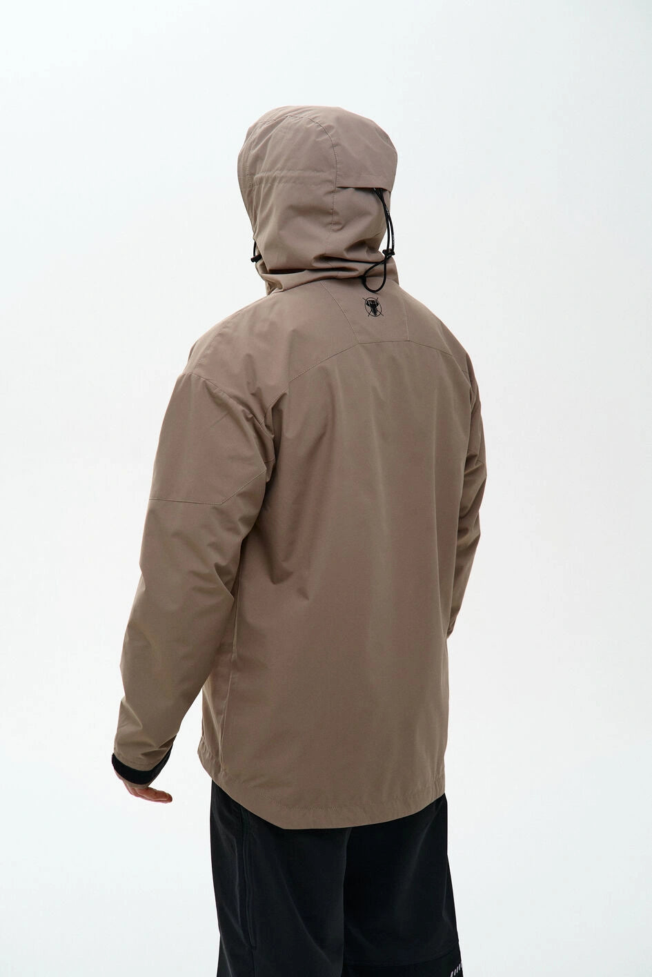 Anorak mit asymmetrischem Schnitt aus einem membranbeschichteten Regenjackenstoff, Futter aus leichtem, angenehm zu tragendem Material. Manschetten mit Klettverschluss und komplexer anatomischer Schnitt der Ärmel, Kapuze mit Schirm. Der asymmetrische Reißverschluss befindet sich auf der rechten Seite. Verfügt über eine Brusttasche und eine Kängurutasche, beide mit Reißverschluss verschließbar. Die Kapuze ist vertikal und horizontal verstellbar. Im unteren Bereich kann die Weite mit einem elastischen Kordelzug reguliert werden.