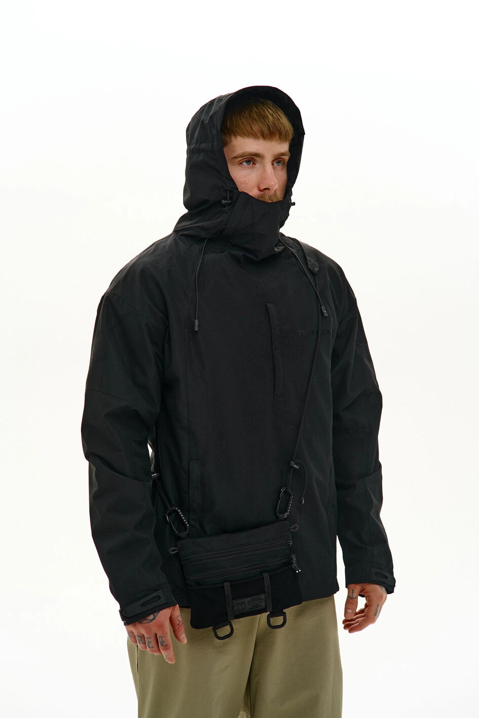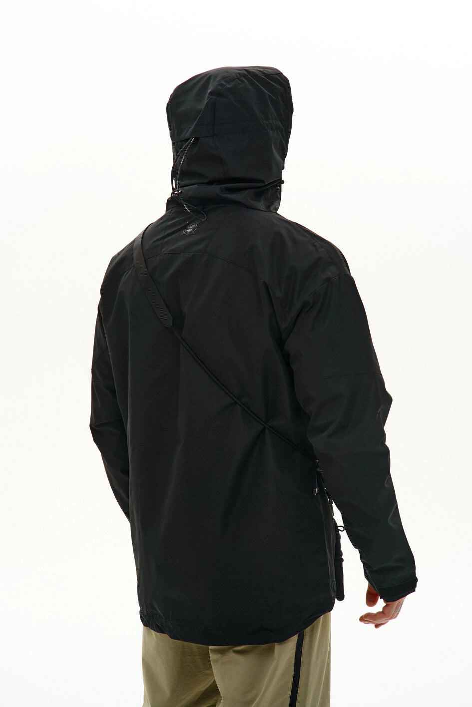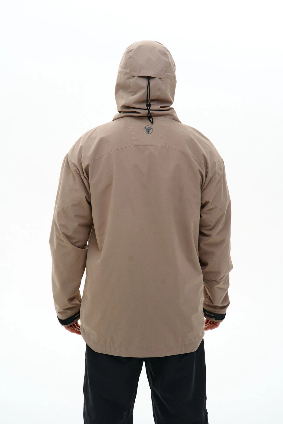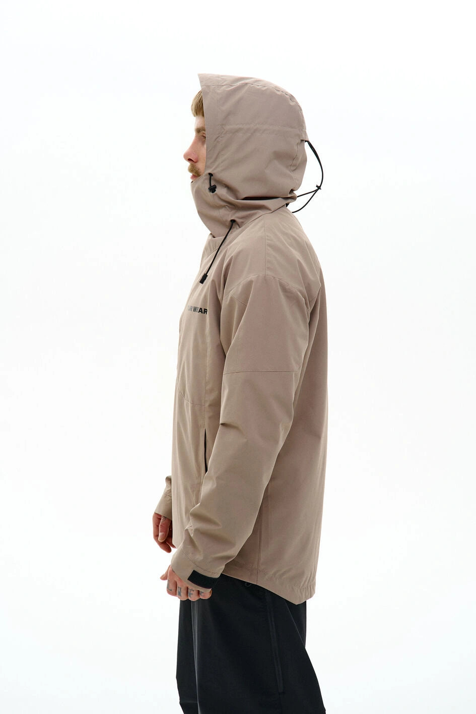 Anorak mit asymmetrischem Schnitt aus einem membranbeschichteten Regenjackenstoff, Futter aus leichtem, angenehm zu tragendem Material. Manschetten mit Klettverschluss und komplexer anatomischer Schnitt der Ärmel, Kapuze mit Schirm. Der asymmetrische Reißverschluss befindet sich auf der rechten Seite. Verfügt über eine Brusttasche und eine Kängurutasche, beide mit Reißverschluss verschließbar. Die Kapuze ist vertikal und horizontal verstellbar. Im unteren Bereich kann die Weite mit einem elastischen Kordelzug reguliert werden.