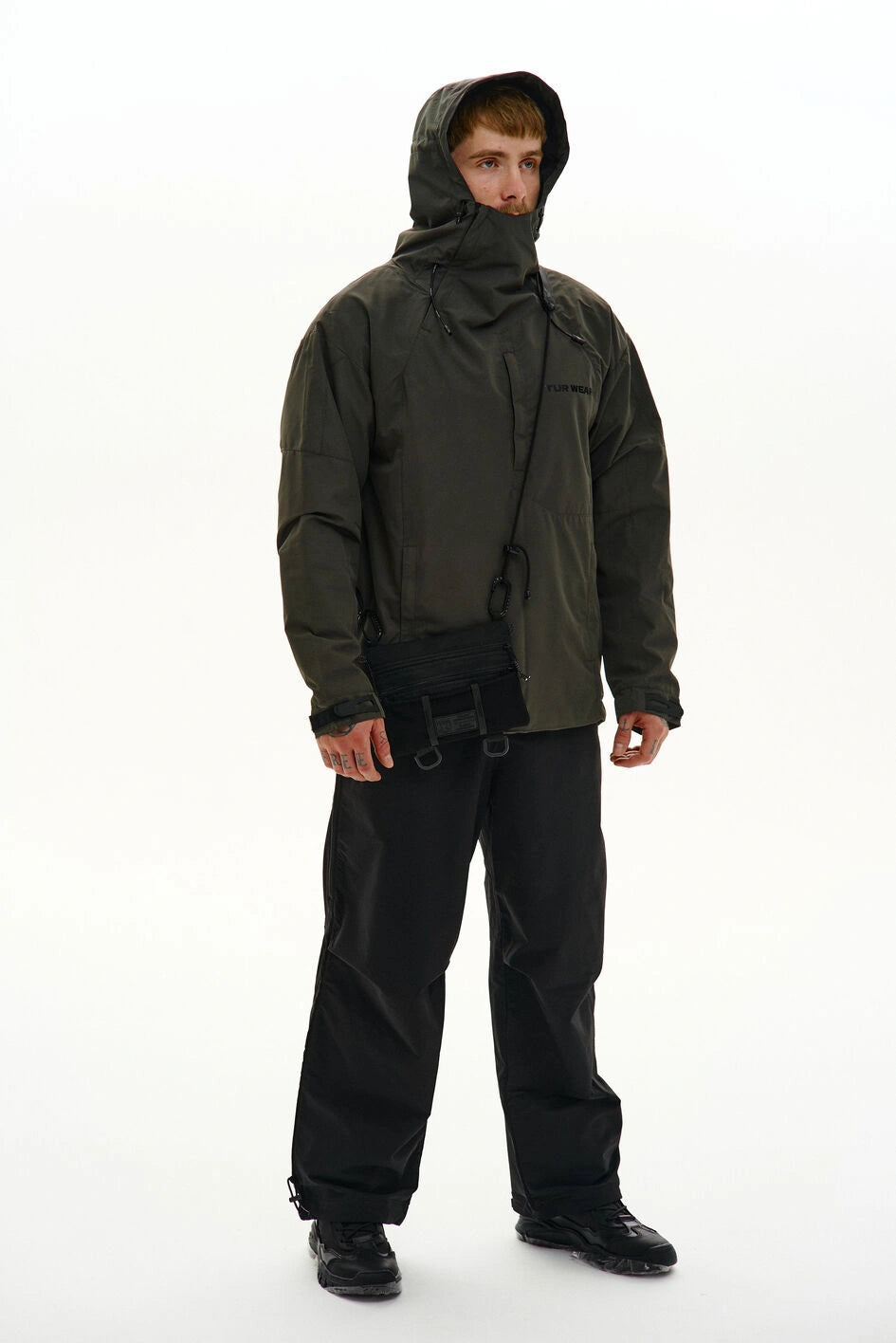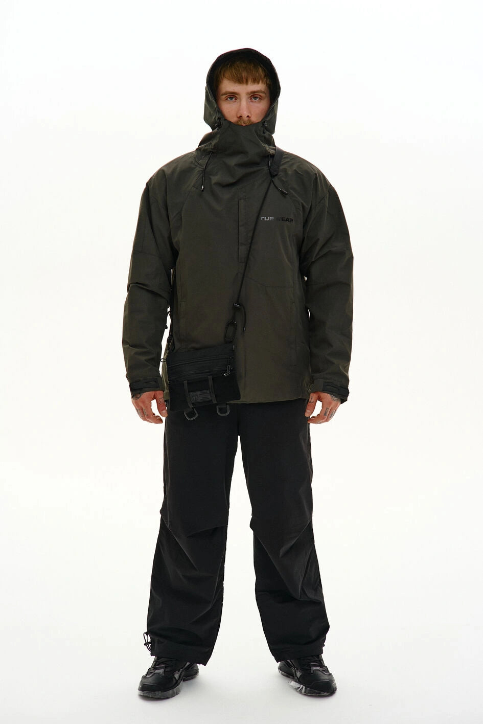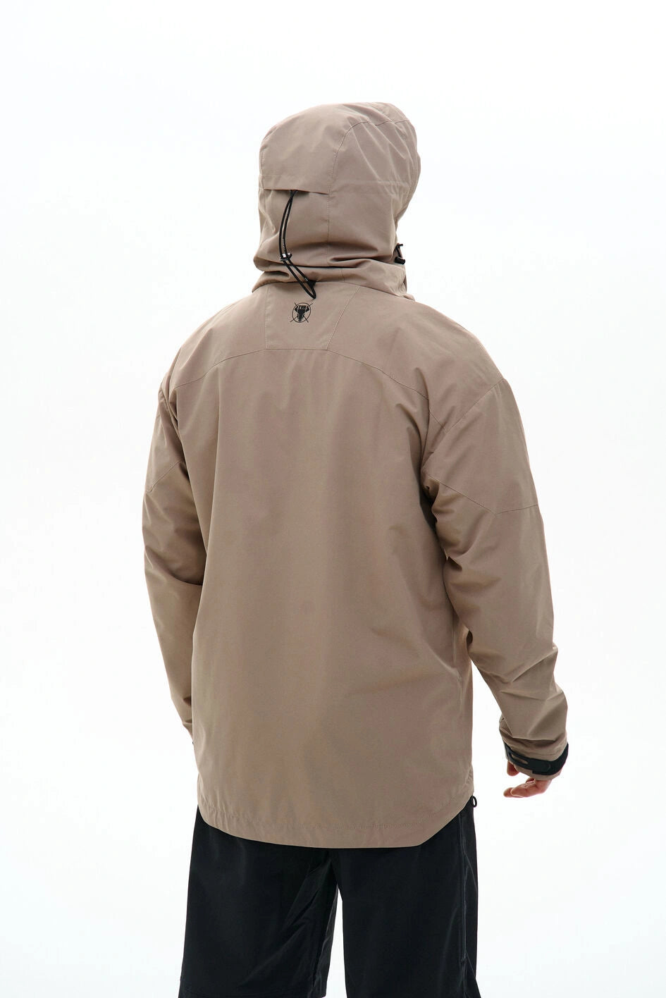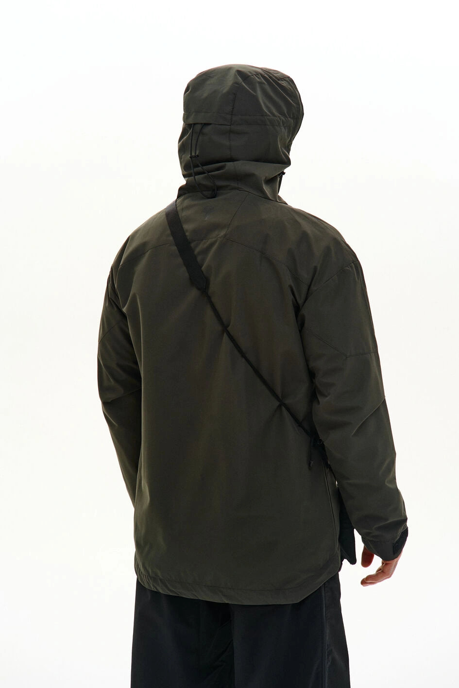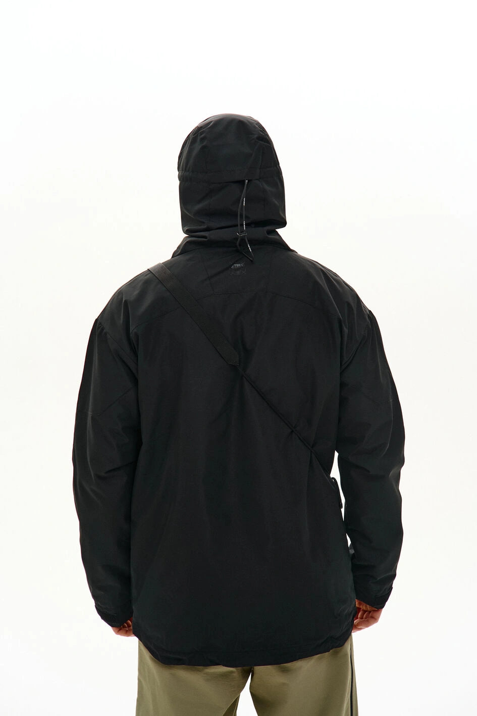 Anorak mit asymmetrischem Schnitt aus einem membranbeschichteten Regenjackenstoff, Futter aus leichtem, angenehm zu tragendem Material. Manschetten mit Klettverschluss und komplexer anatomischer Schnitt der Ärmel, Kapuze mit Schirm. Der asymmetrische Reißverschluss befindet sich auf der rechten Seite. Verfügt über eine Brusttasche und eine Kängurutasche, beide mit Reißverschluss verschließbar. Die Kapuze ist vertikal und horizontal verstellbar. Im unteren Bereich kann die Weite mit einem elastischen Kordelzug reguliert werden.