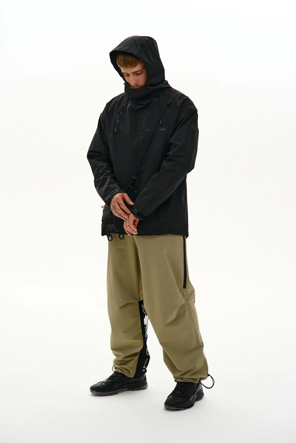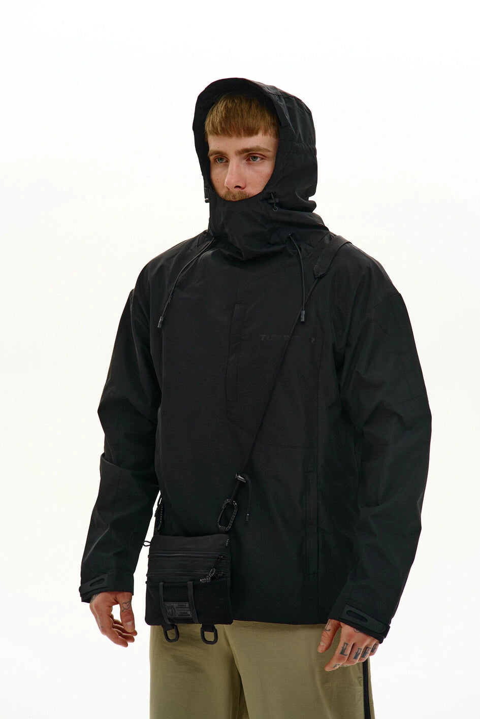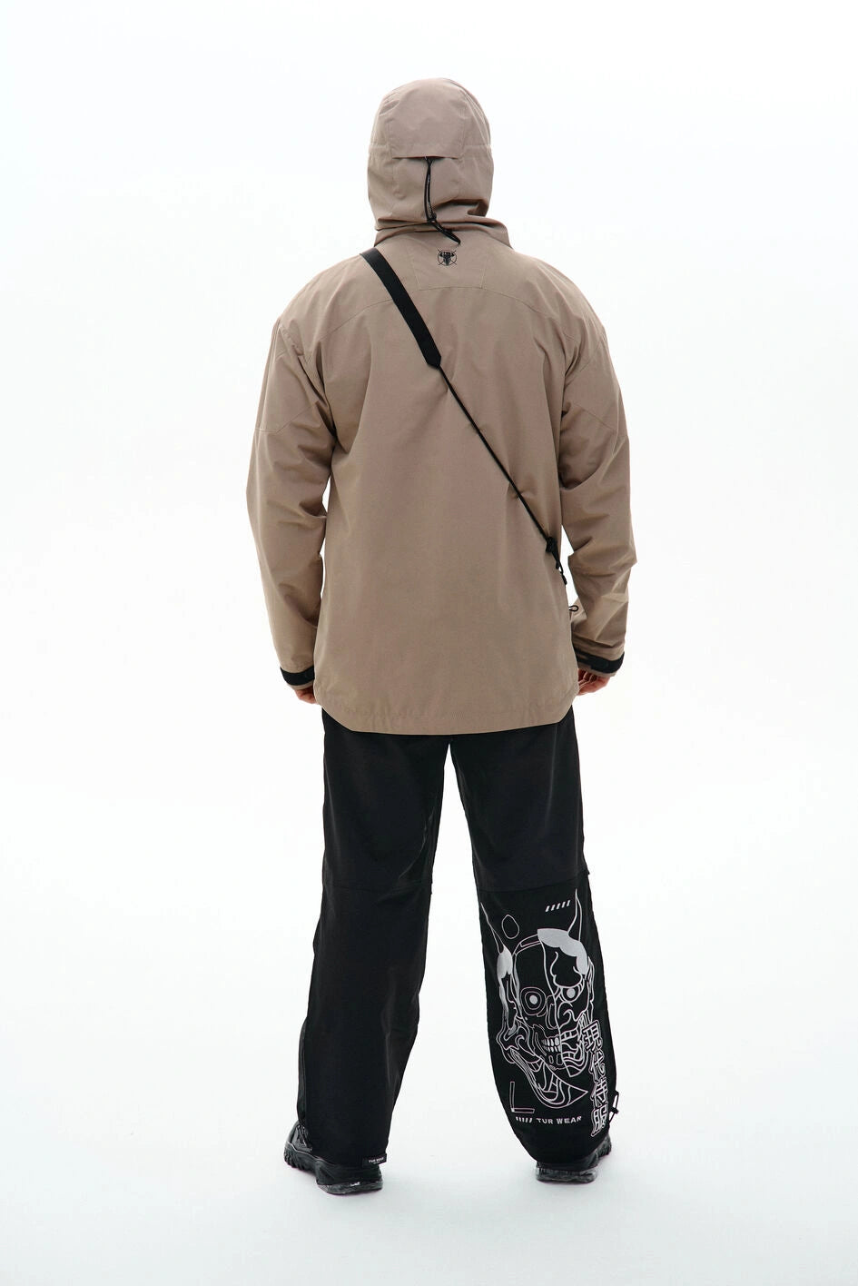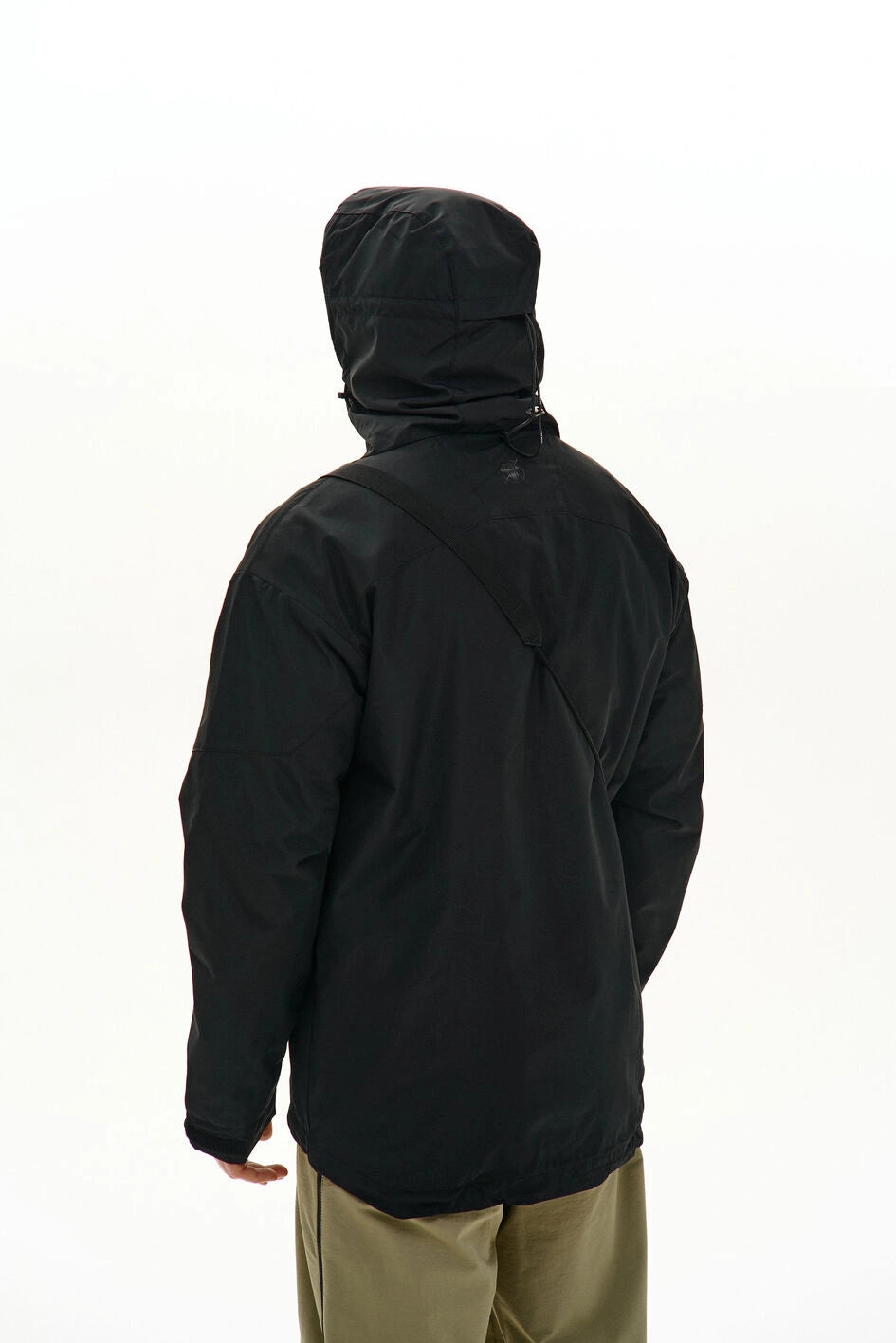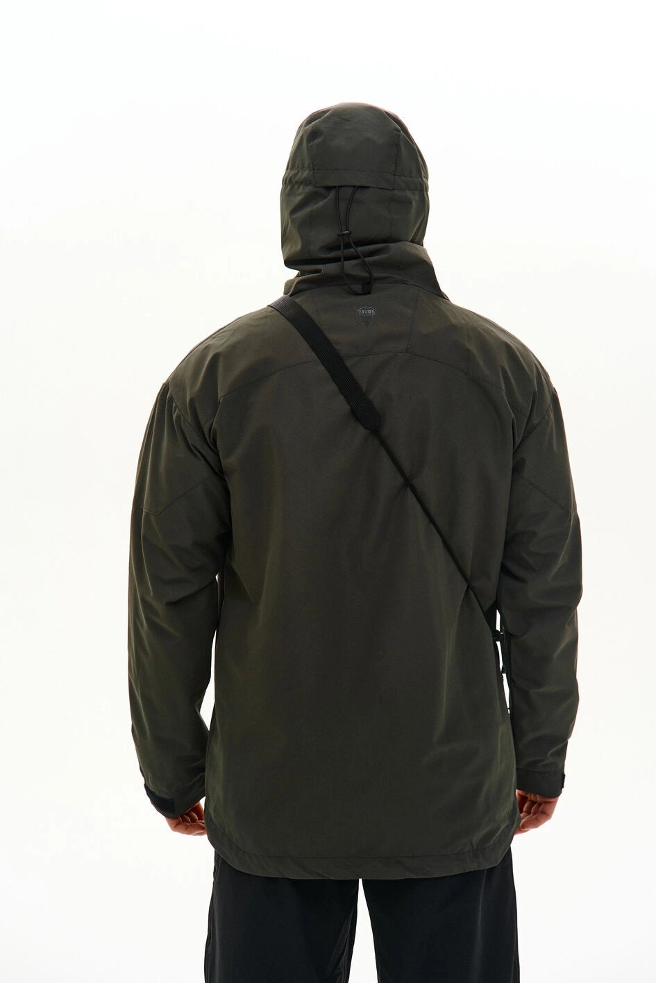 Anorak mit asymmetrischem Schnitt aus einem membranbeschichteten Regenjackenstoff, Futter aus leichtem, angenehm zu tragendem Material. Manschetten mit Klettverschluss und komplexer anatomischer Schnitt der Ärmel, Kapuze mit Schirm. Der asymmetrische Reißverschluss befindet sich auf der rechten Seite. Verfügt über eine Brusttasche und eine Kängurutasche, beide mit Reißverschluss verschließbar. Die Kapuze ist vertikal und horizontal verstellbar. Im unteren Bereich kann die Weite mit einem elastischen Kordelzug reguliert werden.