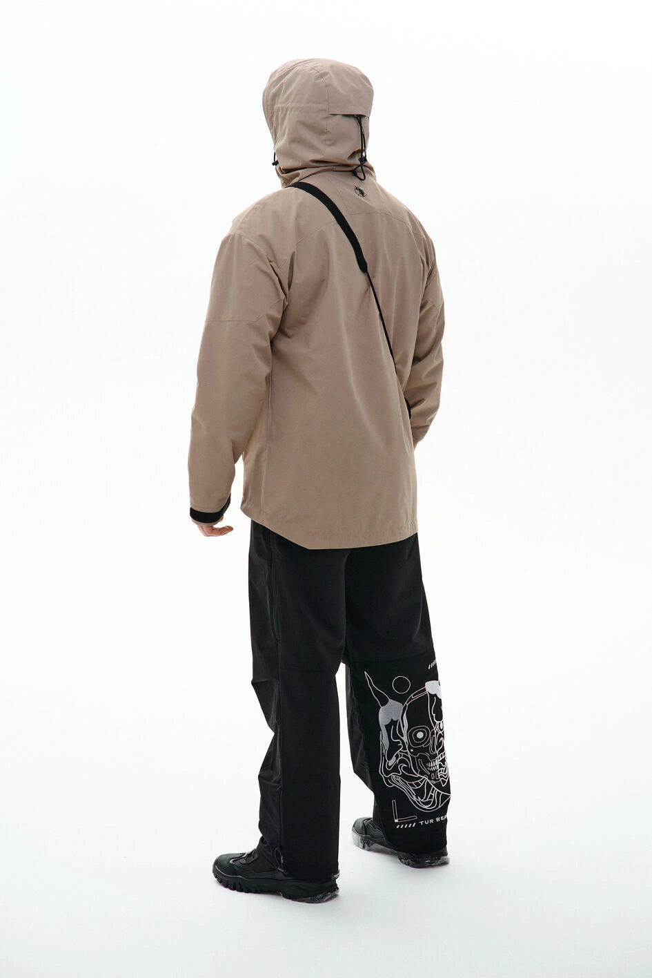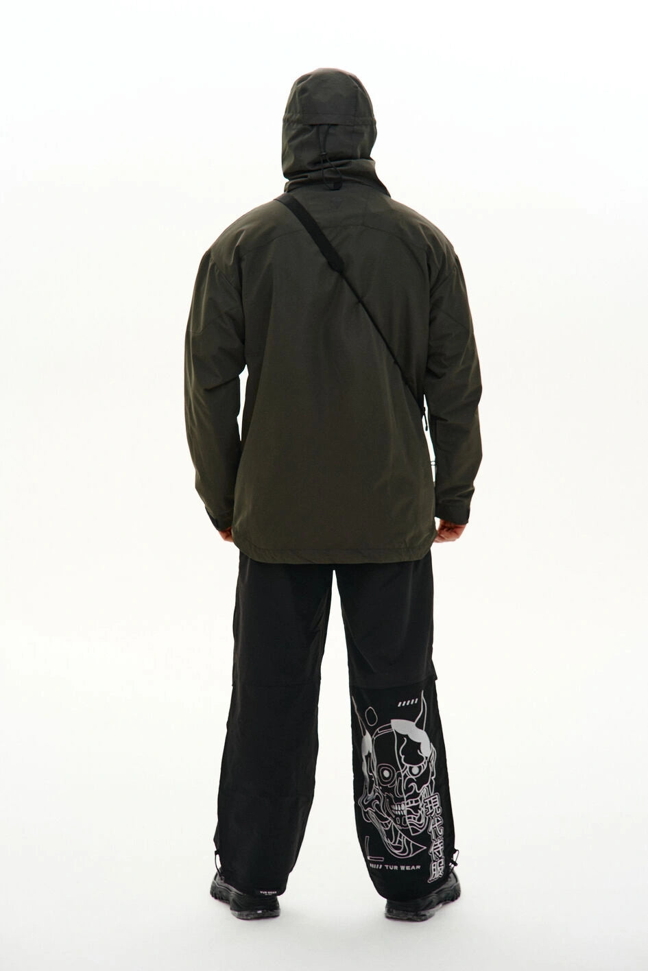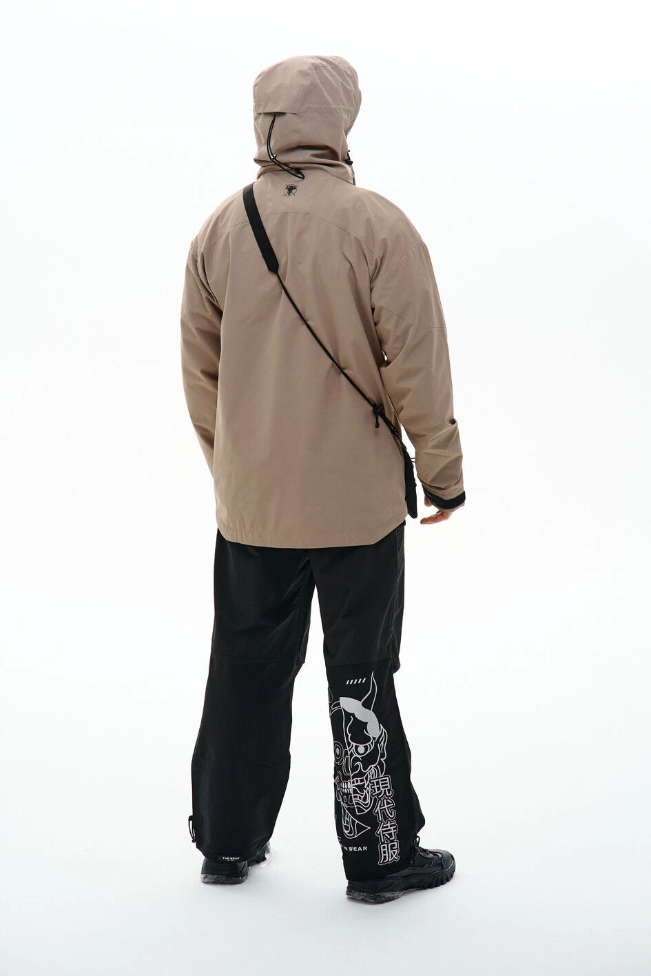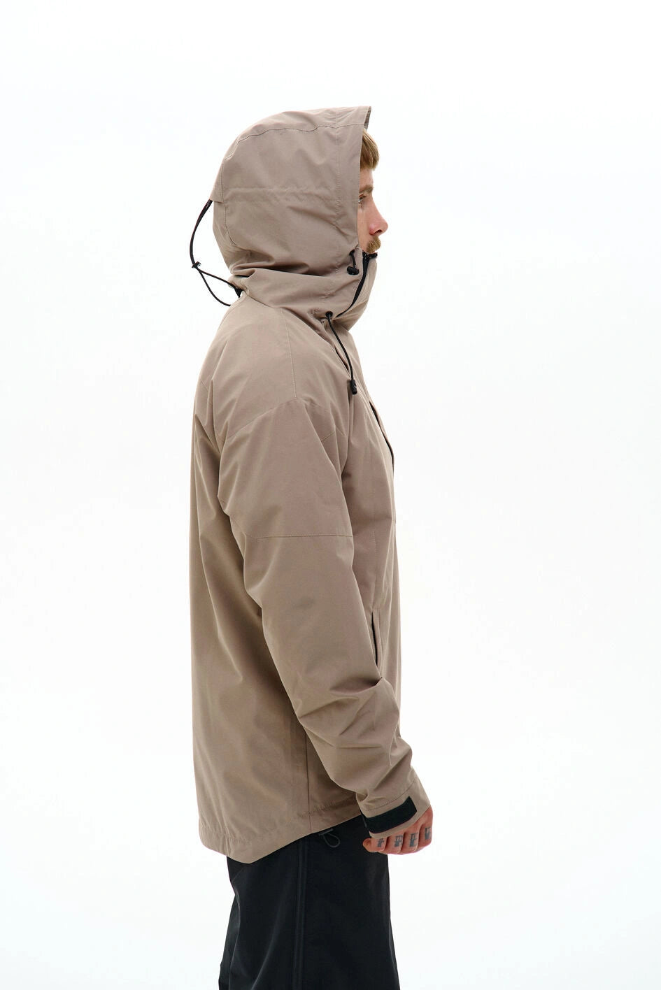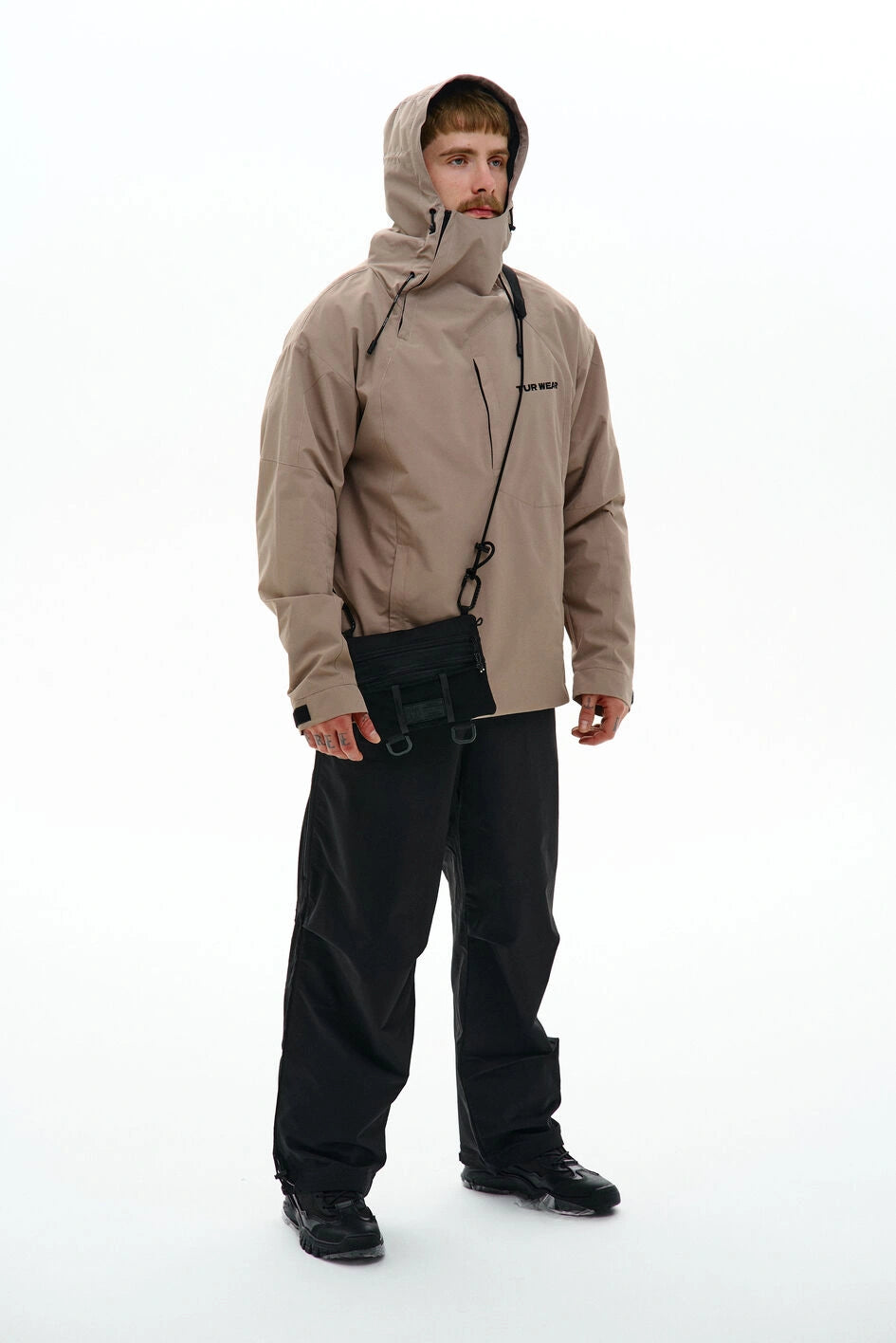 Anorak mit asymmetrischem Schnitt aus einem membranbeschichteten Regenjackenstoff, Futter aus leichtem, angenehm zu tragendem Material. Manschetten mit Klettverschluss und komplexer anatomischer Schnitt der Ärmel, Kapuze mit Schirm. Der asymmetrische Reißverschluss befindet sich auf der rechten Seite. Verfügt über eine Brusttasche und eine Kängurutasche, beide mit Reißverschluss verschließbar. Die Kapuze ist vertikal und horizontal verstellbar. Im unteren Bereich kann die Weite mit einem elastischen Kordelzug reguliert werden.