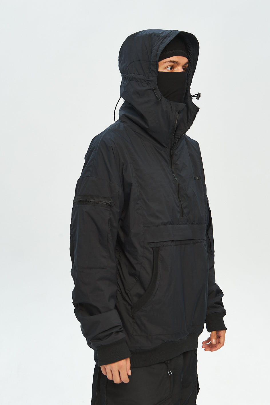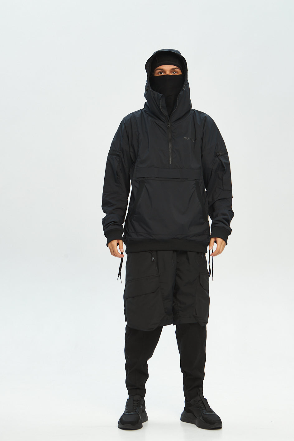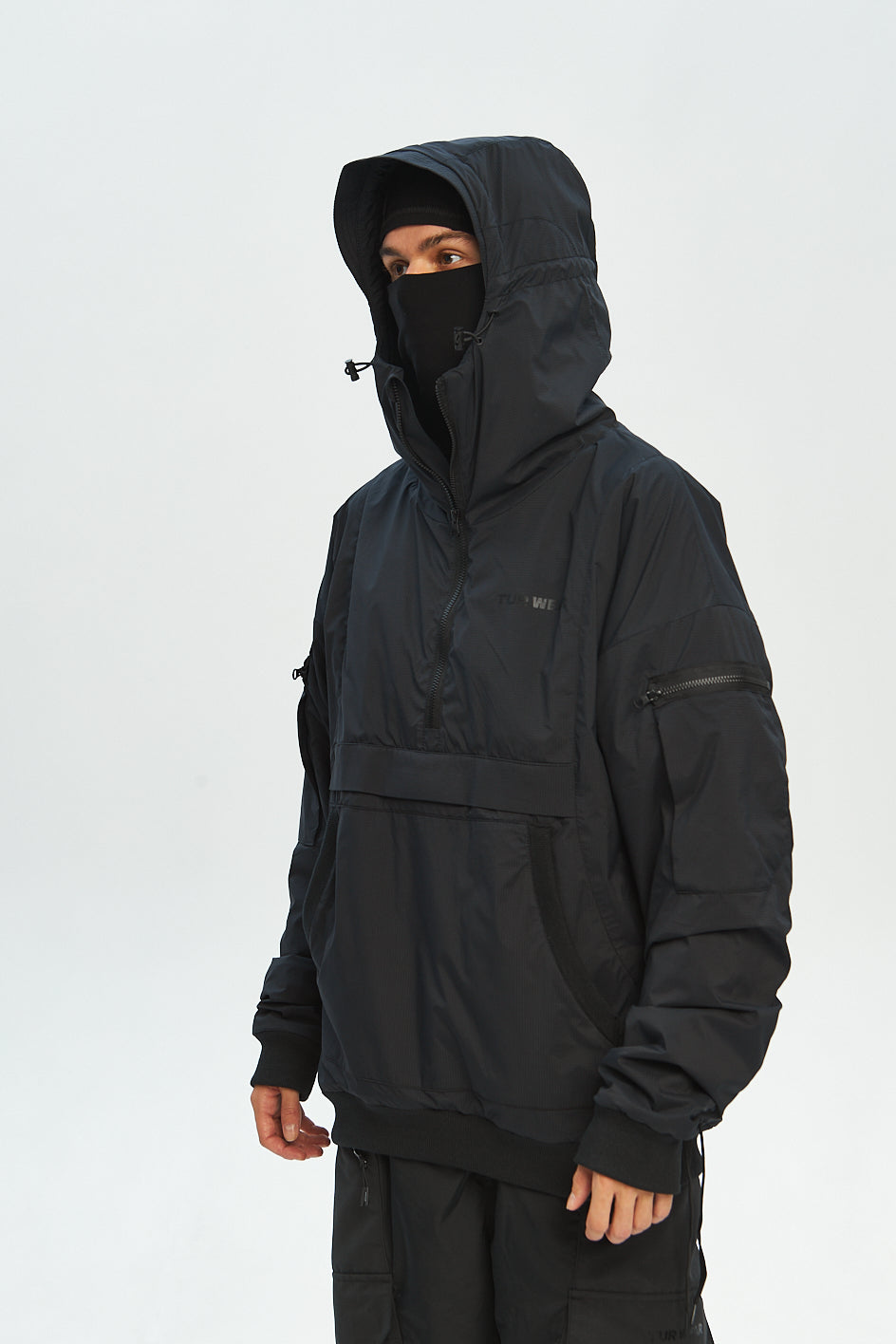 Anorak mit tiefem Kapuzenansatz und Verstellmöglichkeiten in horizontaler und vertikaler Richtung. Auf der Brust eine aufgesetzte Tasche mit Reißverschluss. An beiden Ärmeln befinden sich kleine aufgesetzte Taschen. Hinten sind Belüftungsöffnungen angebracht. An den Seiten des Anoraks befinden sich Kordelzüge, der Saum und die Ärmel sind mit elastischen Bündchen versehen. Schwarzer „Tur wear“-Print auf dem Produkt.