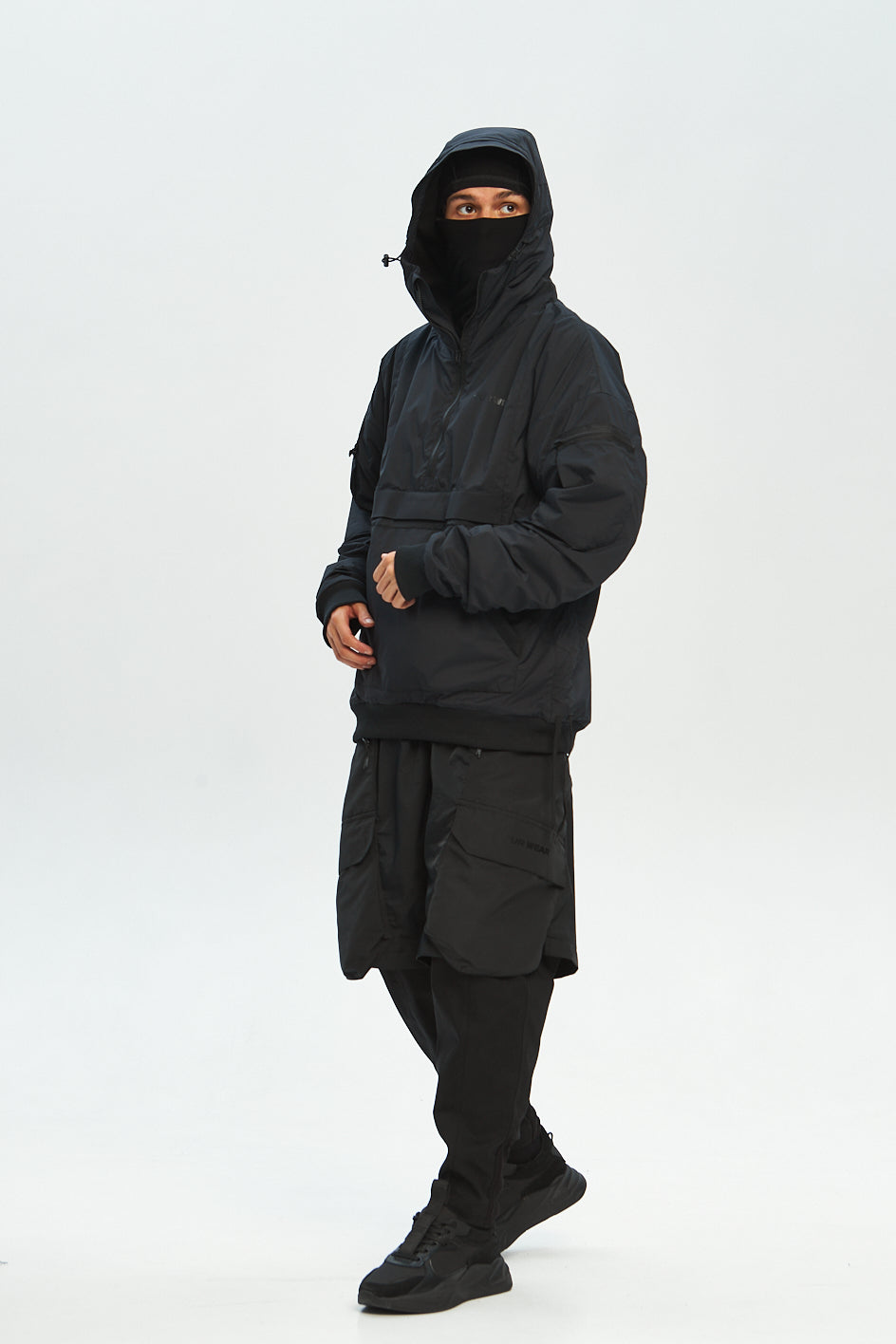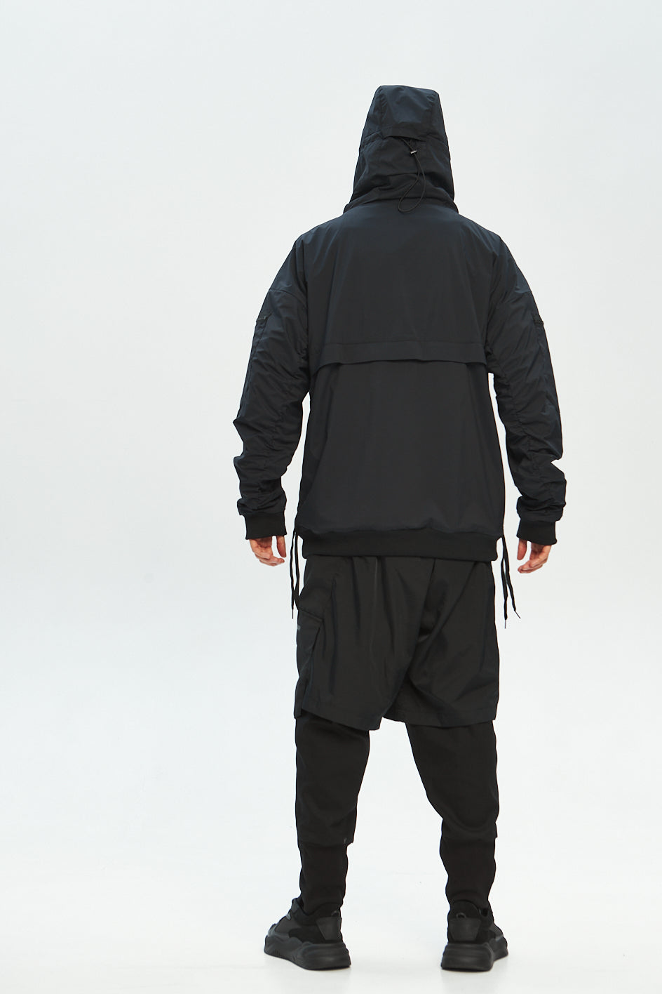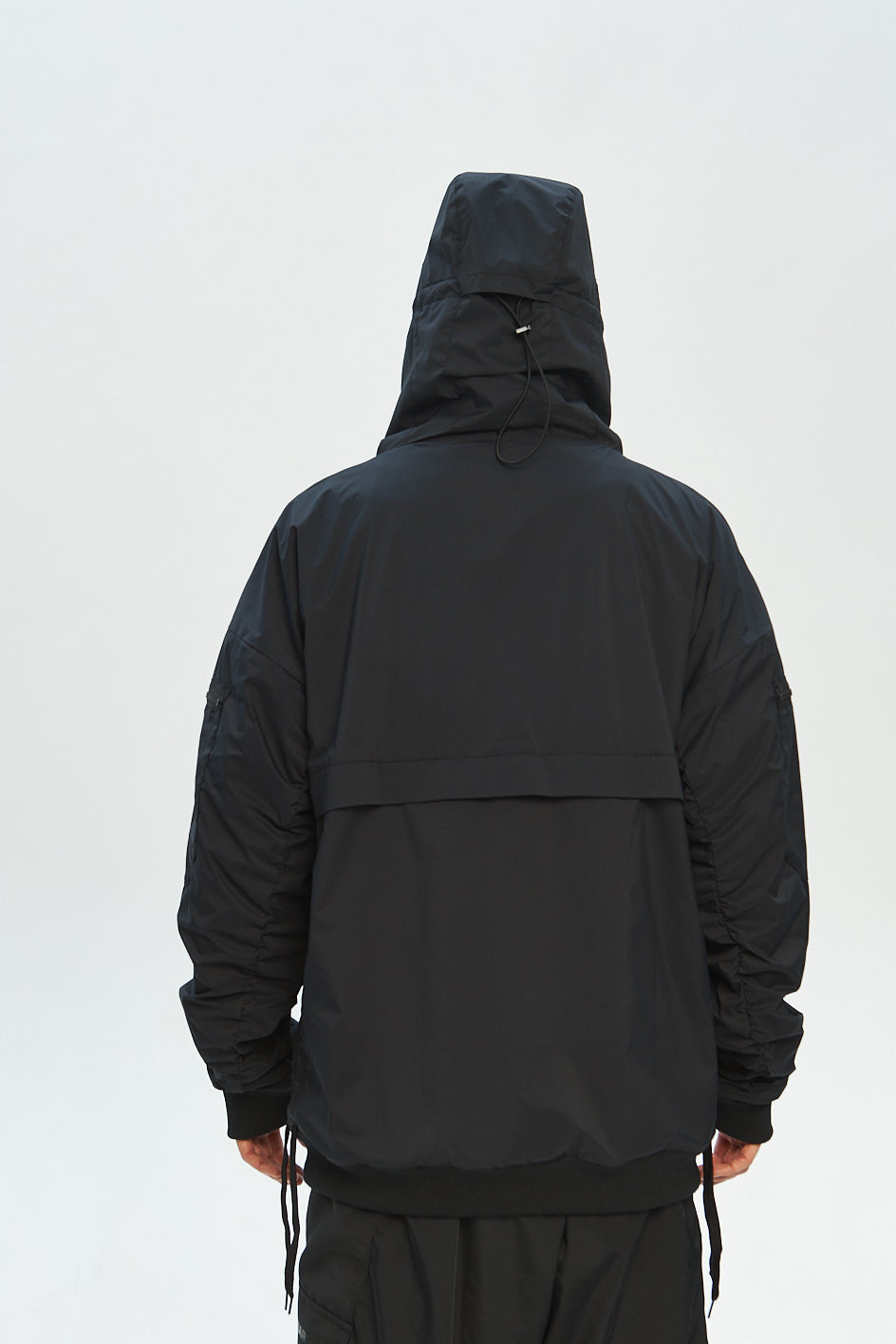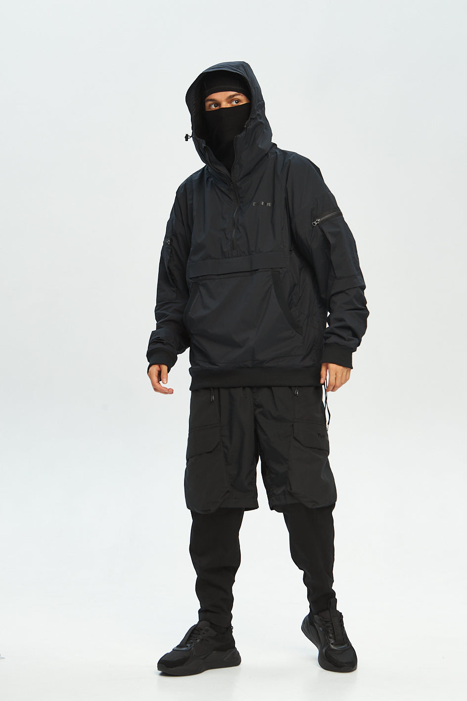 Anorak mit tiefem Kapuzenansatz und Verstellmöglichkeiten in horizontaler und vertikaler Richtung. Auf der Brust eine aufgesetzte Tasche mit Reißverschluss. An beiden Ärmeln befinden sich kleine aufgesetzte Taschen. Hinten sind Belüftungsöffnungen angebracht. An den Seiten des Anoraks befinden sich Kordelzüge, der Saum und die Ärmel sind mit elastischen Bündchen versehen. Schwarzer „Tur wear“-Print auf dem Produkt.
