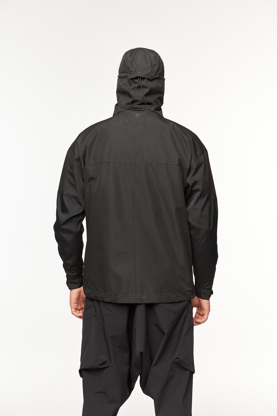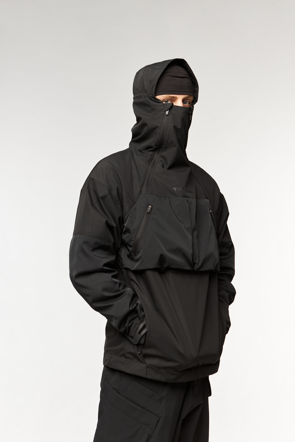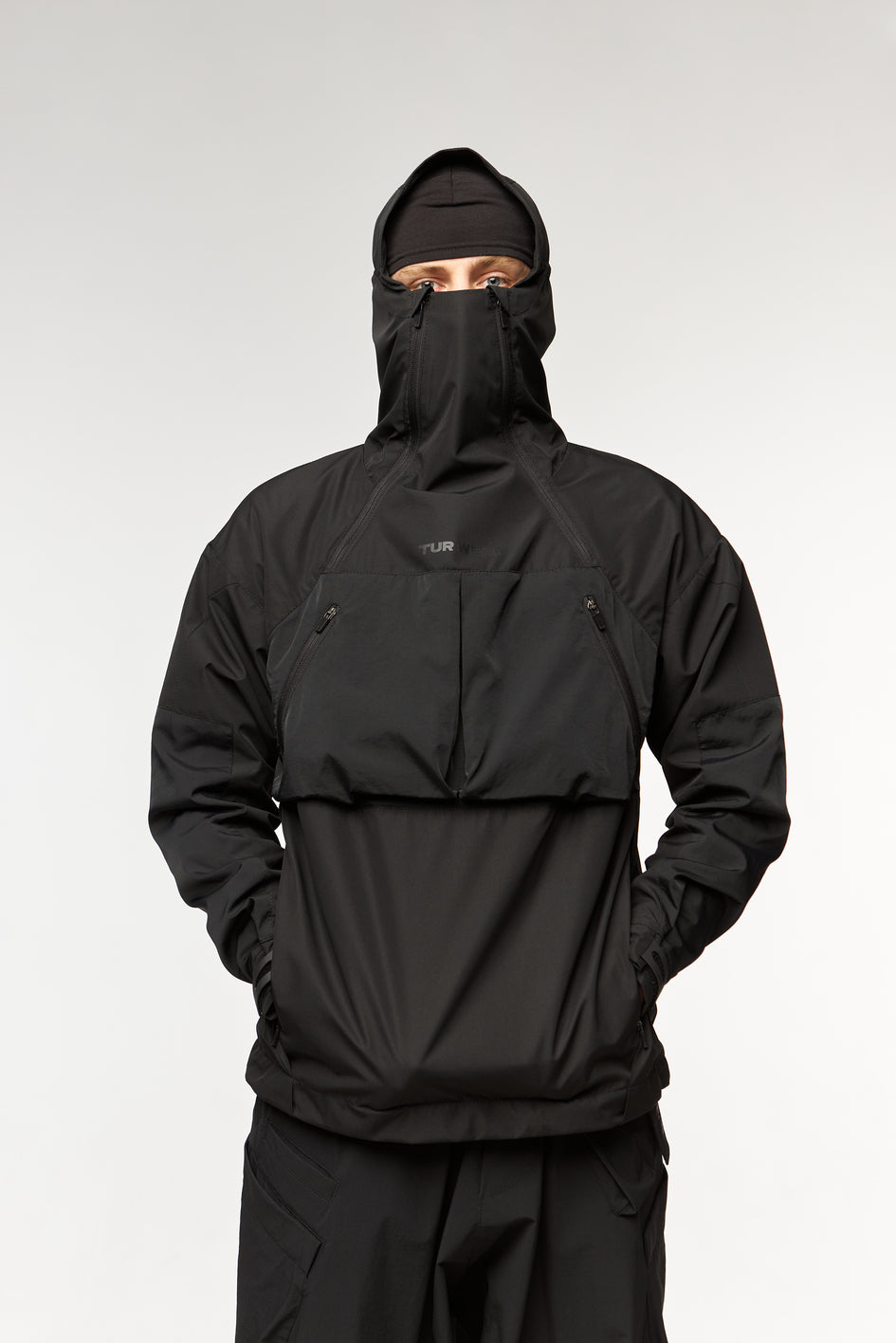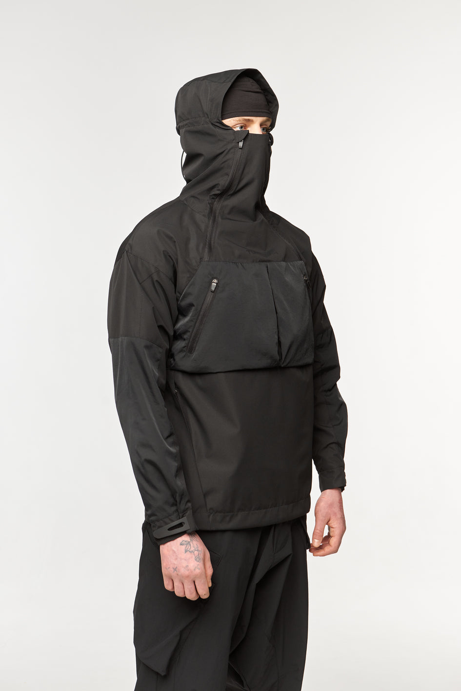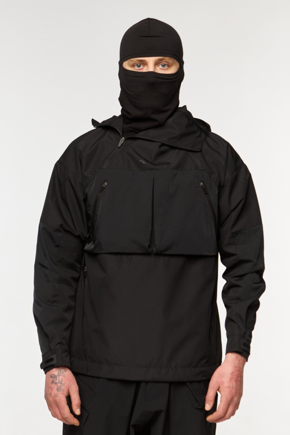 Anorak-Jacke mit verlängertem Schnitt und hohem Stehkragen, ausgestattet mit zwei Reißverschlüssen für höheren Tragekomfort. Sie hat eine bequeme, tiefe Kapuze mit horizontaler Verstellmöglichkeit. Auf der Brust befinden sich zwei aufgesetzte Taschen mit Reißverschluss, gefertigt aus strapazierfähigem Ripstop-Material. Im unteren Teil der Jacke sind zwei Taschen unter der Leiste angebracht, ebenfalls mit Reißverschlüssen. Der Saum der Jacke verfügt über einen elastischen Kordelzug mit Stoppern, der eine Anpassung der Weite ermöglicht. Die Ärmel sind mit Gummilaschen und Klettverschlüssen zur Regulierung versehen und zusätzlich mit erhabenen Details sowie Ripstop-Einsätzen ausgestattet. Die Jacke ist aus Ripstop-Material mit Membran gefertigt und besitzt ein beschichtetes Futter, das wirksamen Schutz vor Wind bietet.