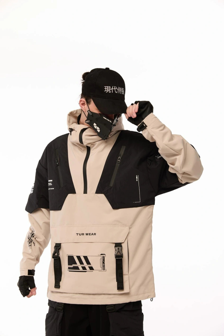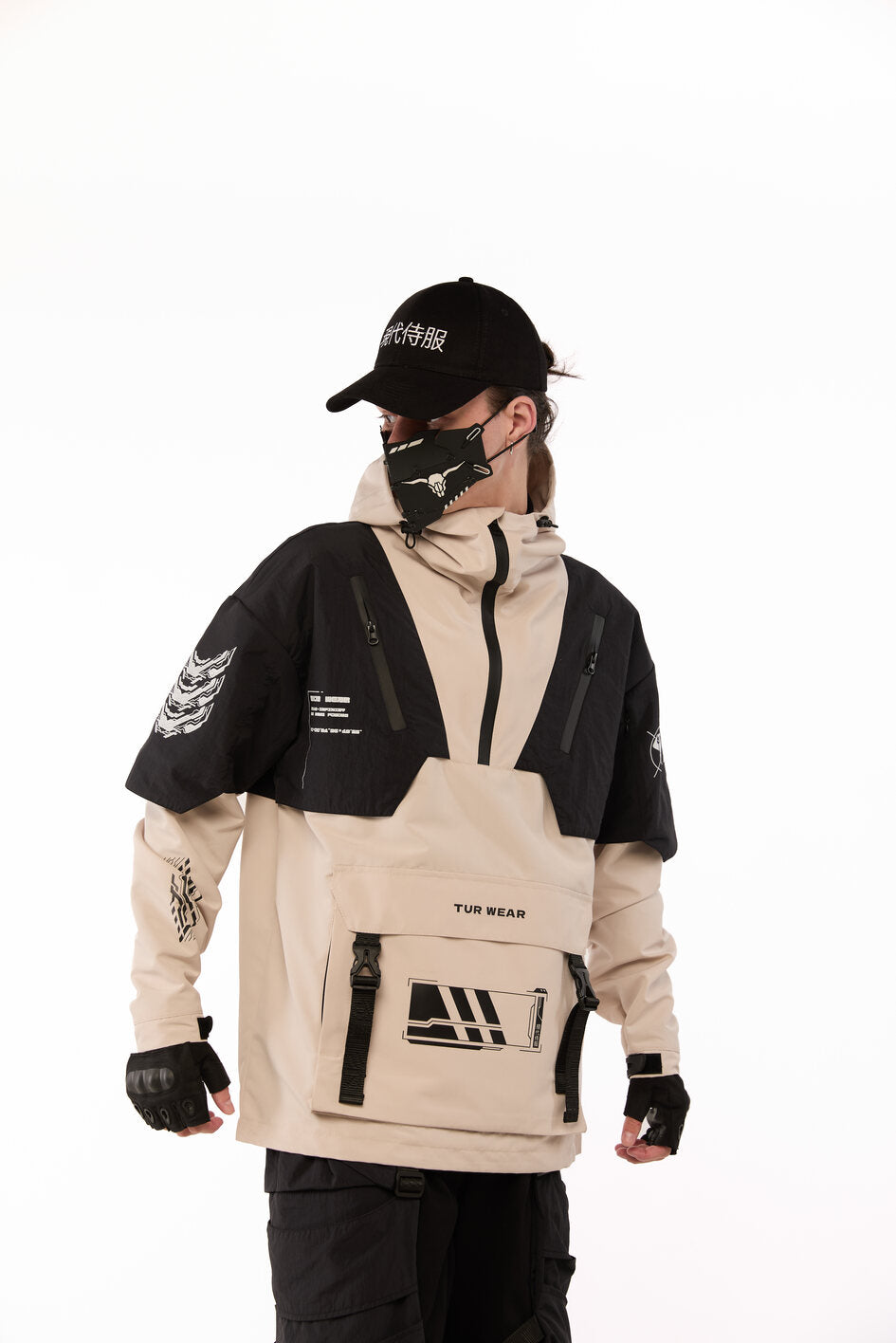 Anorak mit tiefem Kapuzenbereich und Regulierung sowohl horizontal als auch vertikal. Auf der Brust befinden sich zwei aufgenähte Taschen mit Reißverschluss. Auf der Brust befindet sich eine aufgenähte Tasche mit Klappe, gesichert mit Fastex-Schnallen. Die Tasche ist doppelt, mit zusätzlichem seitlichem Eingang durch Reißverschlüsse. Auf beiden Ärmeln befinden sich Patches, wobei sich in der linken ein Reißverschlussfach verbirgt.