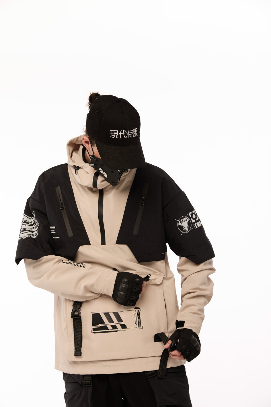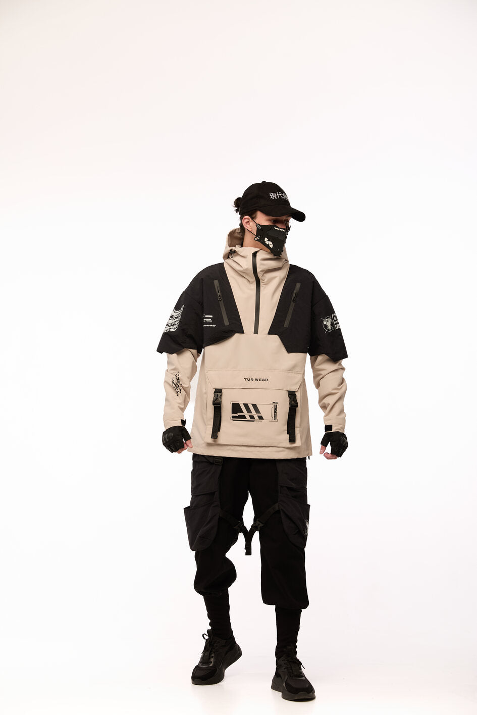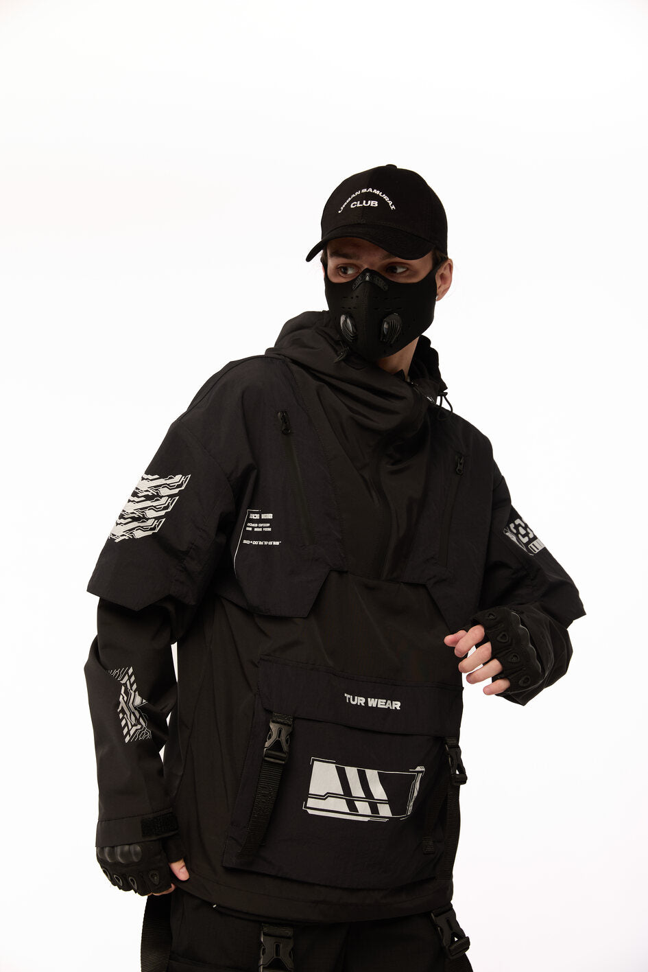 Drucke befinden sich auf den Ärmeln, dem Patch auf der linken Seite, den Brusttaschen, der Tasche mit Klappe und auf dem Rücken. Der untere Teil des Produkts ist mit einer Gummizugregulierung mit Stopper ausgestattet. Die Ärmel sind mit Klettverschlussbündchen abgeschlossen.