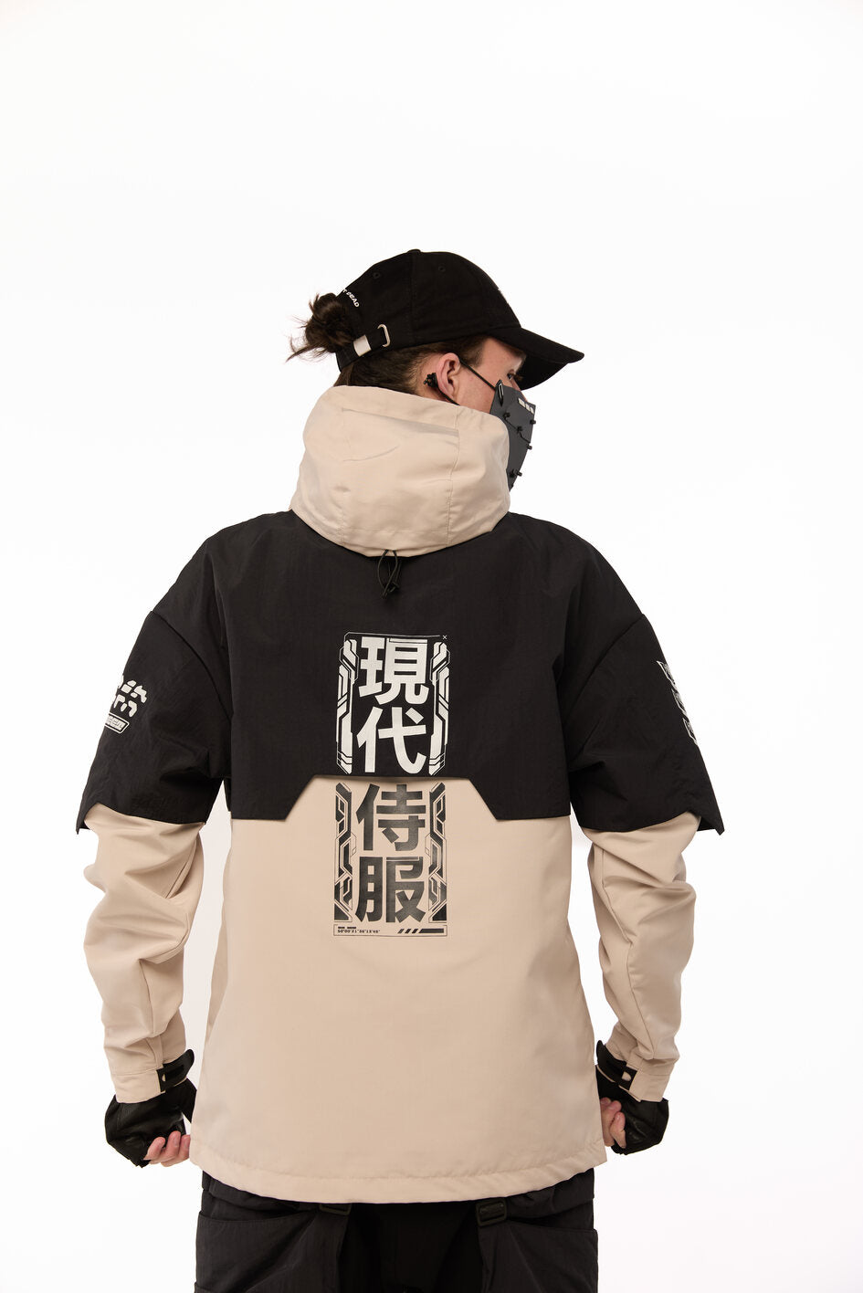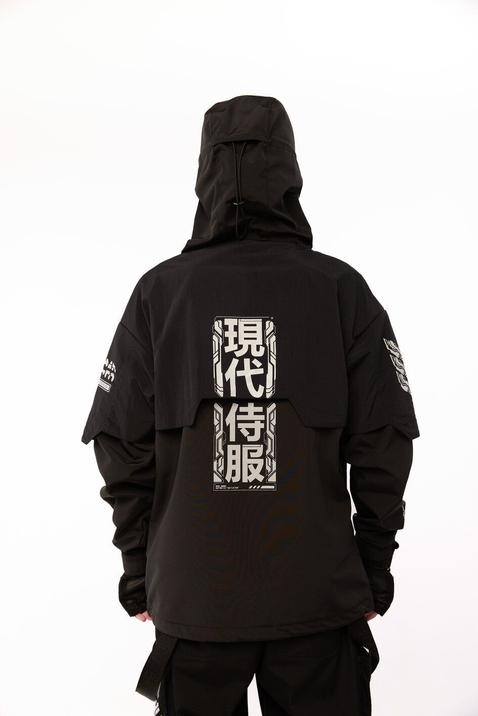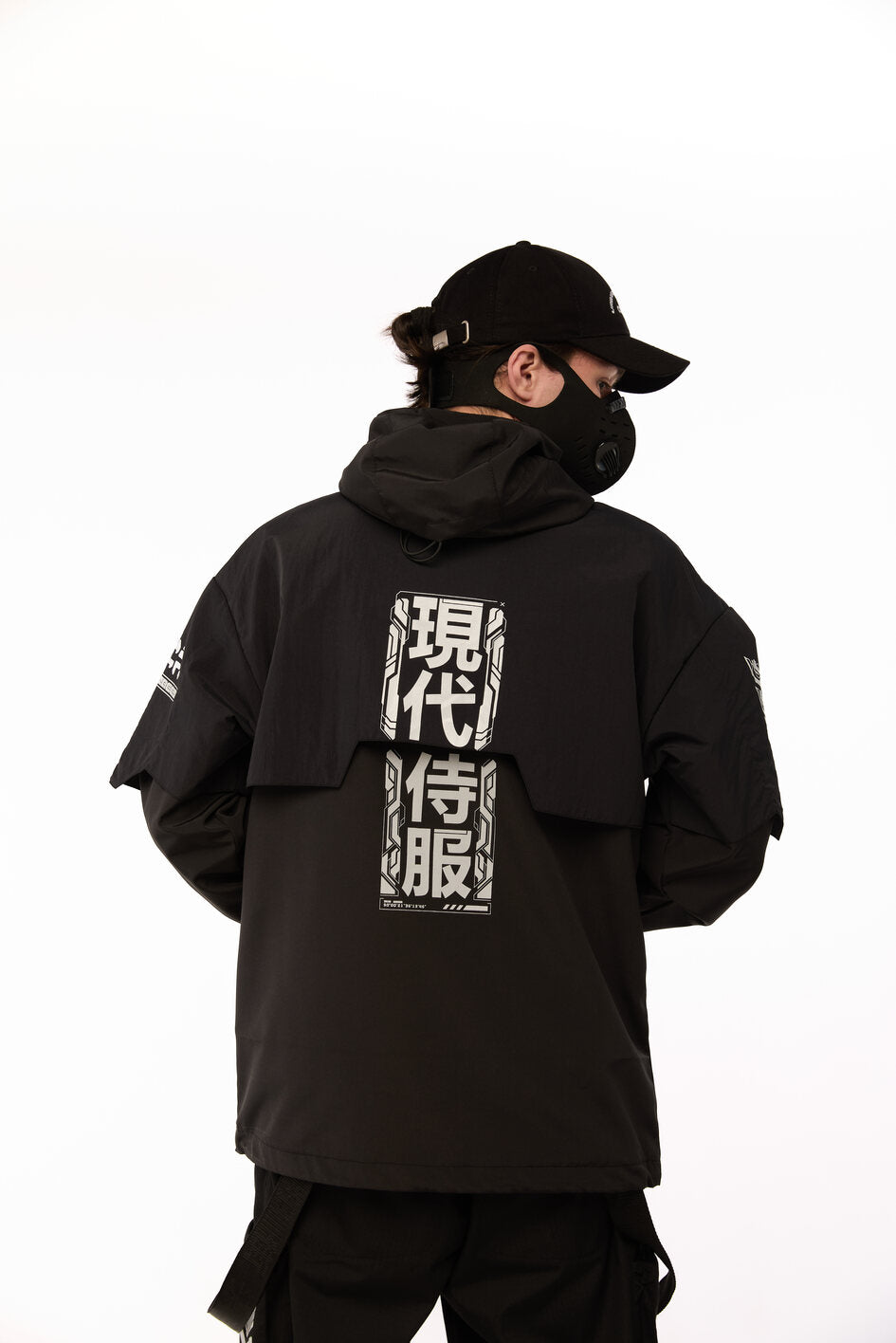 Drucke befinden sich auf den Ärmeln, dem Patch auf der linken Seite, den Brusttaschen, der Tasche mit Klappe und auf dem Rücken. Der untere Teil des Produkts ist mit einer Gummizugregulierung mit Stopper ausgestattet. Die Ärmel sind mit Klettverschlussbündchen abgeschlossen.