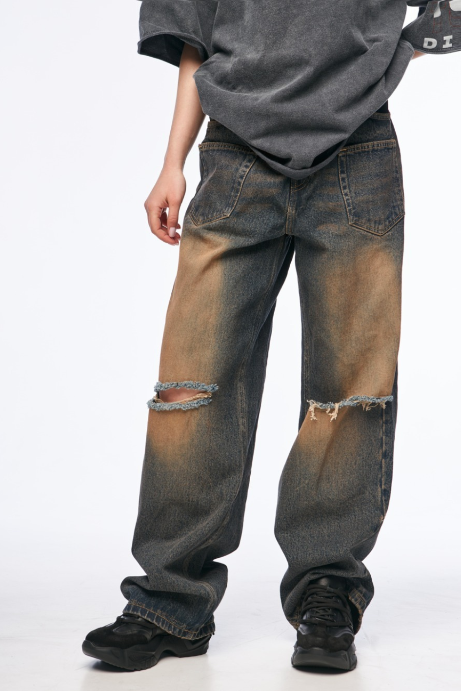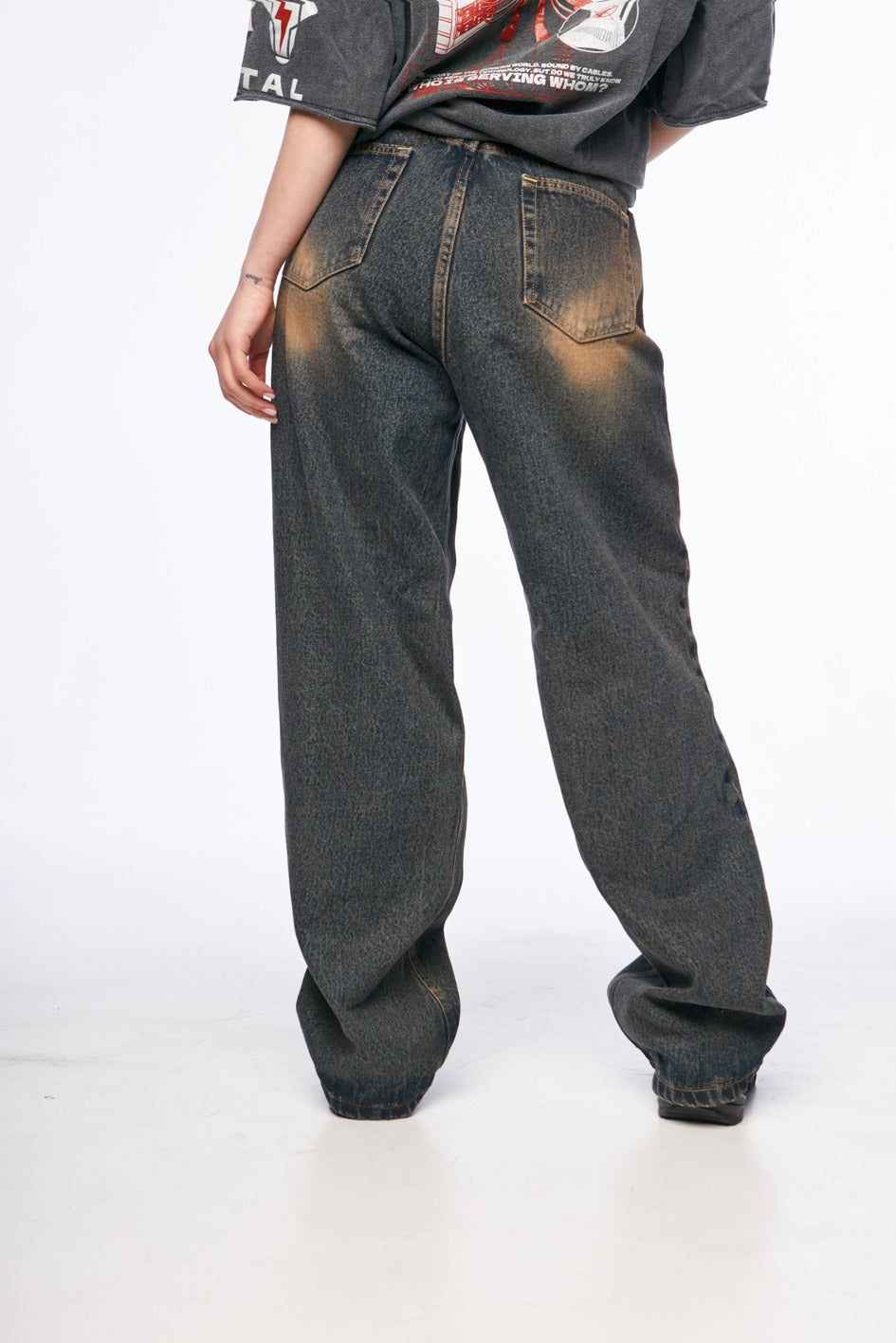 Gekochte Baggy-Jeans mit Abnutzungsspuren an den Hosenbeinen. Verschluss vorne mit Reißverschluss und Knopf. Verfügen über sieben Taschen. Unisex-Modell.