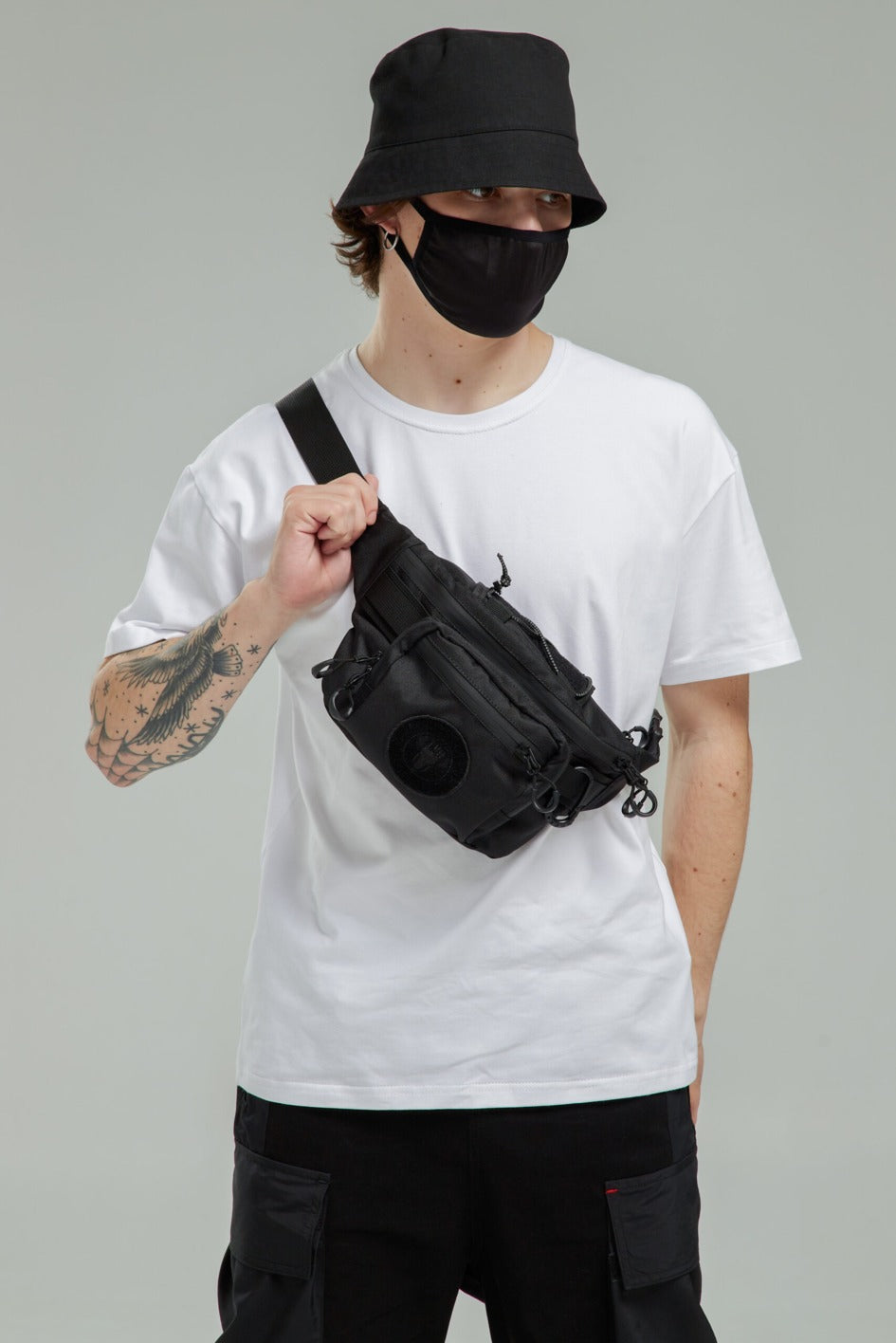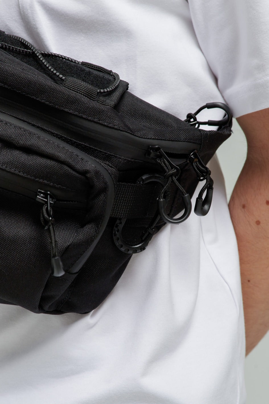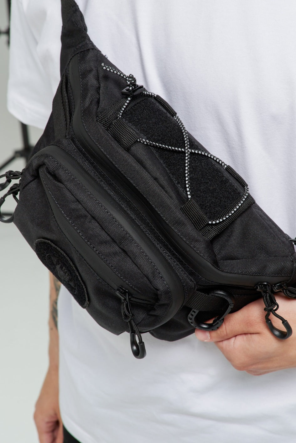 Bauchtasche mit großem Hauptfach und zwei Innentaschen. Außen drei Taschen in verschiedenen Größen. Oben an der Tasche ein reflektierendes Band mit Metallverschluss als Dekoration. An den Seiten Gurte und ein Kunststoffkarabiner, an dem verschiedene Gegenstände befestigt werden können. Auf der Vorderseite ein Marken-Patch.