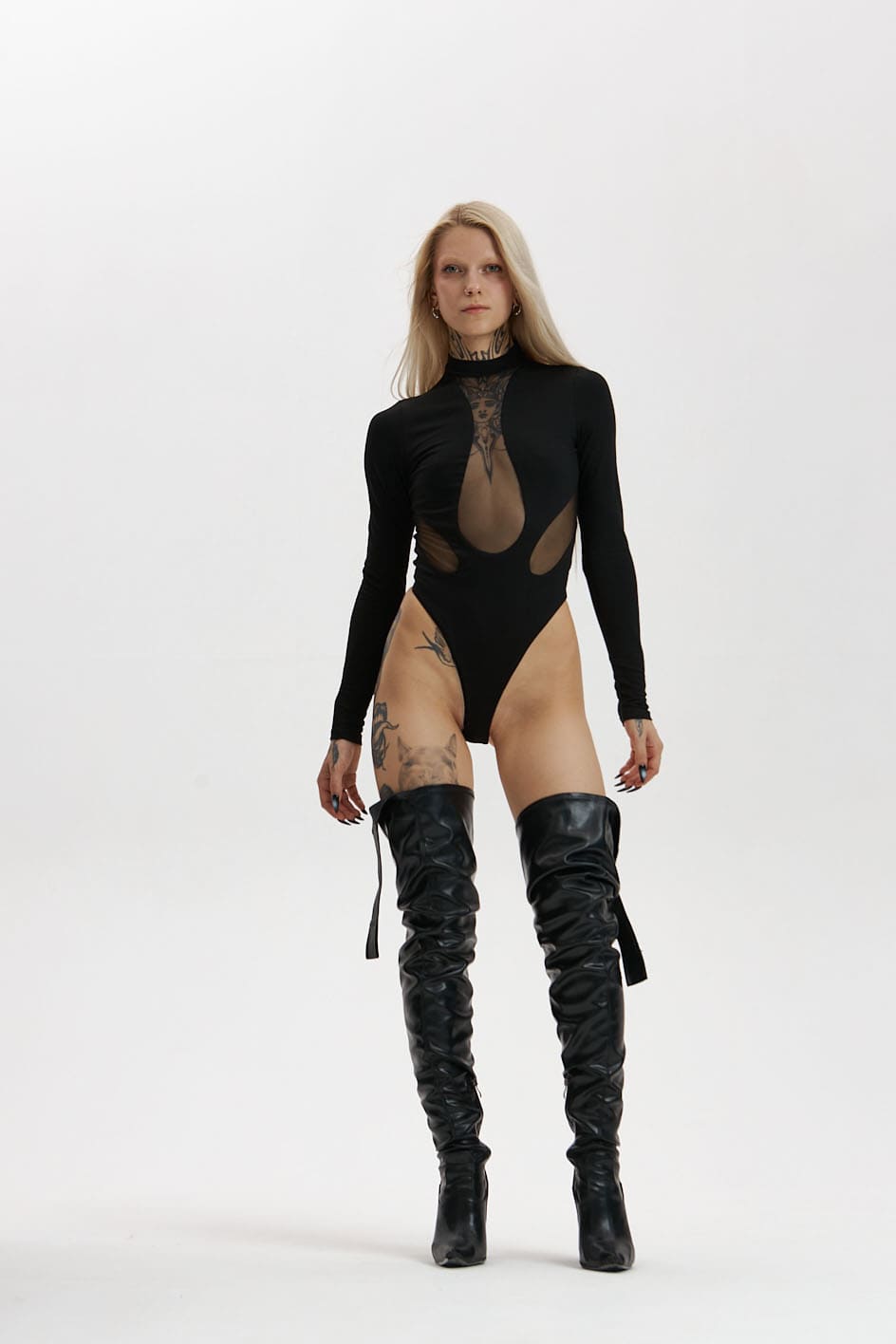Body mit figurbetonten Mesh-Einsätzen. Mit hohem Kragen. Unten mit Druckknöpfen zu schließen. Auf dem linken Ärmel schwarzer Logo-Print „Tur Wear“.
