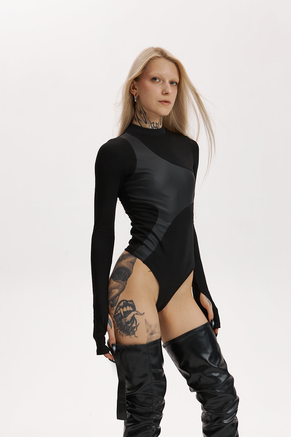 Body mit figurbetonten Einsätzen aus Kunstleder. Mit hohem Kragen. Frontverschluss mit Knöpfen. Lange Ärmel mit Daumenlöchern. Auf dem linken Ärmel schwarzer „Tur Wear“-Print.