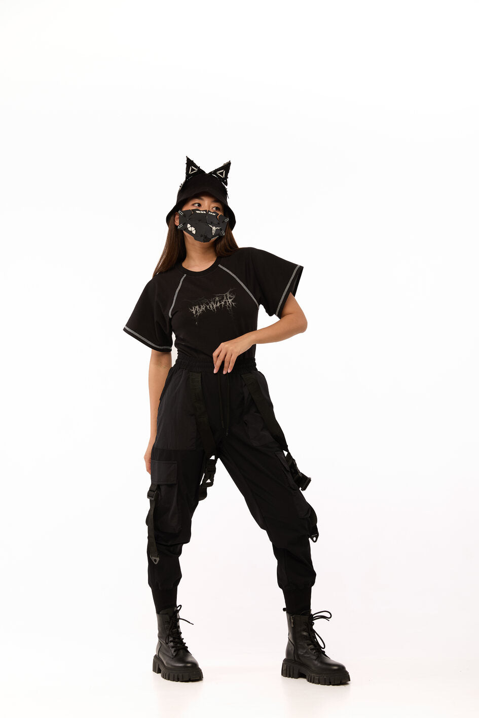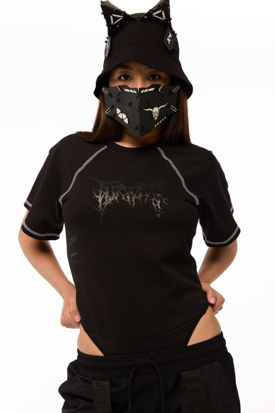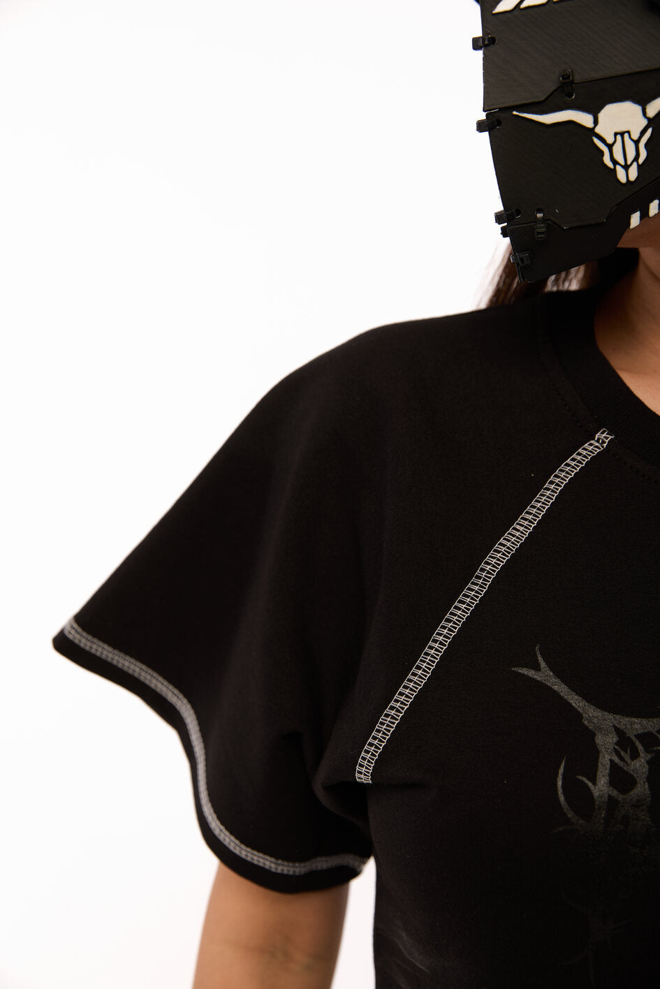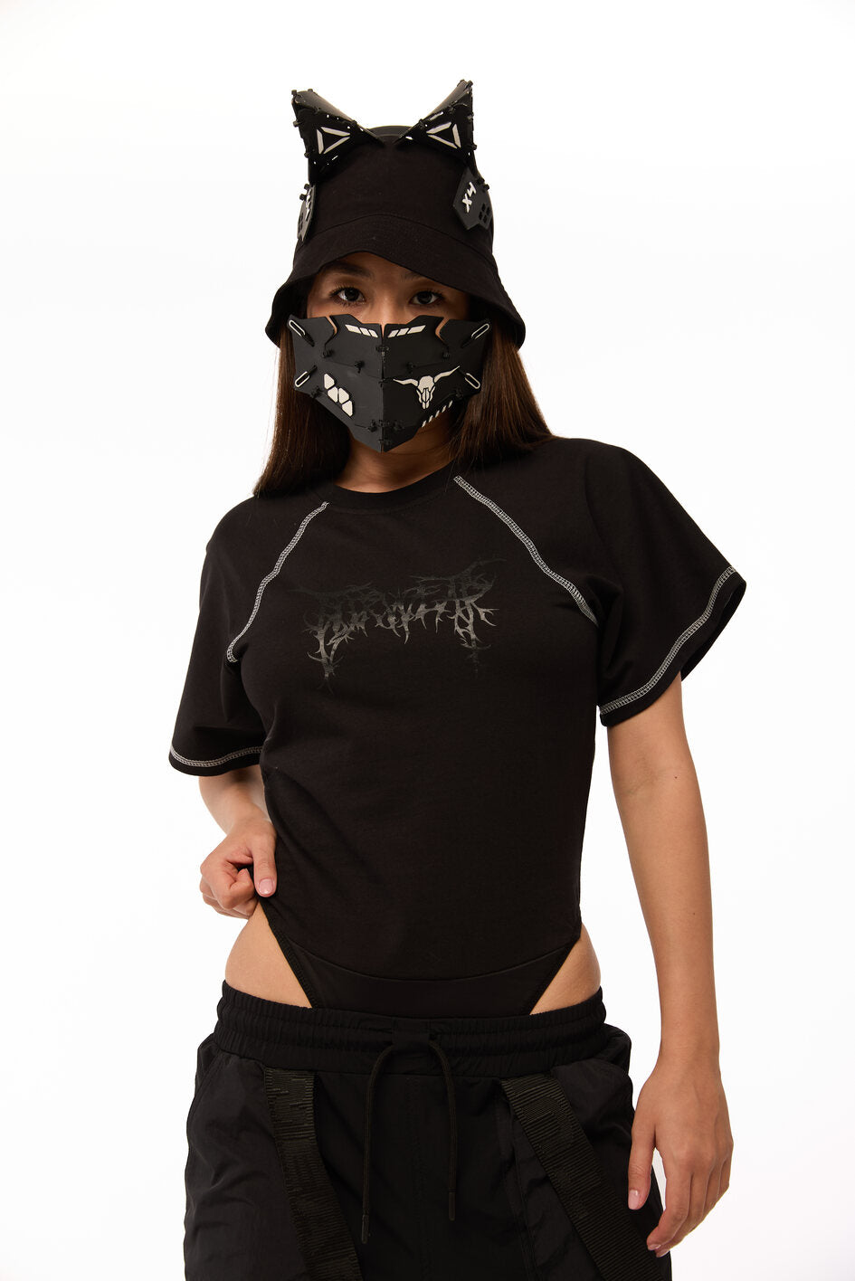 Tailliertes Body mit weiten Ärmeln. Als Dekoration Nähte mit kontrastierendem weißen Steppstich. Unterteil des Bodys aus dünnem, elastischem Biflex-Material. Schwarzer Aufdruck auf der Brust. Druckknopfverschluss am unteren Teil.