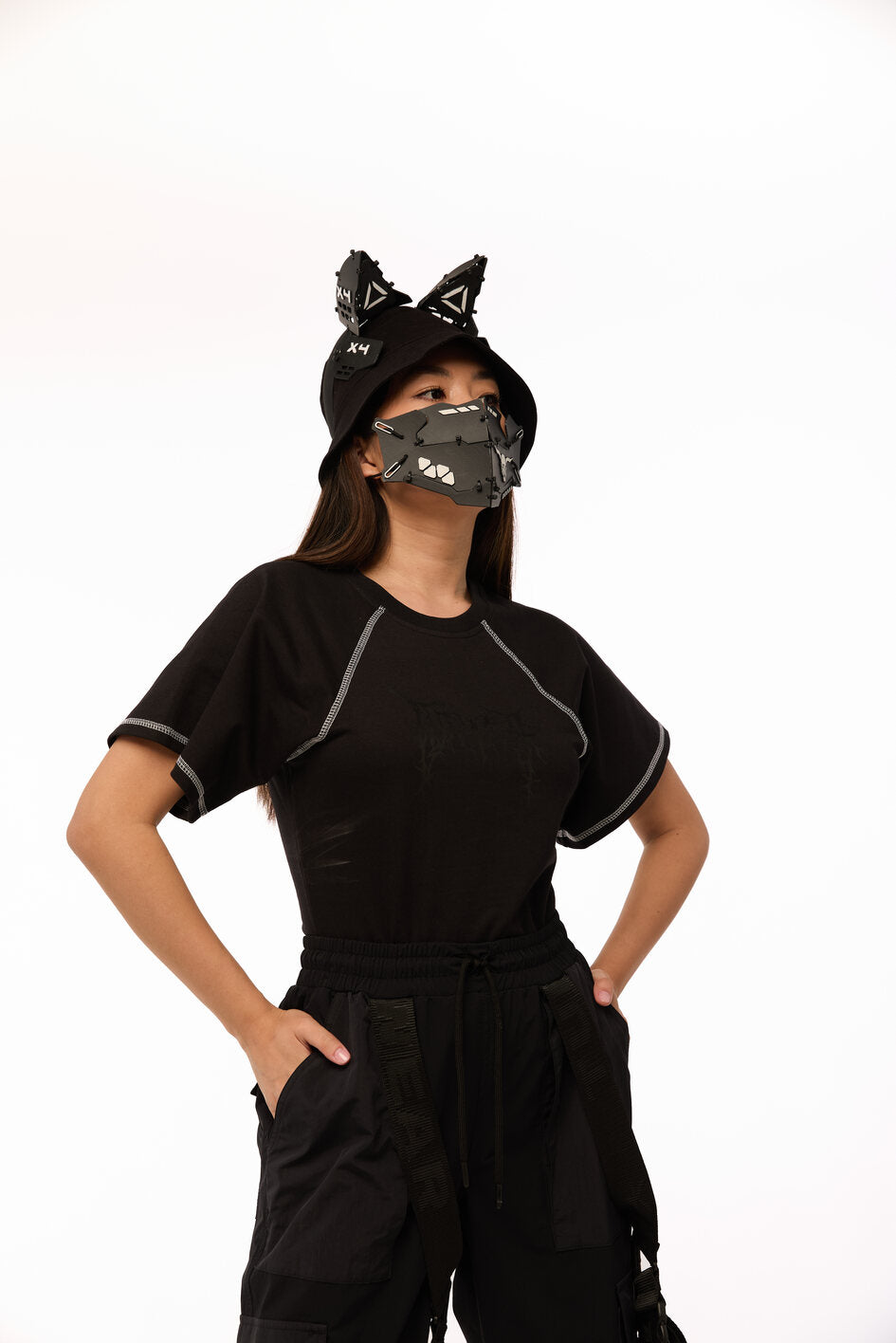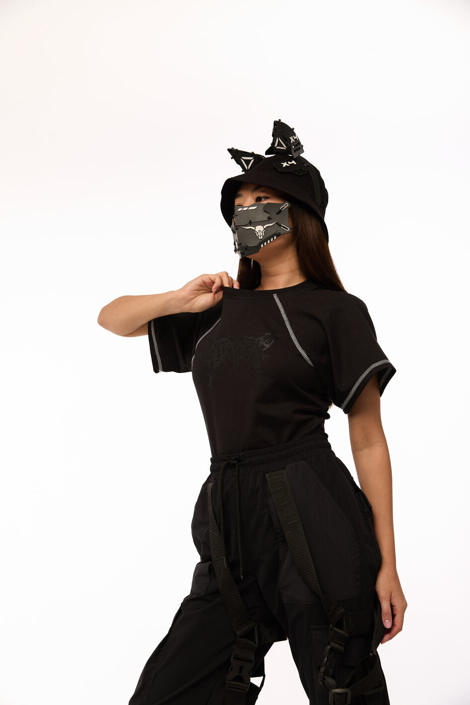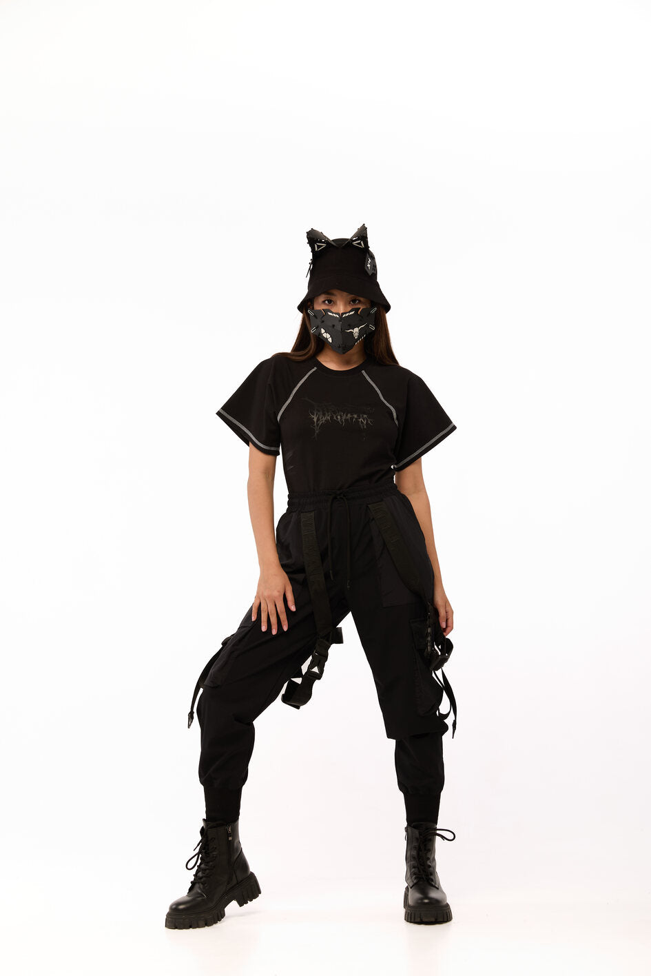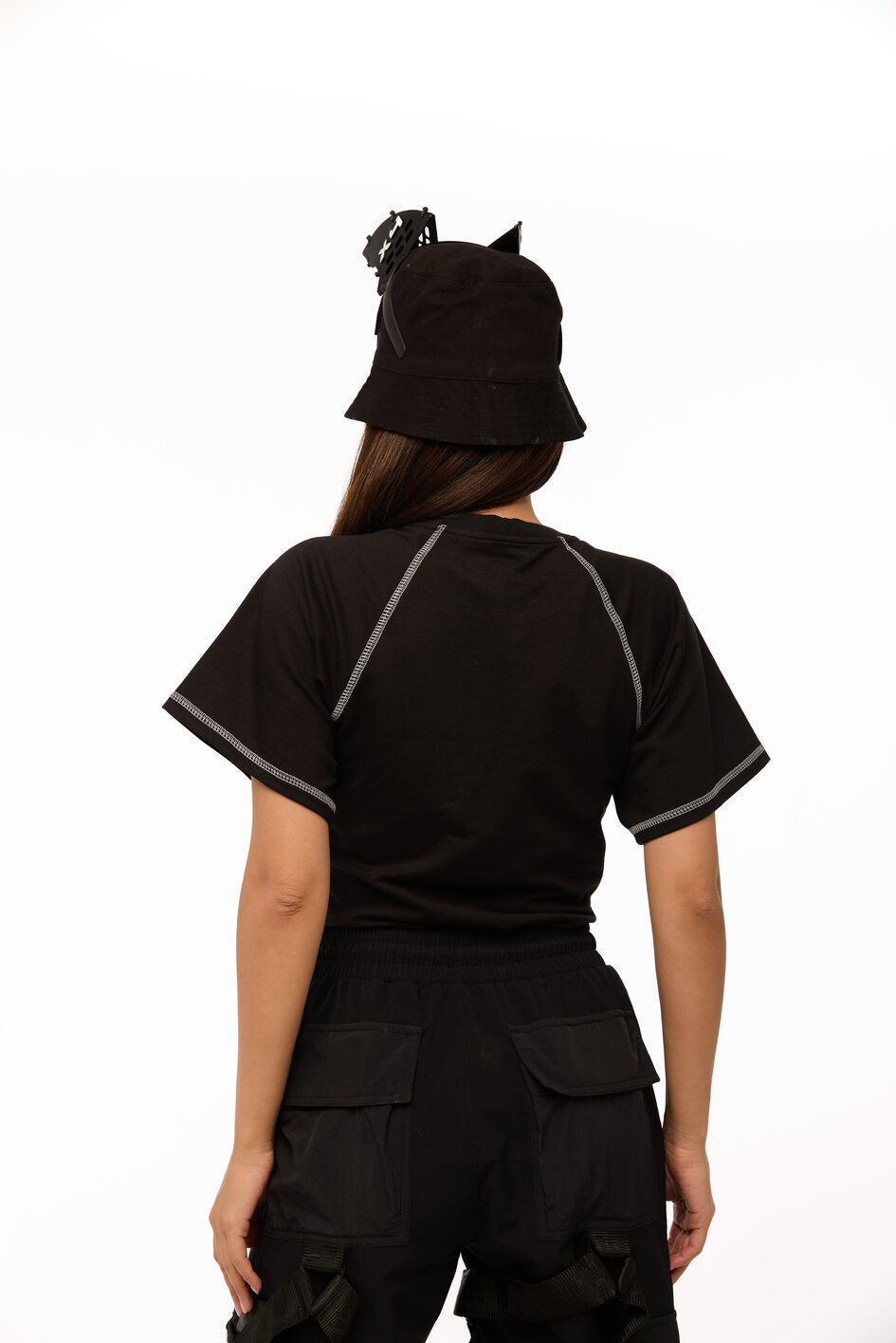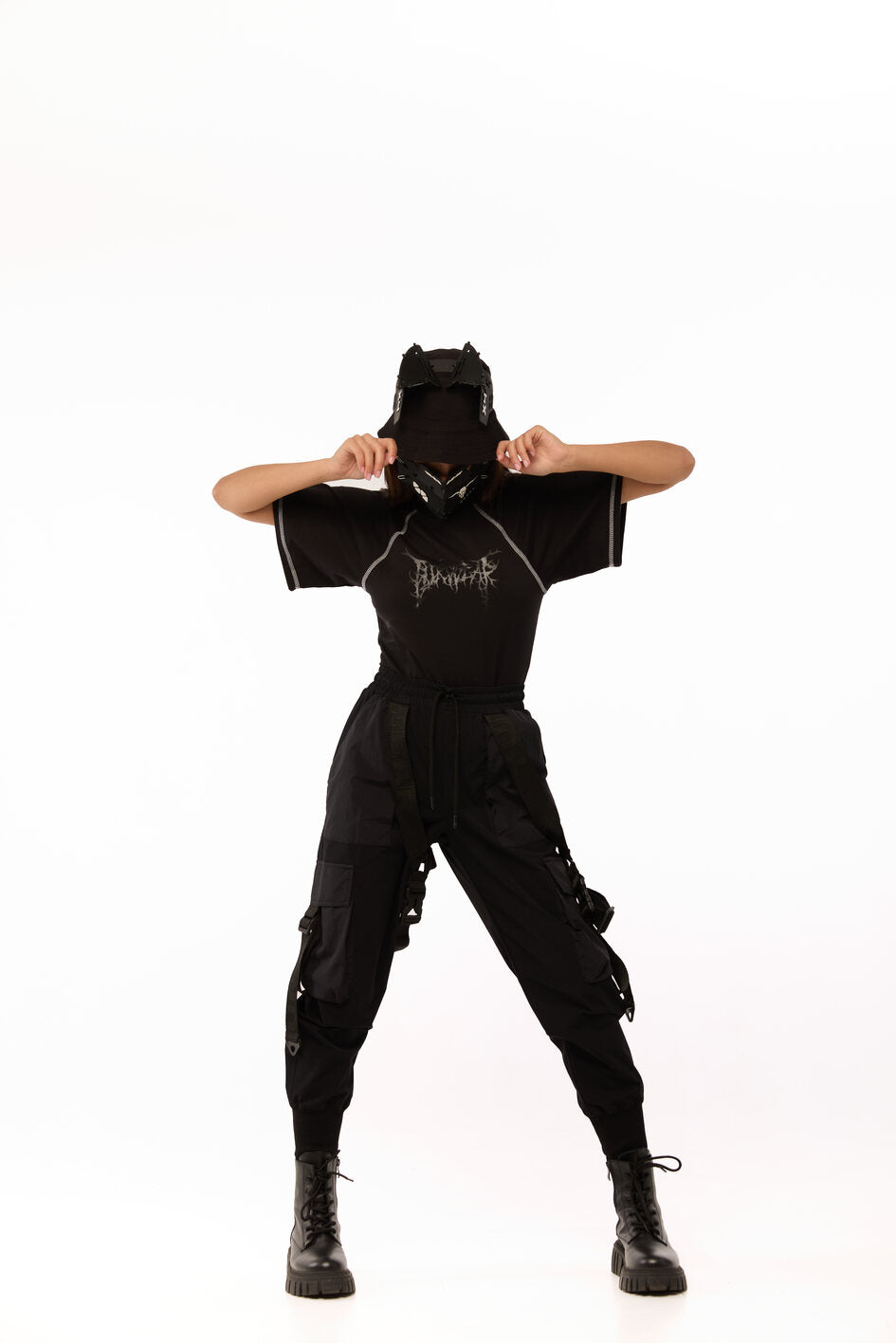 Tailliertes Body mit weiten Ärmeln. Als Dekoration Nähte mit kontrastierendem weißen Steppstich. Unterteil des Bodys aus dünnem, elastischem Biflex-Material. Schwarzer Aufdruck auf der Brust. Druckknopfverschluss am unteren Teil.