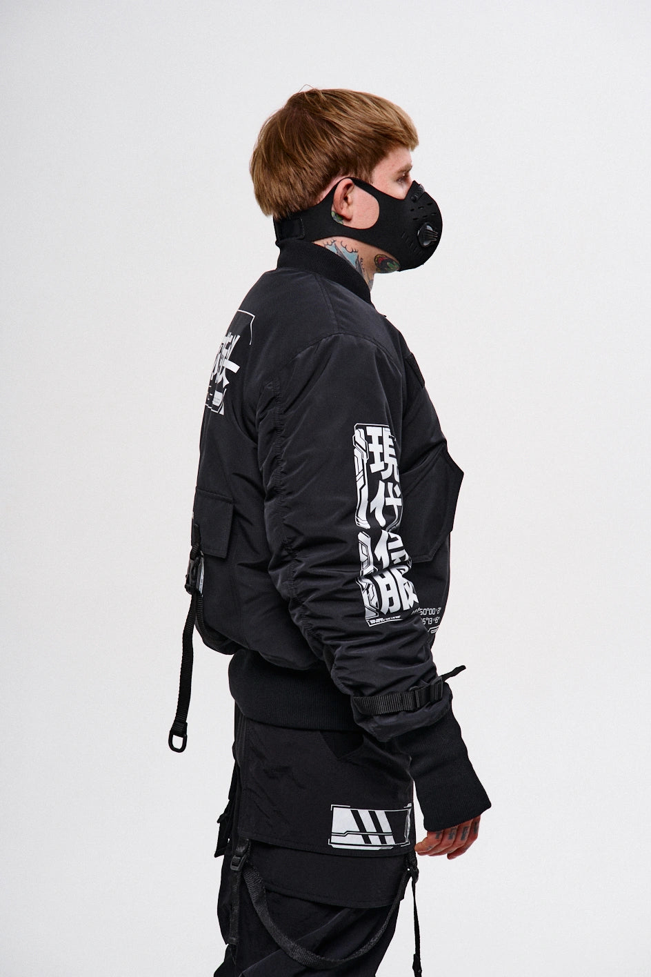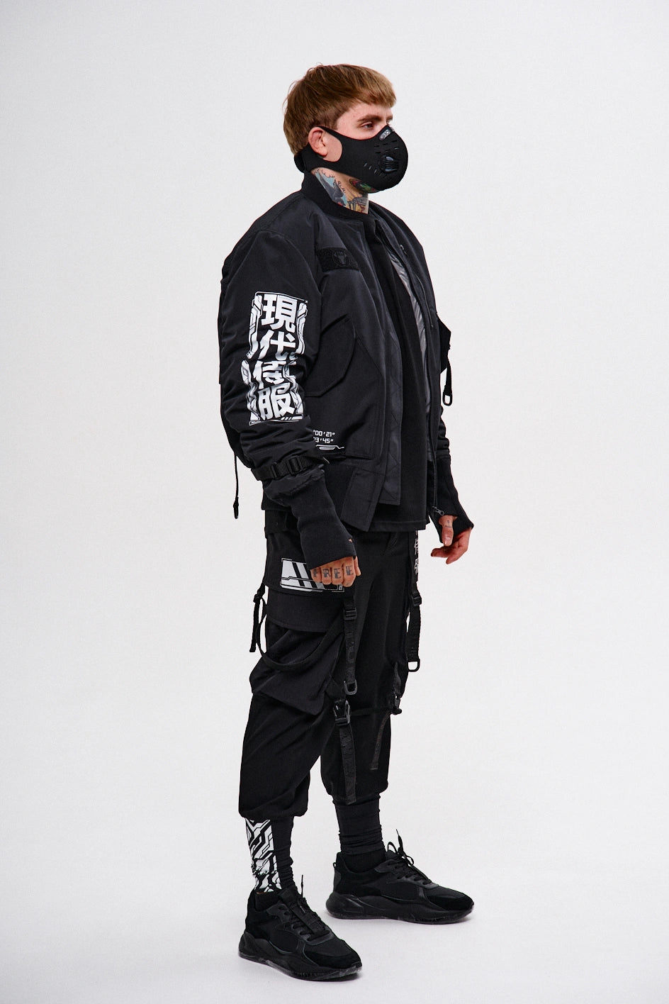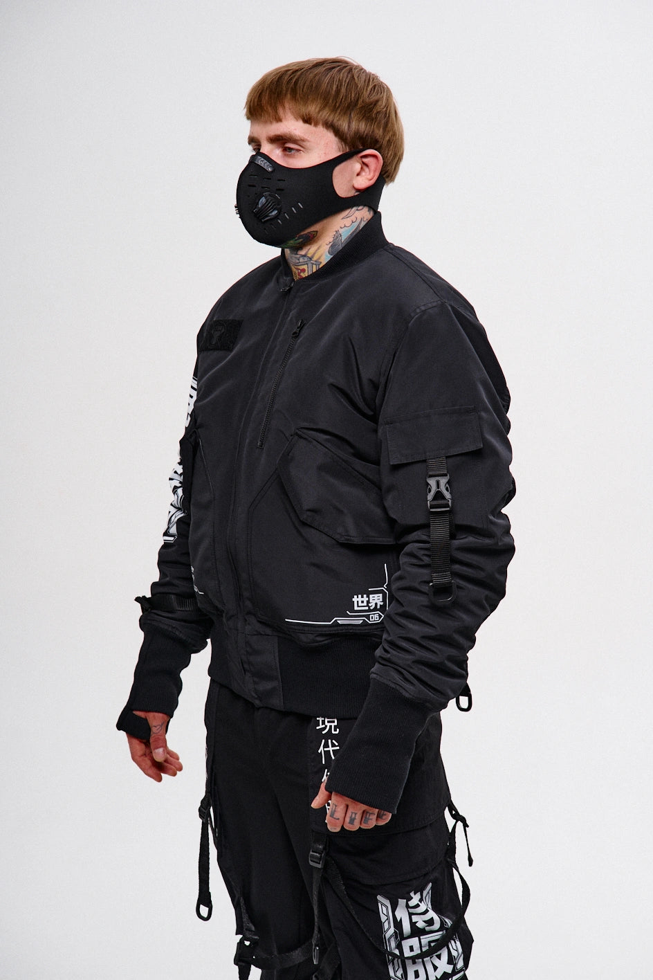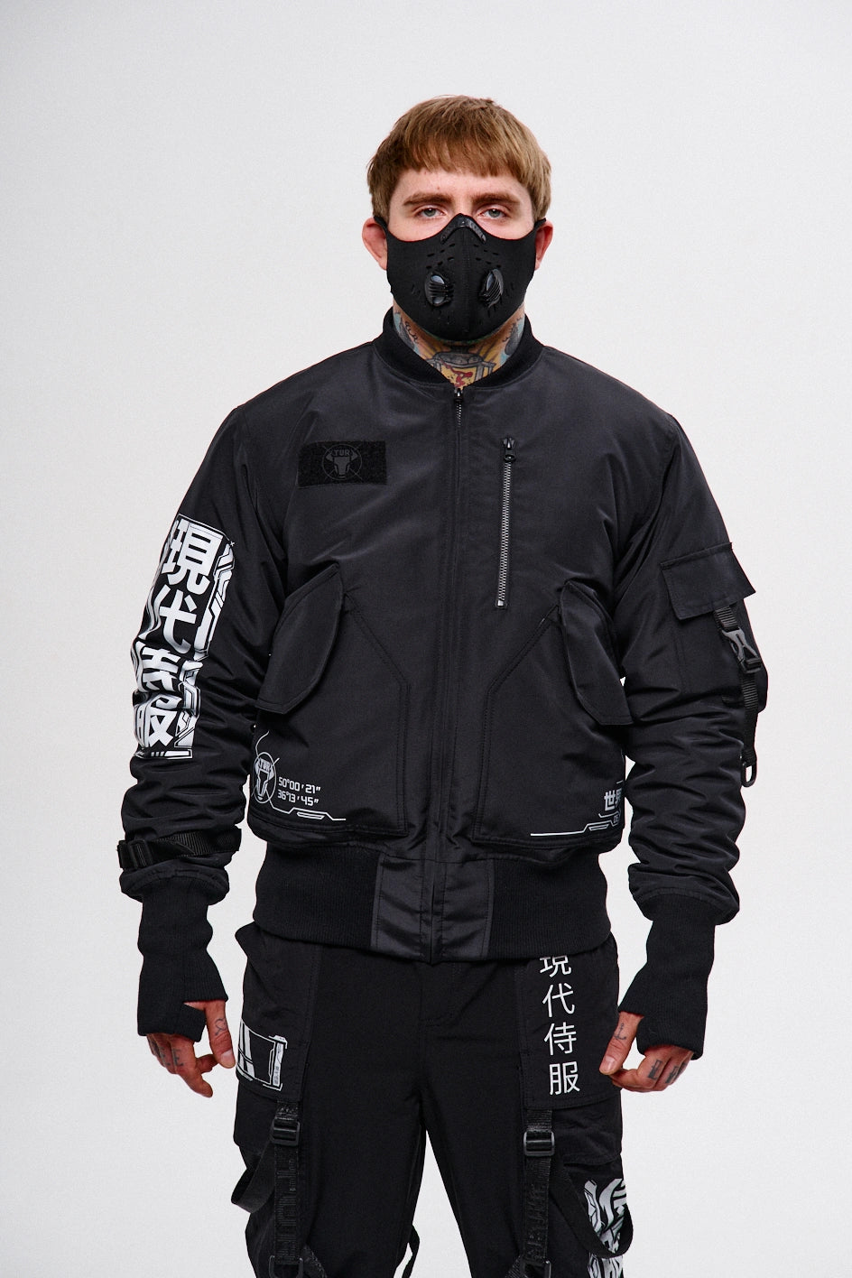 Bomberjacke im Cyberpunk-Stil, basierend auf dem klassischen Schnitt der Alpha Industries Jacke. Auf der linken Brustseite – Reißverschlusstasche, am linken Ärmel – Tasche mit Klappe und Fastex-Schnalle. Zwei aufgesetzte Taschen mit Klappen, inspiriert vom kultigen Alpha-Bomber. Modell verziert mit 6 Prints in Grau, die über die gesamte Fläche verteilt sind.