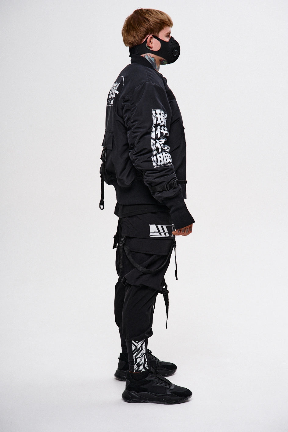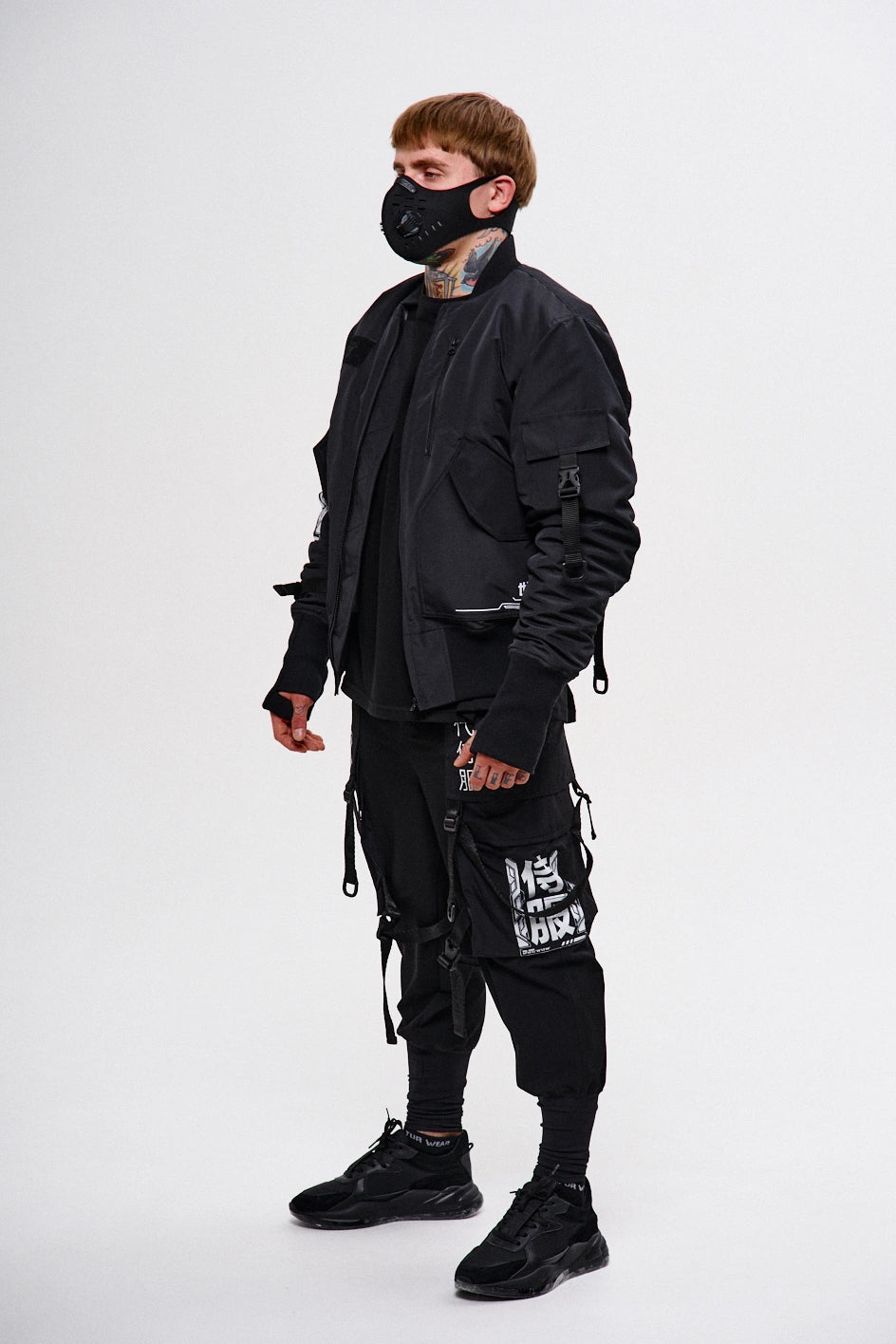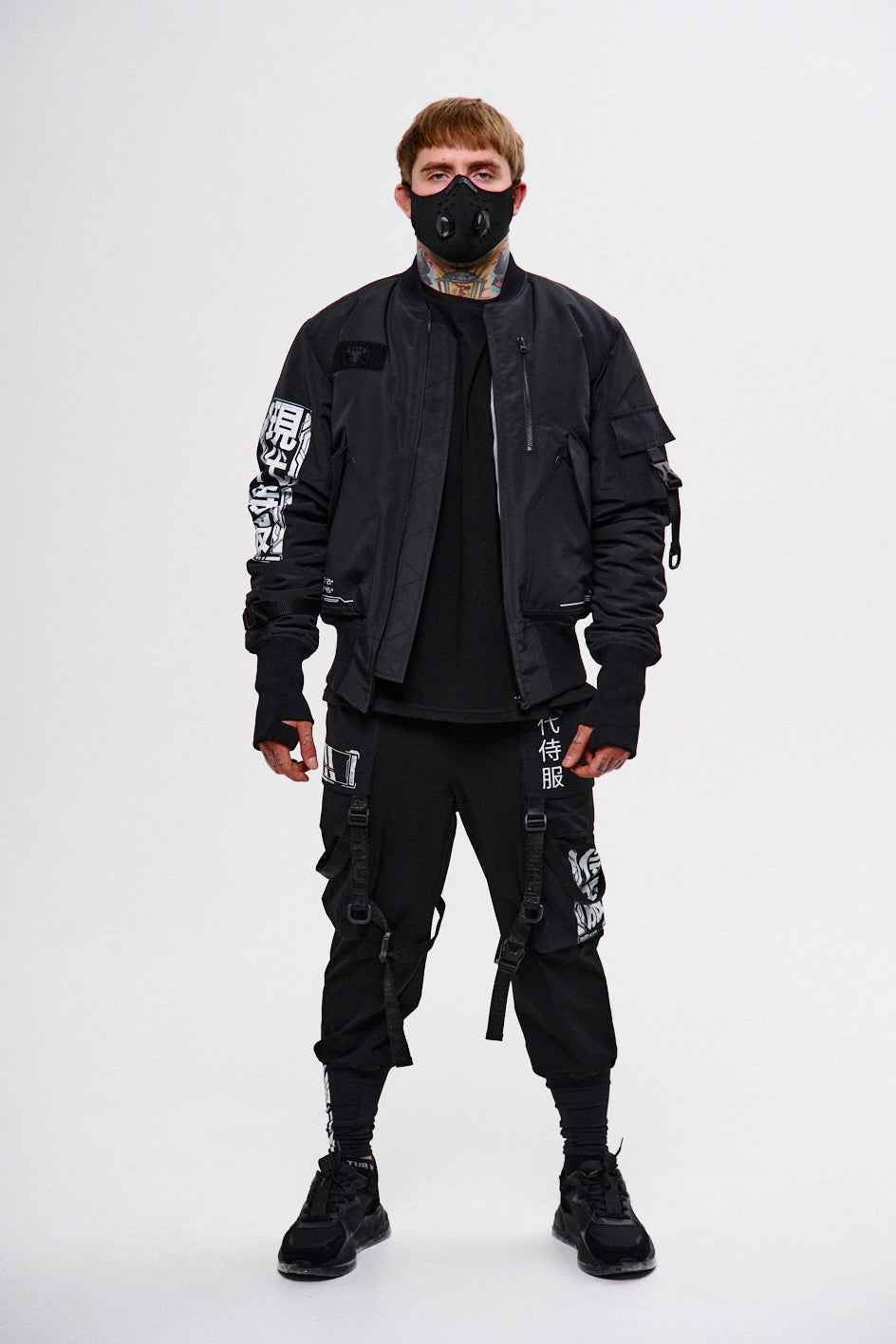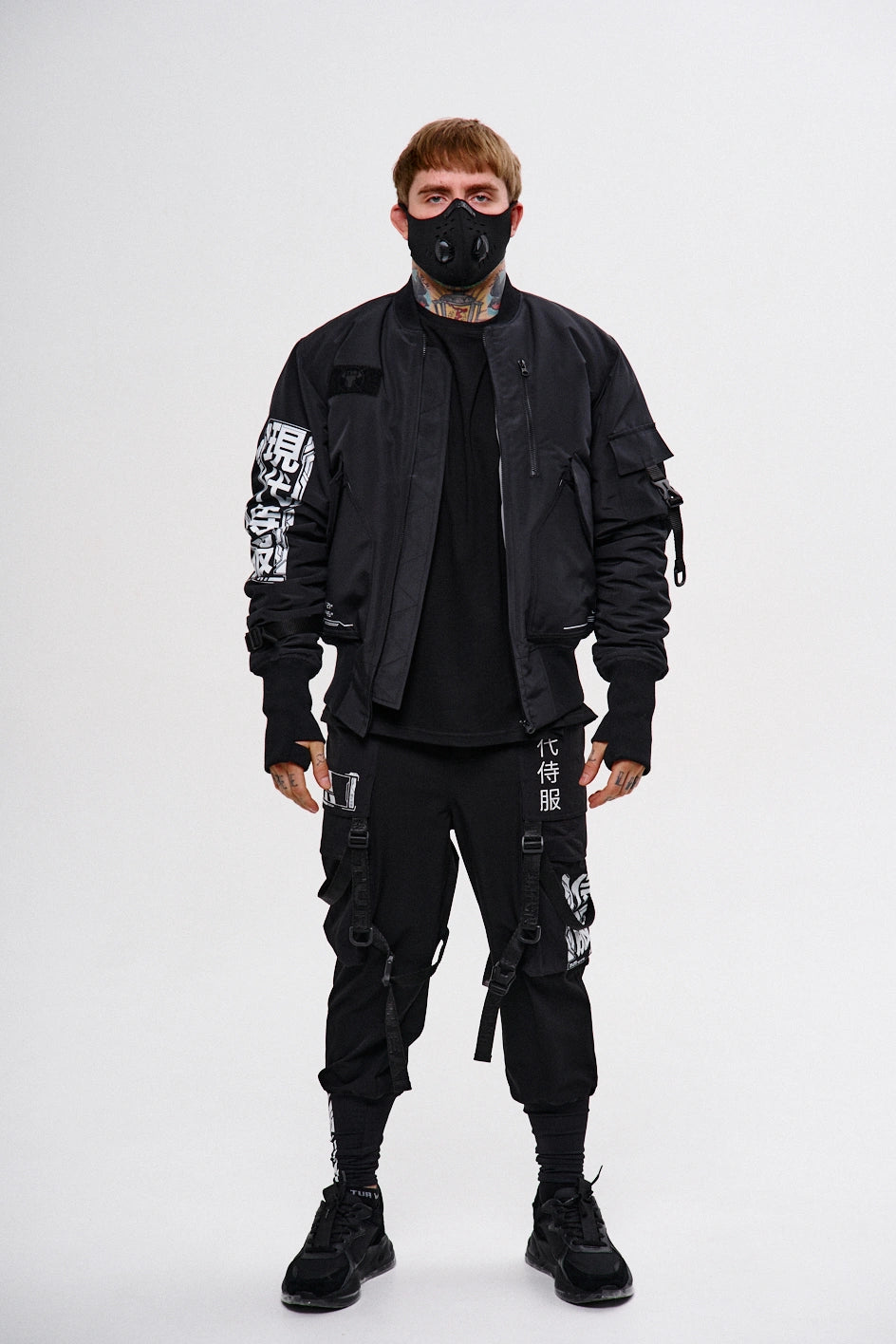 Bomberjacke im Cyberpunk-Stil, basierend auf dem klassischen Schnitt der Alpha Industries Jacke. Auf der linken Brustseite – Reißverschlusstasche, am linken Ärmel – Tasche mit Klappe und Fastex-Schnalle. Zwei aufgesetzte Taschen mit Klappen, inspiriert vom kultigen Alpha-Bomber. Modell verziert mit 6 Prints in Grau, die über die gesamte Fläche verteilt sind.