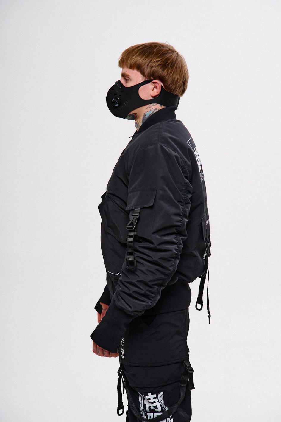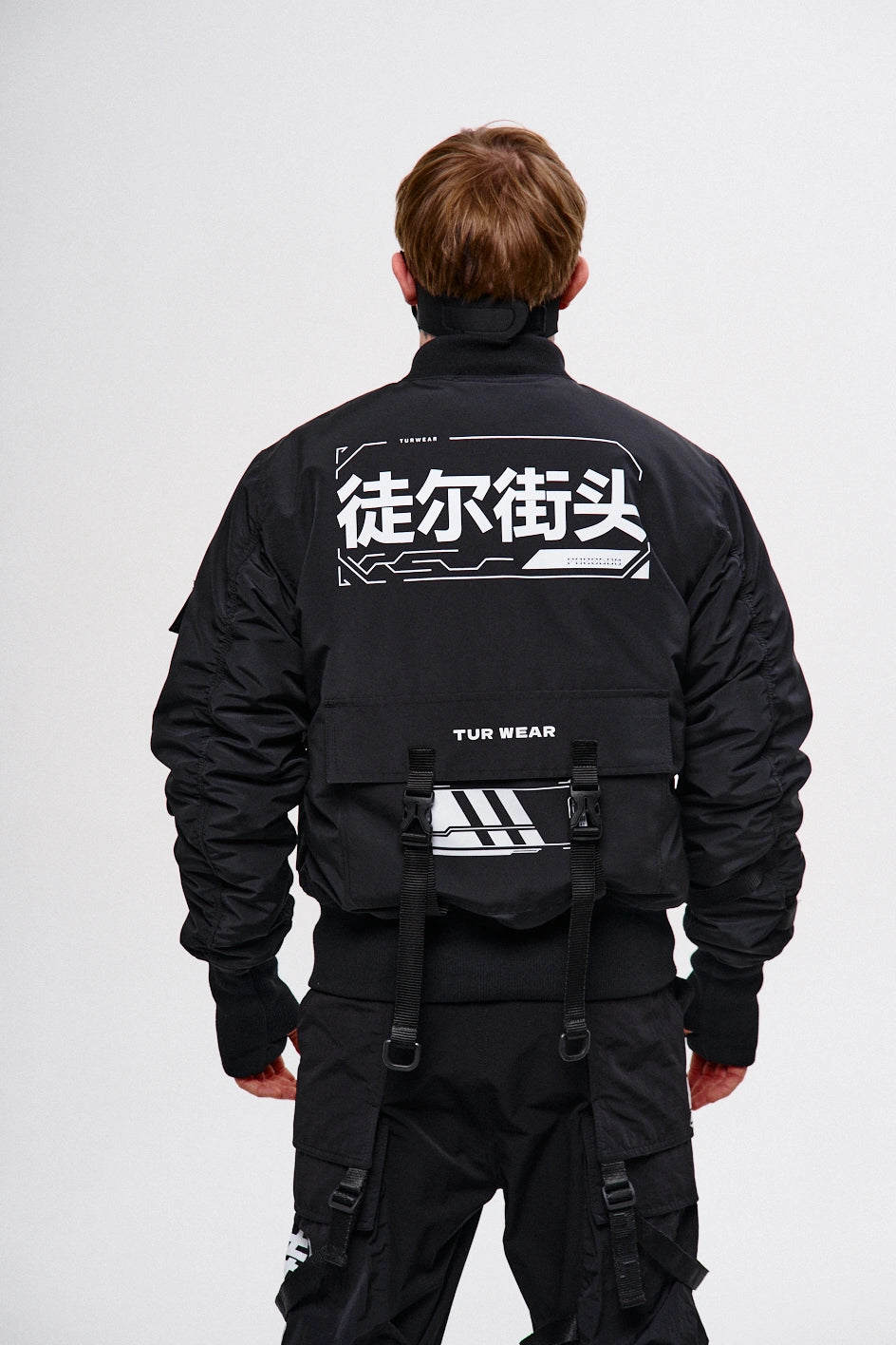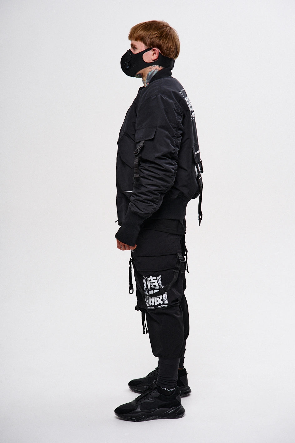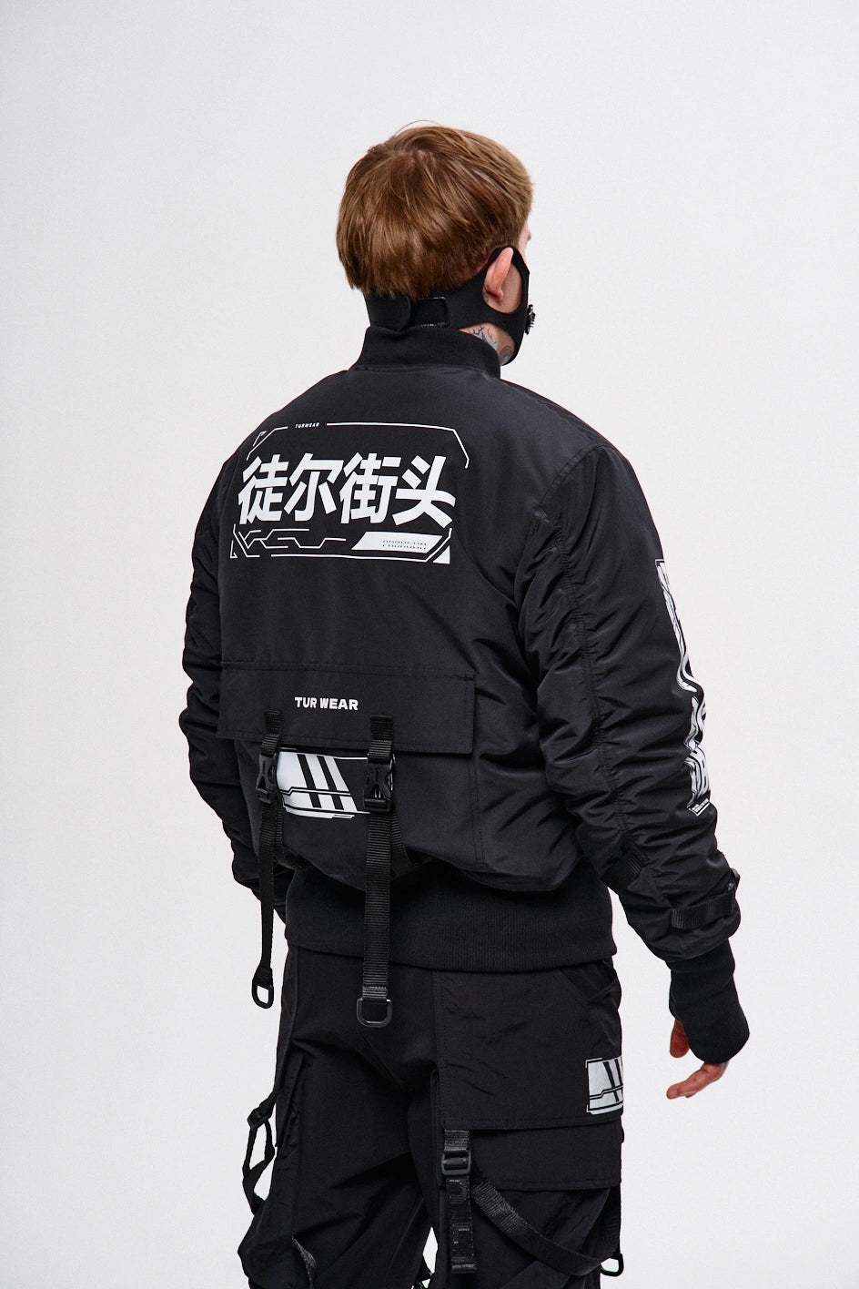 Bomberjacke im Cyberpunk-Stil, basierend auf dem klassischen Schnitt der Alpha Industries Jacke. Auf der linken Brustseite – Reißverschlusstasche, am linken Ärmel – Tasche mit Klappe und Fastex-Schnalle. Zwei aufgesetzte Taschen mit Klappen, inspiriert vom kultigen Alpha-Bomber. Modell verziert mit 6 Prints in Grau, die über die gesamte Fläche verteilt sind.