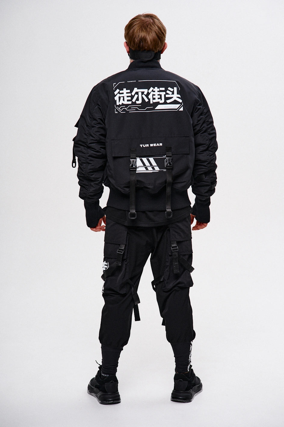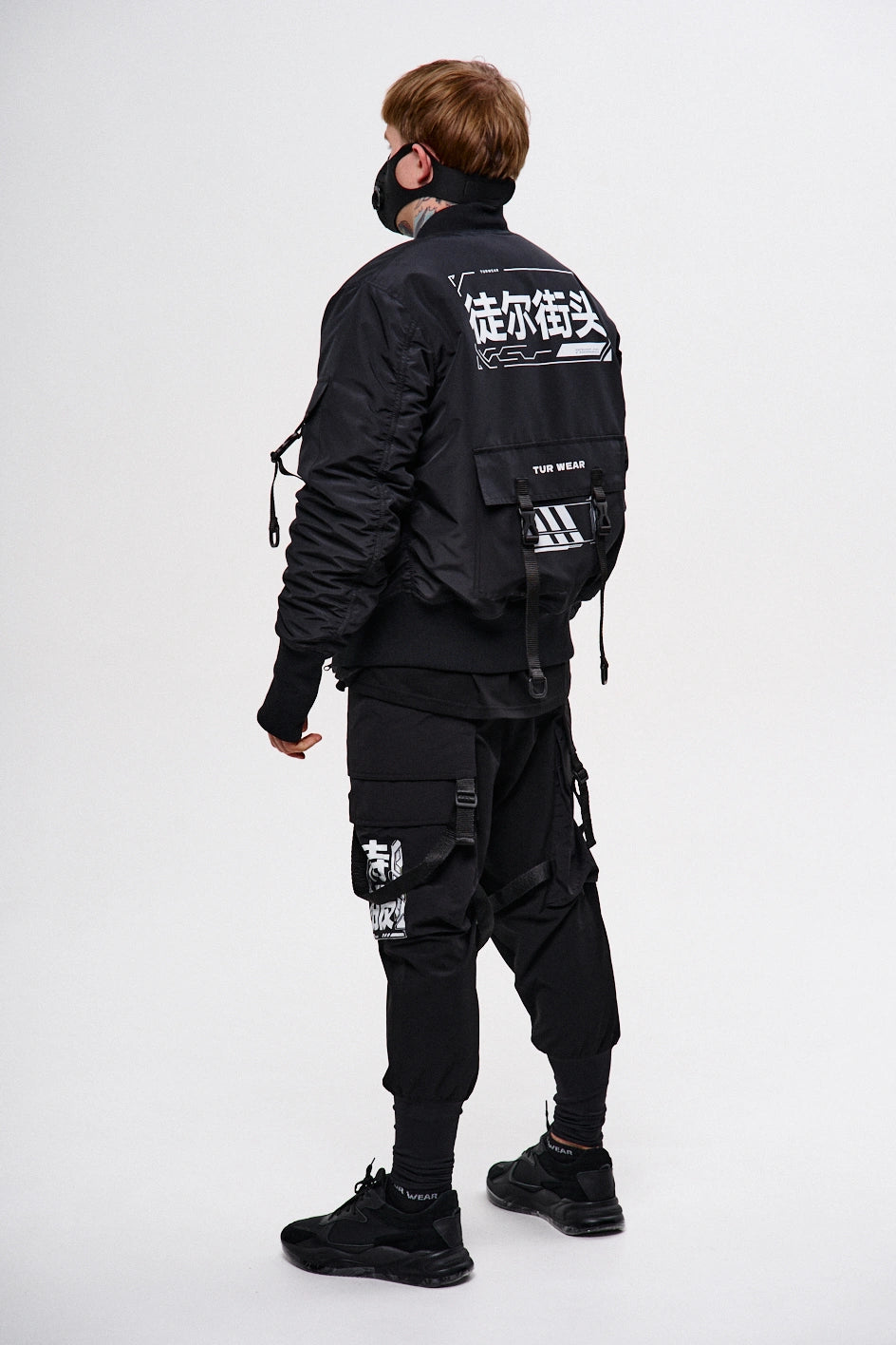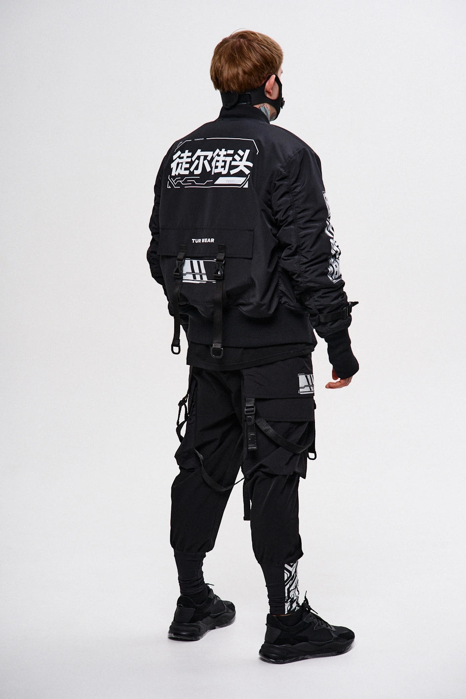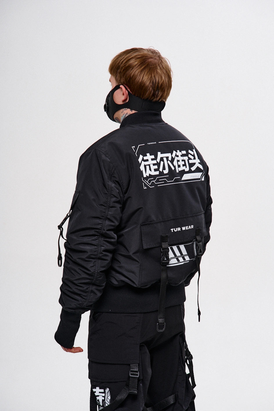 Bomberjacke im Cyberpunk-Stil, basierend auf dem klassischen Schnitt der Alpha Industries Jacke. Auf der linken Brustseite – Reißverschlusstasche, am linken Ärmel – Tasche mit Klappe und Fastex-Schnalle. Zwei aufgesetzte Taschen mit Klappen, inspiriert vom kultigen Alpha-Bomber. Modell verziert mit 6 Prints in Grau, die über die gesamte Fläche verteilt sind.