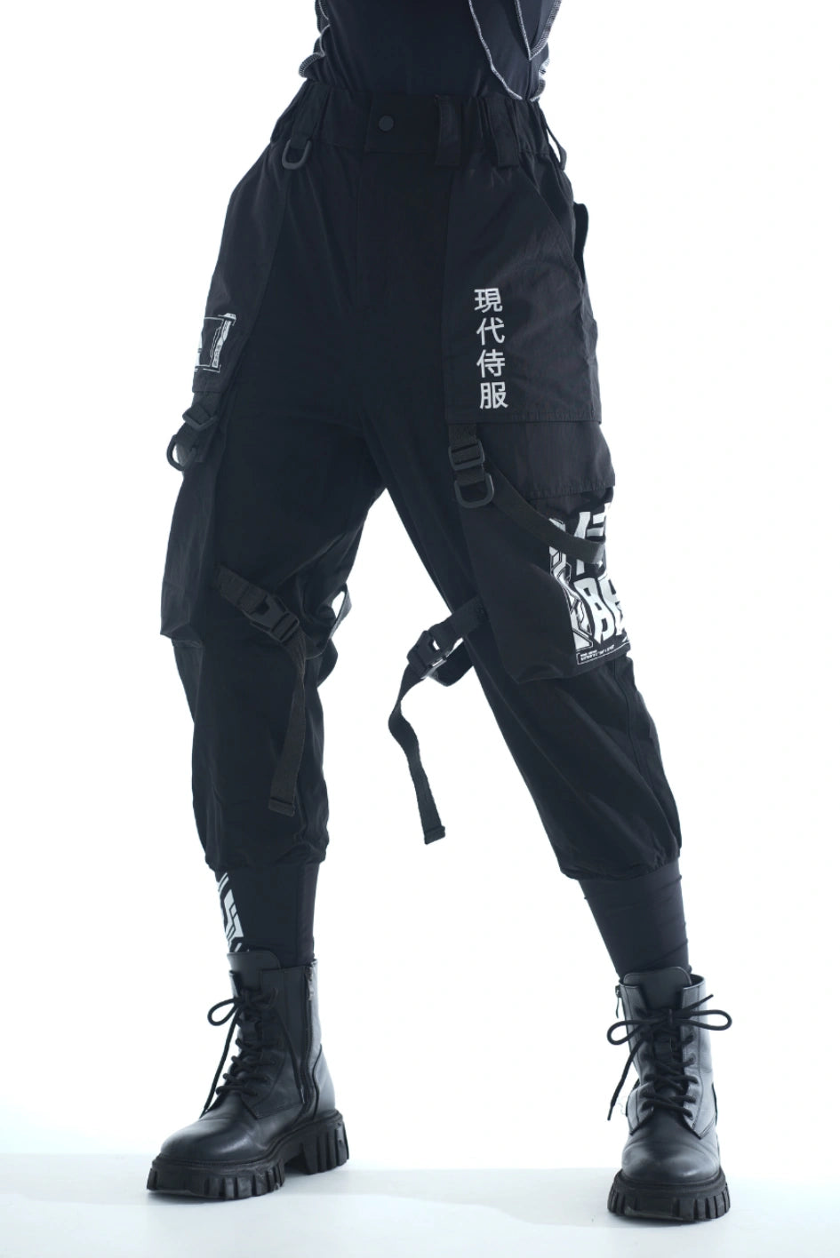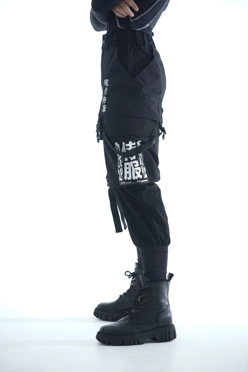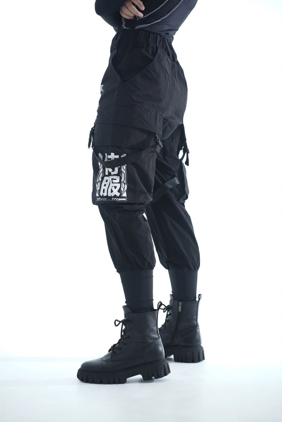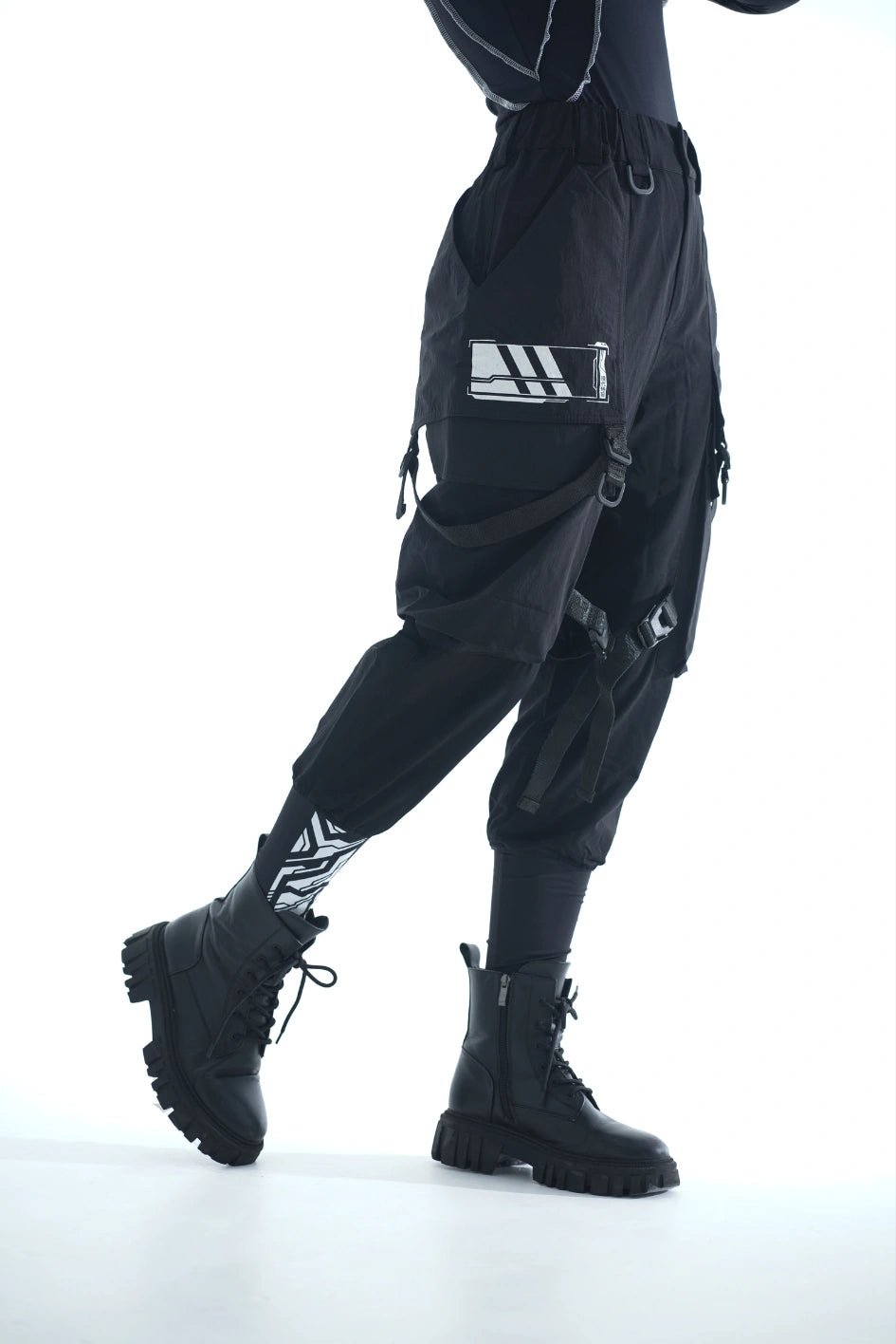 Lockere Cargo-Hose mit hohen Bündchen aus dichtem, elastischem Nylon. Auf dem rechten Bündchen ein Aufdruck. Sechs aufgesetzte Taschen – die oberen Klappentaschen überlappen die Seitentaschen und erzeugen so einen Layering-Effekt. Dekorative Bänder mit Schnallen an den Knien ermöglichen die Regulierung der Beinweite. Bänder, die die Ecken der oberen Taschen verbinden, enden in Halbringen – daran lassen sich Magazintaschen oder Schlüsselanhänger befestigen. Ein weiteres Halbring ist in die vordere Gürtelschlaufe integriert. Die Hose hat Gürtelschlaufen und einen innenliegenden Gummizug für bequemen Sitz. Verschluss – Knopfleiste. Vier Cyberpunk-Prints betonen den Charakter des Modells. Die Seitentaschen sind nach dem Muster der Cargo-Hose „Cyber“ konstruiert.