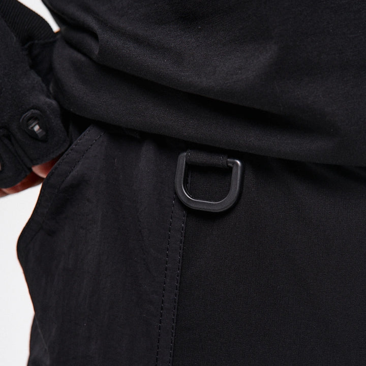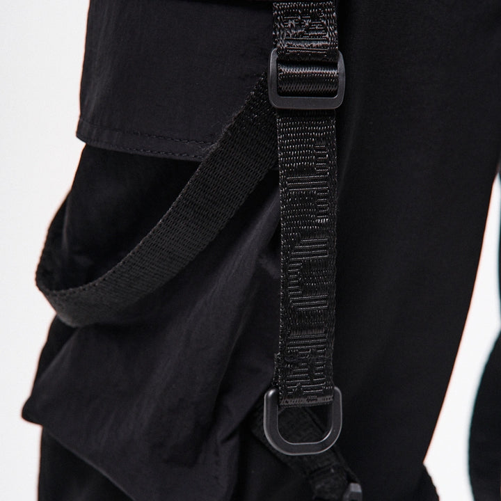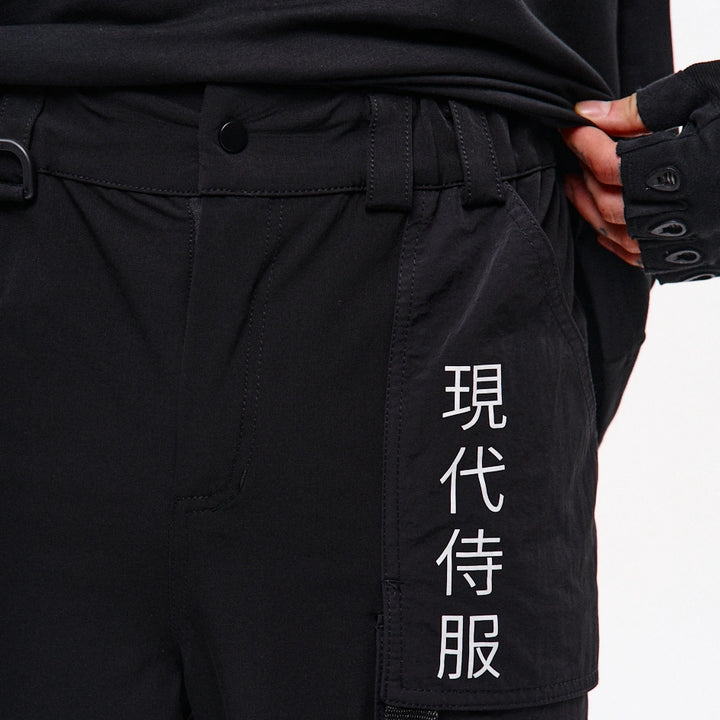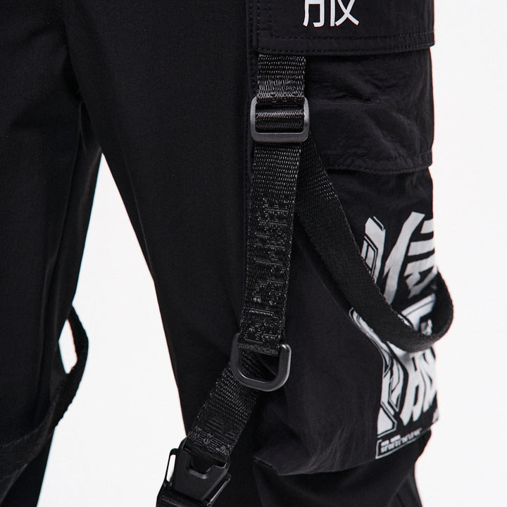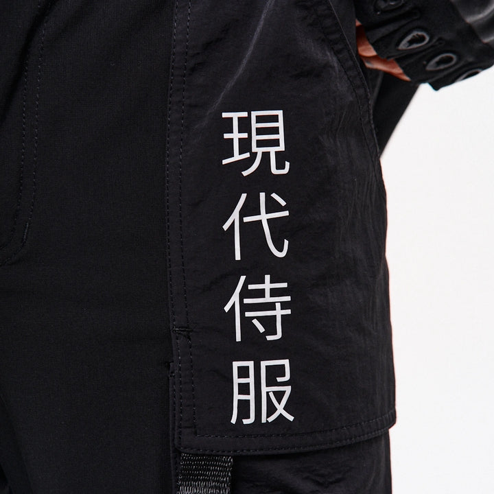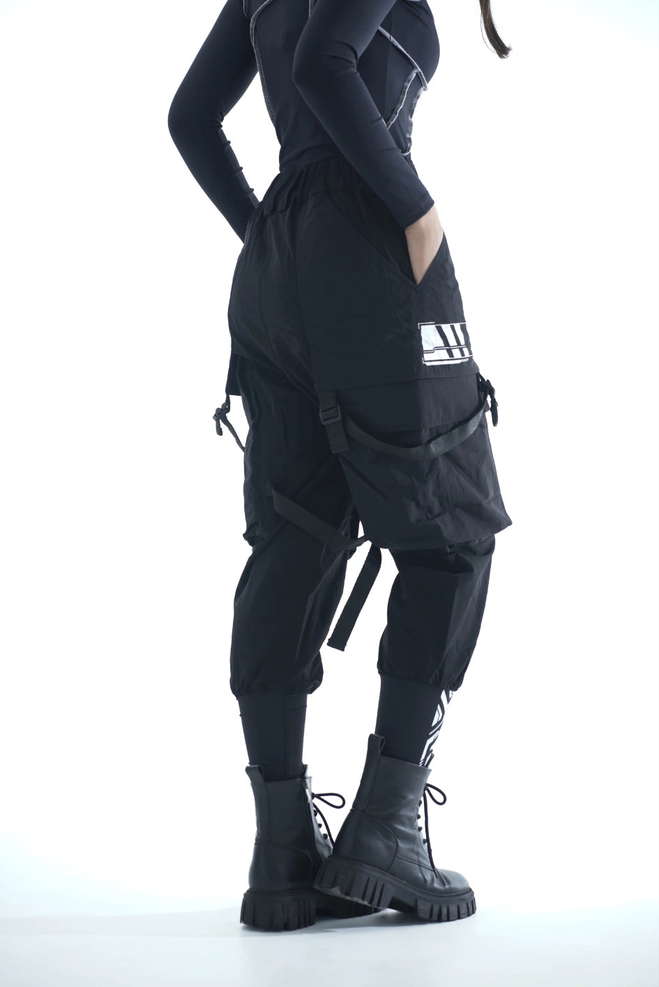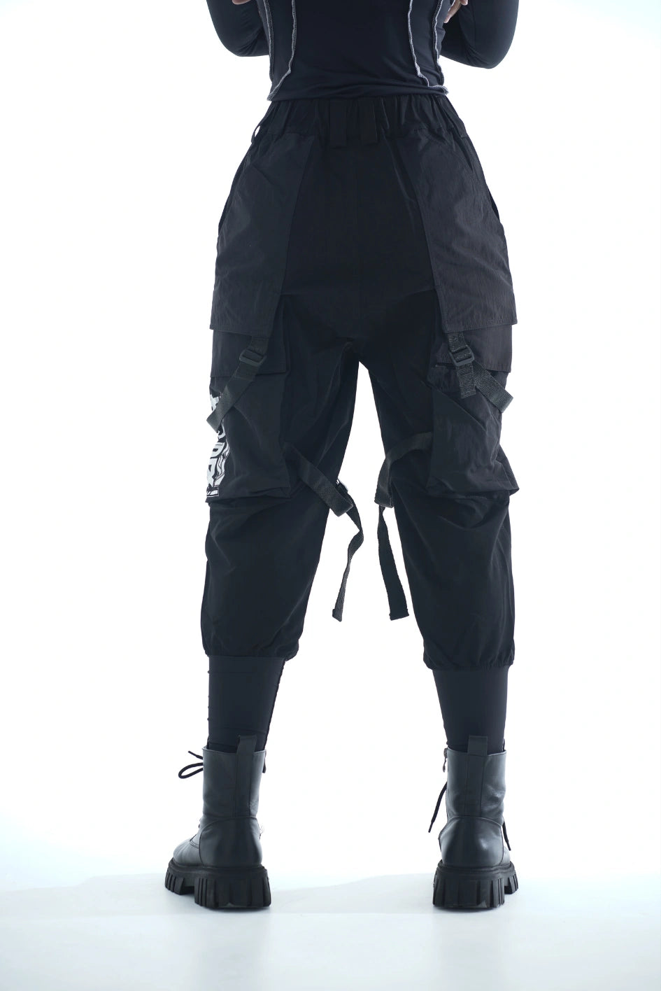 Lockere Cargo-Hose mit hohen Bündchen aus dichtem, elastischem Nylon. Auf dem rechten Bündchen ein Aufdruck. Sechs aufgesetzte Taschen – die oberen Klappentaschen überlappen die Seitentaschen und erzeugen so einen Layering-Effekt. Dekorative Bänder mit Schnallen an den Knien ermöglichen die Regulierung der Beinweite. Bänder, die die Ecken der oberen Taschen verbinden, enden in Halbringen – daran lassen sich Magazintaschen oder Schlüsselanhänger befestigen. Ein weiteres Halbring ist in die vordere Gürtelschlaufe integriert. Die Hose hat Gürtelschlaufen und einen innenliegenden Gummizug für bequemen Sitz. Verschluss – Knopfleiste. Vier Cyberpunk-Prints betonen den Charakter des Modells. Die Seitentaschen sind nach dem Muster der Cargo-Hose „Cyber“ konstruiert.