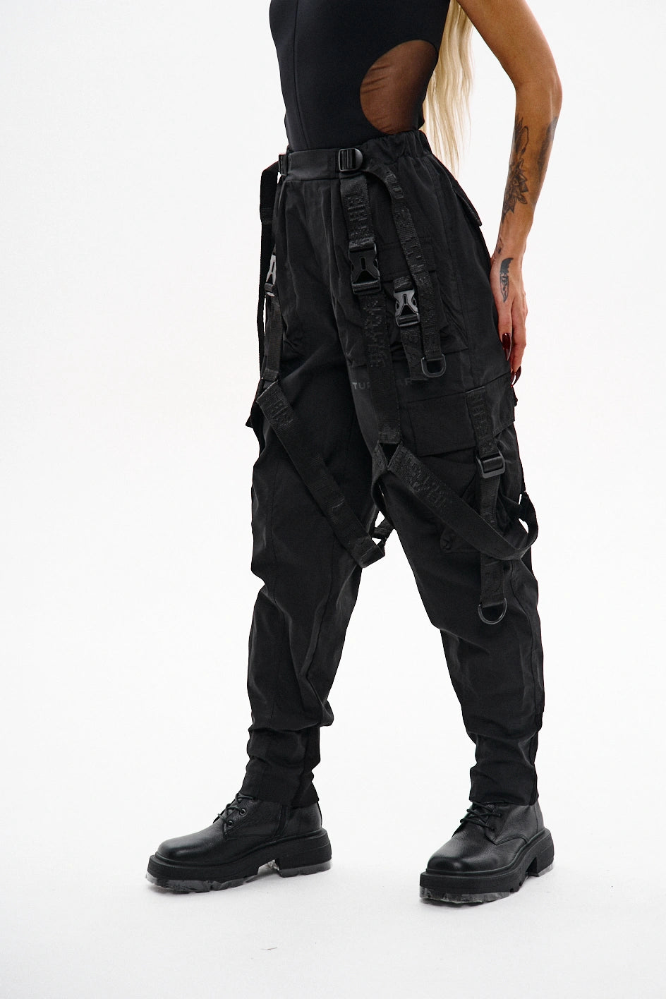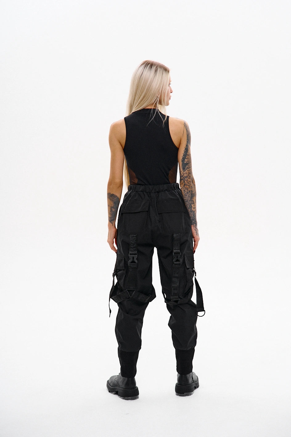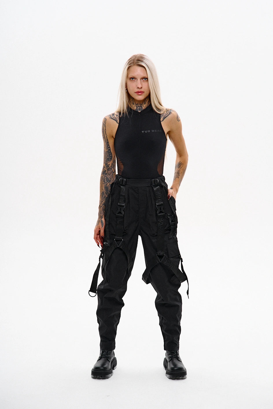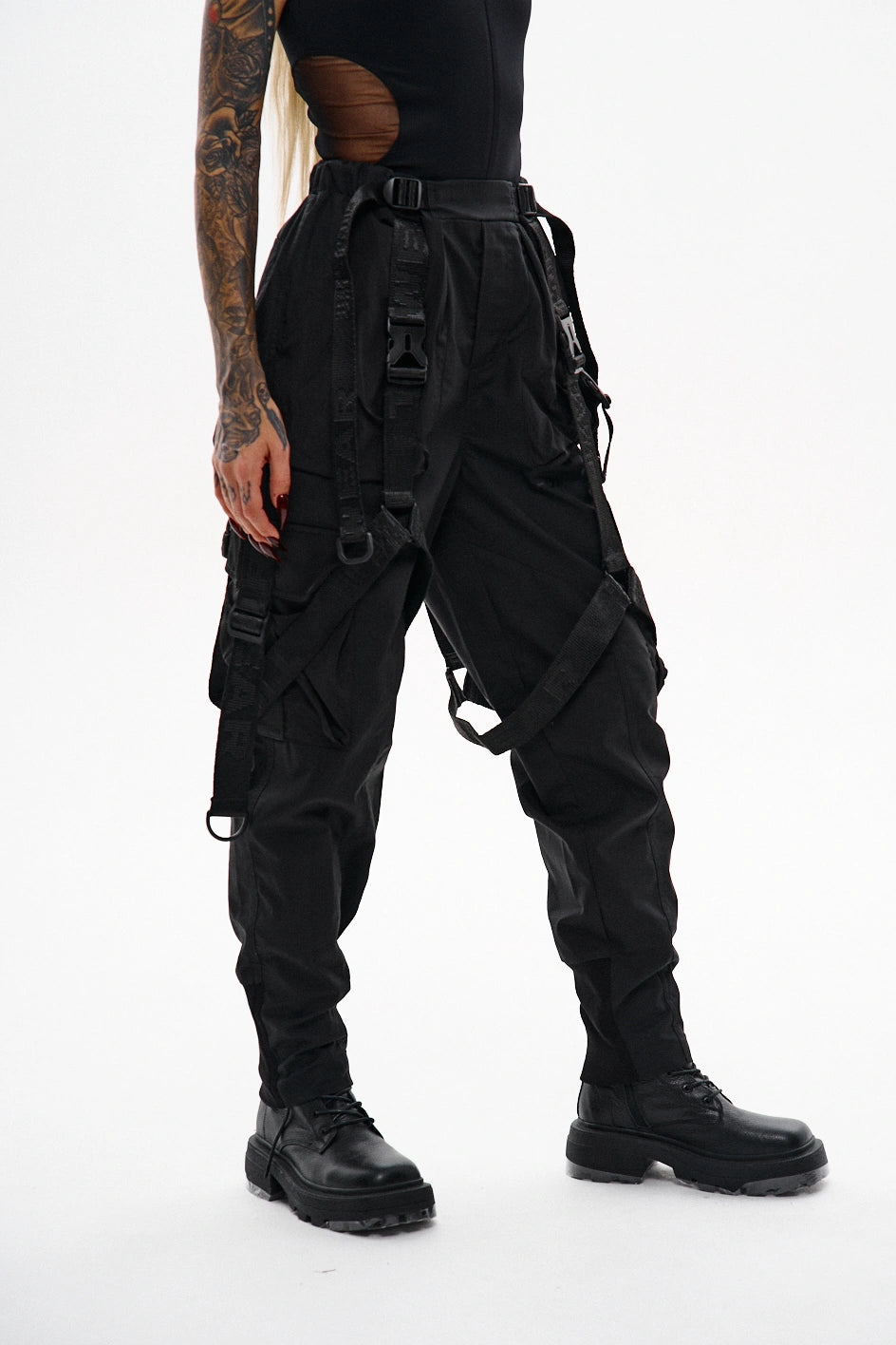 Locker geschnittene Hose. Abnehmbare Hosenträger mit Fastex-Verschluss. Bund mit Gummizug und integriertem Gürtel mit doppelter Regulierung. Die Hose verfügt über 7 Taschen: zwei aufgesetzte Taschen oben, zwei aufgesetzte Seitentaschen, zwei aufgesetzte Gesäßtaschen und eine kleine aufgesetzte Tasche mit Klappe, die auf die linke obere Tasche genäht ist. Die Gürtelschlaufen sind funktionsfähig. Im unteren Bereich des Produkts befinden sich Manschetten mit hinten platziertem Band, die das Hosenbein verjüngen.