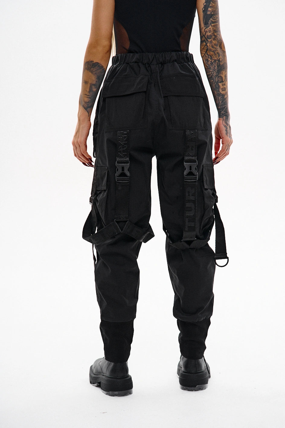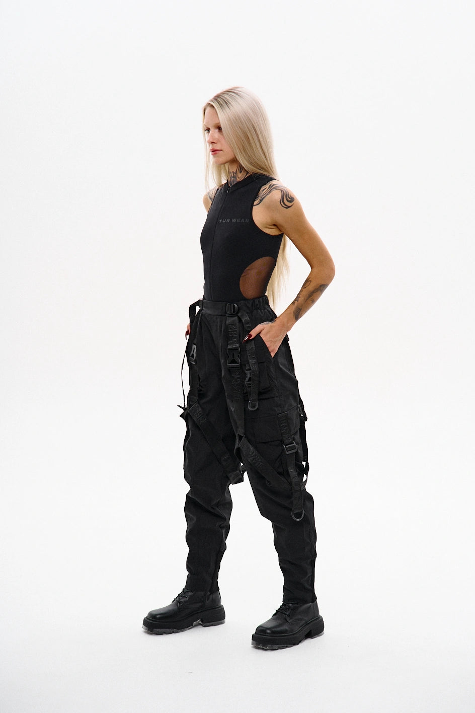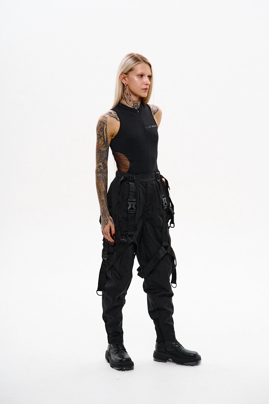 Locker geschnittene Hose. Abnehmbare Hosenträger mit Fastex-Verschluss. Bund mit Gummizug und integriertem Gürtel mit doppelter Regulierung. Die Hose verfügt über 7 Taschen: zwei aufgesetzte Taschen oben, zwei aufgesetzte Seitentaschen, zwei aufgesetzte Gesäßtaschen und eine kleine aufgesetzte Tasche mit Klappe, die auf die linke obere Tasche genäht ist. Die Gürtelschlaufen sind funktionsfähig. Im unteren Bereich des Produkts befinden sich Manschetten mit hinten platziertem Band, die das Hosenbein verjüngen.