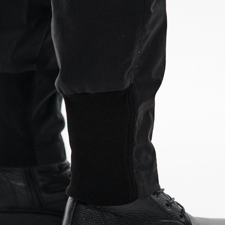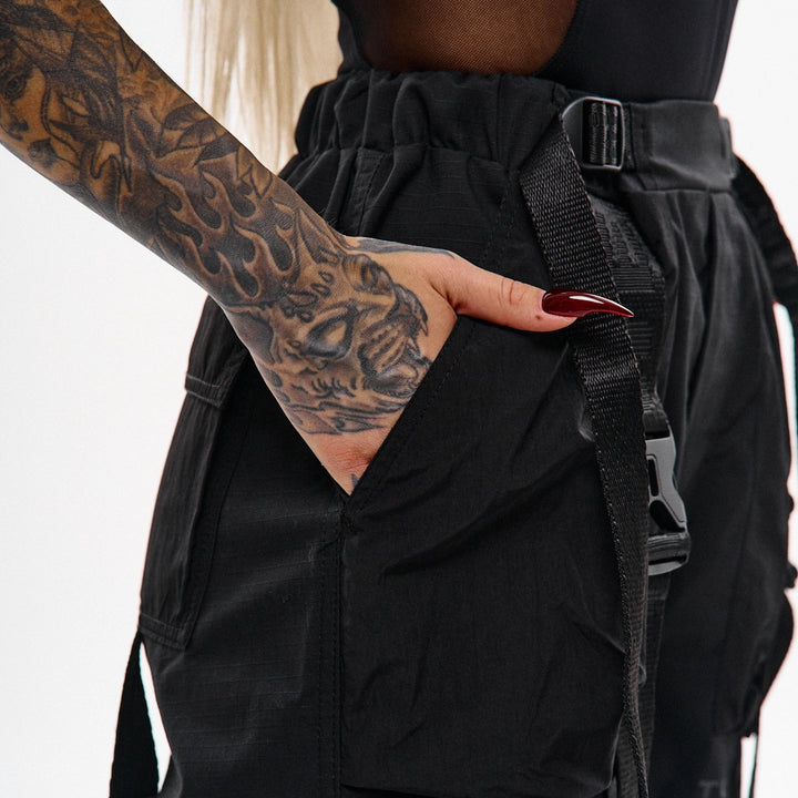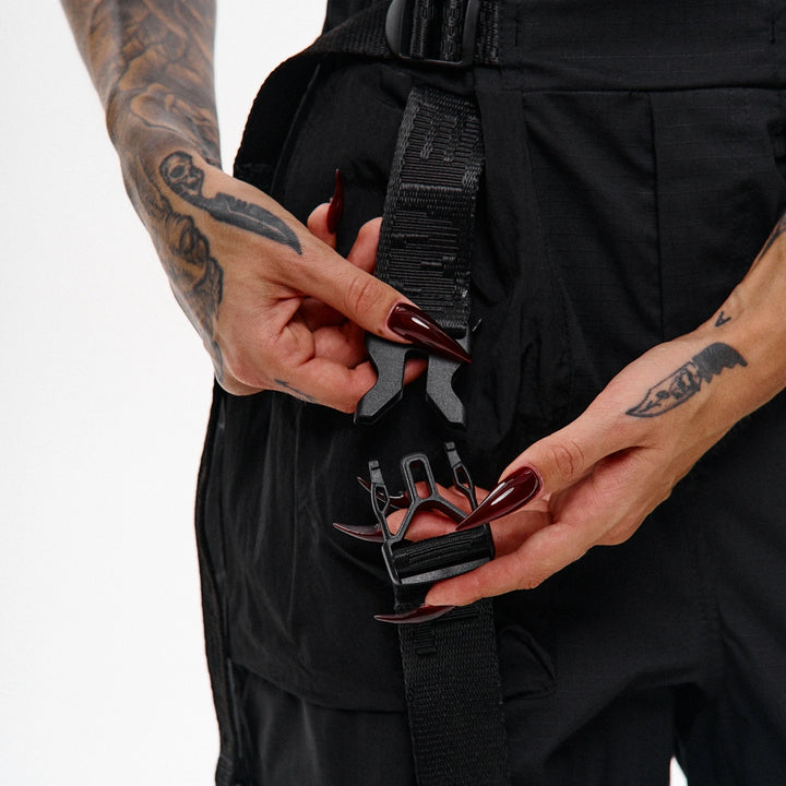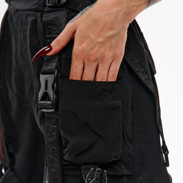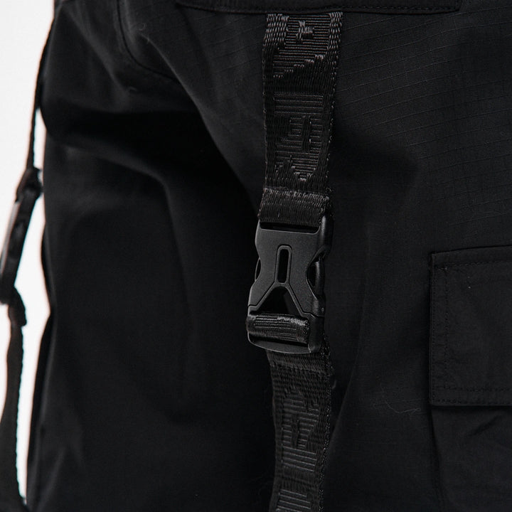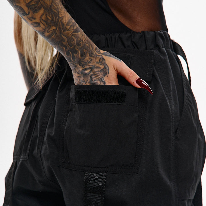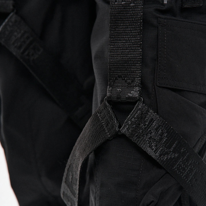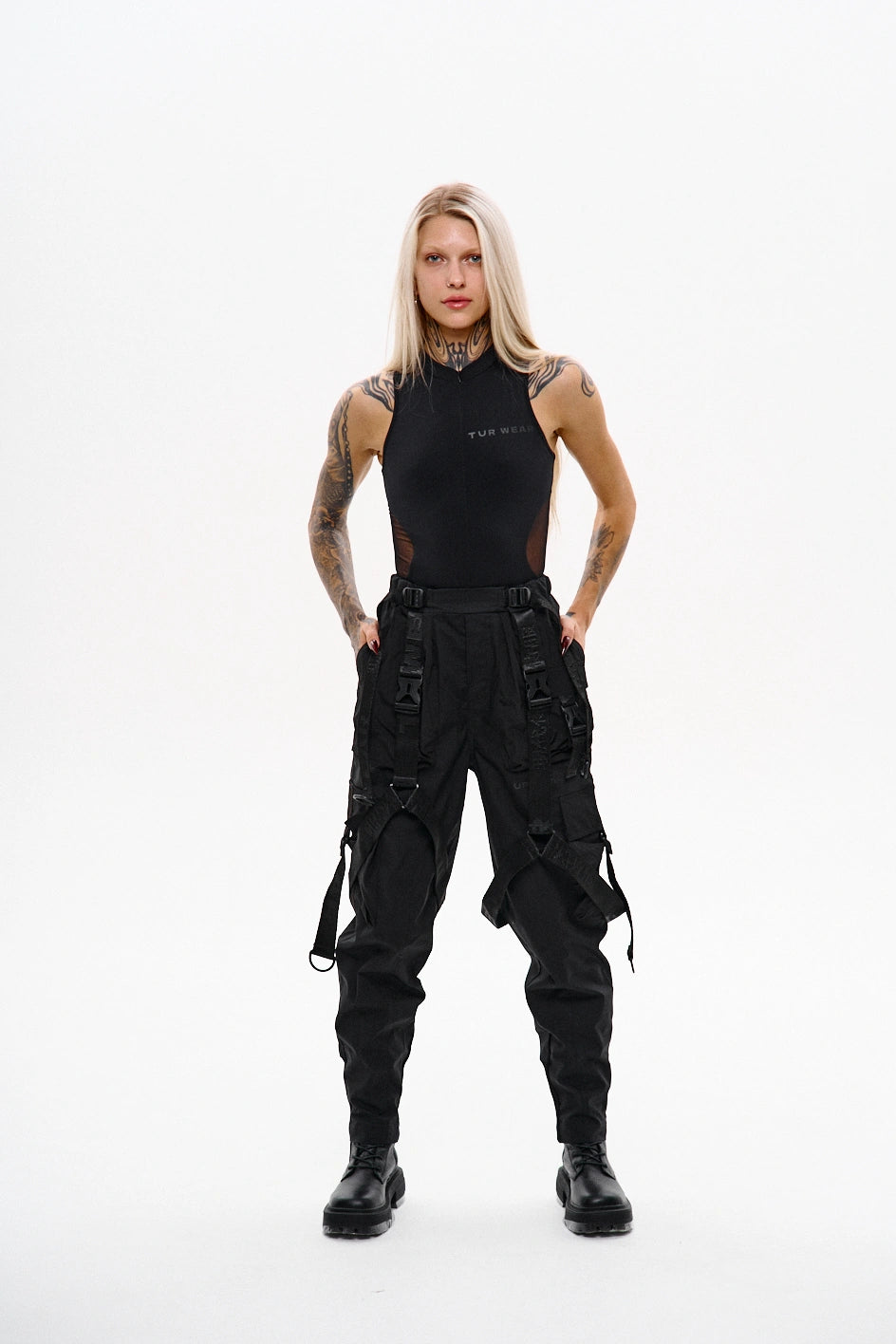 Locker geschnittene Hose. Abnehmbare Hosenträger mit Fastex-Verschluss. Bund mit Gummizug und integriertem Gürtel mit doppelter Regulierung. Die Hose verfügt über 7 Taschen: zwei aufgesetzte Taschen oben, zwei aufgesetzte Seitentaschen, zwei aufgesetzte Gesäßtaschen und eine kleine aufgesetzte Tasche mit Klappe, die auf die linke obere Tasche genäht ist. Die Gürtelschlaufen sind funktionsfähig. Im unteren Bereich des Produkts befinden sich Manschetten mit hinten platziertem Band, die das Hosenbein verjüngen.