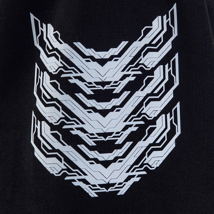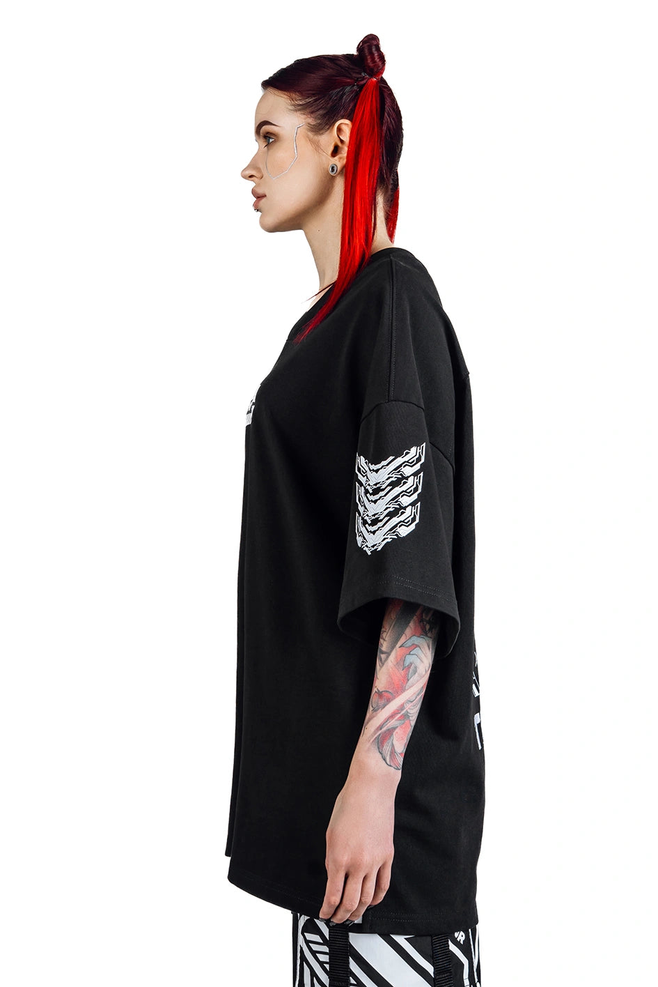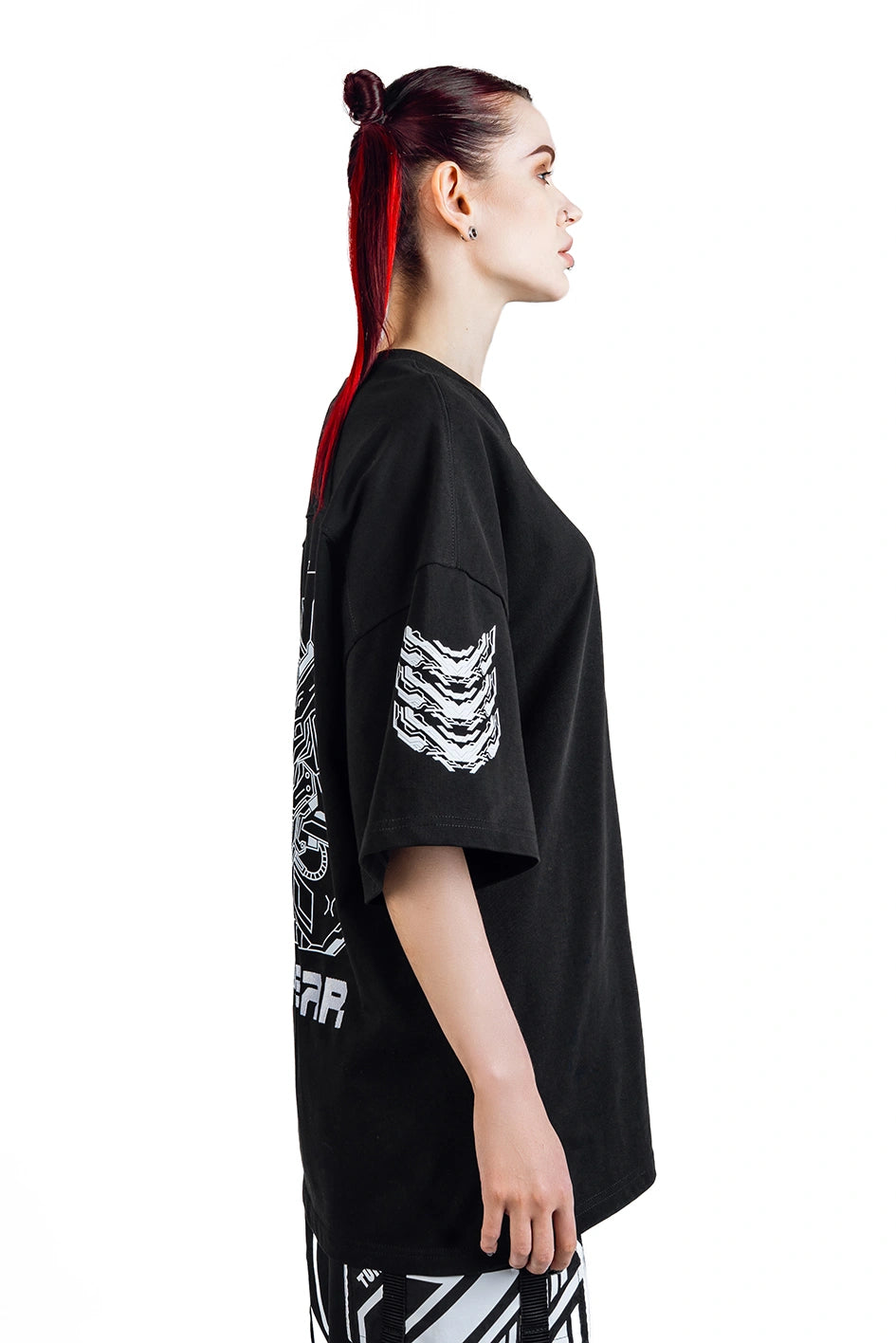 Das Modell ist aus Stretch-Jersey (Kulir) gefertigt — einem Strickstoff mit mittlerem Gewicht, glatter Oberfläche und weicher Textur. Das Material hat ein mattes Finish und sorgt für Komfort im Kontakt mit der Haut. Dank des Polyesteranteils behält der Stoff besser seine Form, ist weniger anfällig für Verformungen und hält regelmäßiger Nutzung stand. Das Material ist elastisch, passt sich gut den Bewegungen an und schränkt die Mobilität nicht ein. Der Ausschnitt ist mit einem Rippbündchen (Rib) verarbeitet, was Formstabilität und eine gute Passform ohne Ausdehnung gewährleistet. Dekorative Elemente sind in Form von Prints und Stickerei im Cyberpunk- und futuristischen Stil ausgeführt, was dem Produkt visuelle Tiefe und grafischen Charakter verleiht.