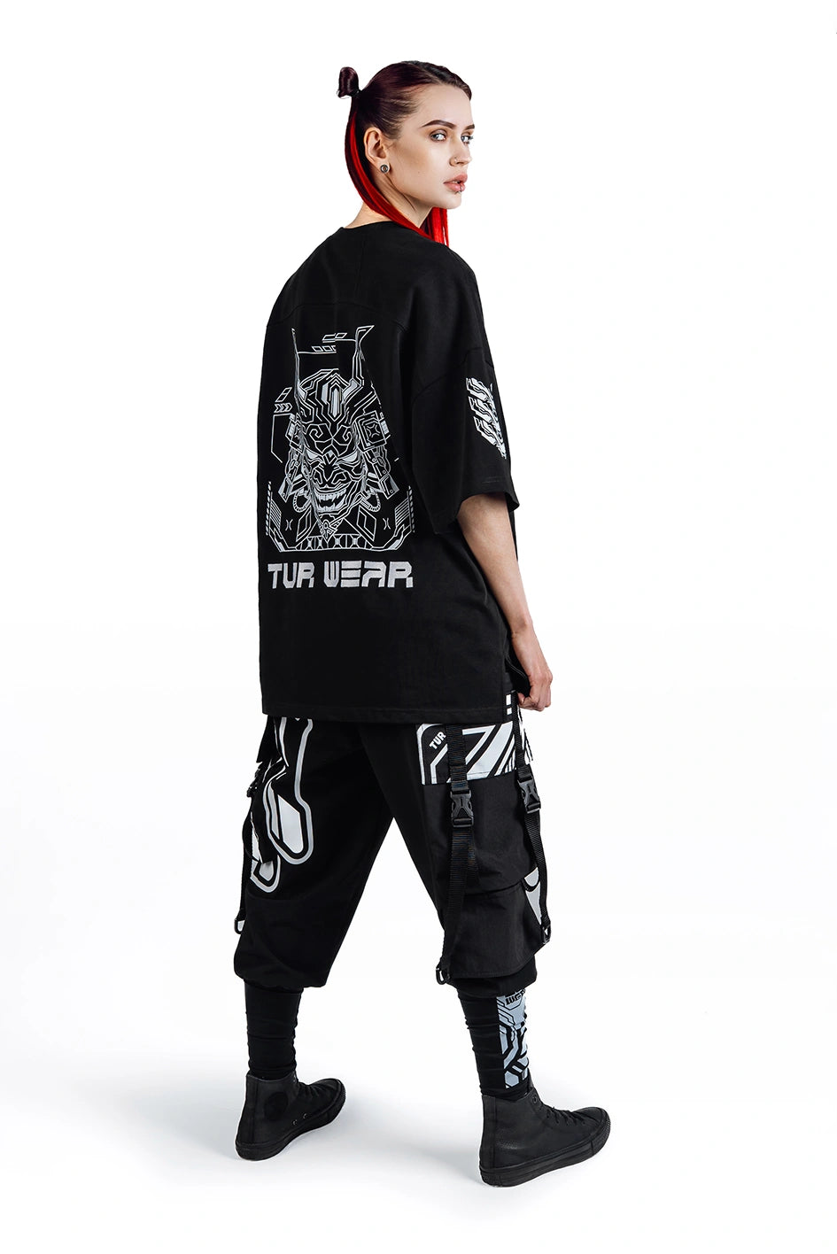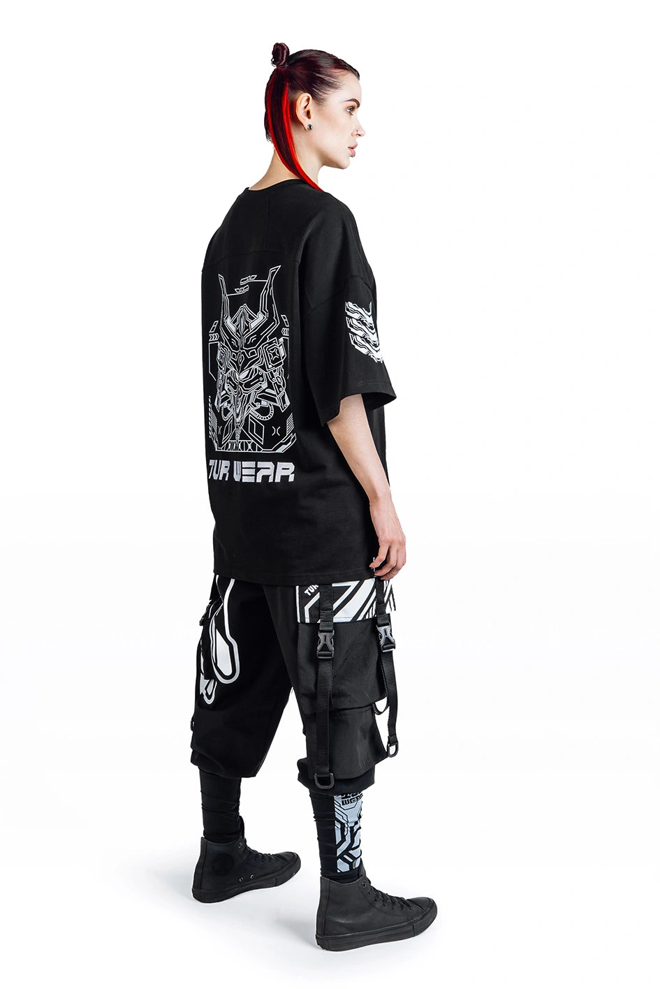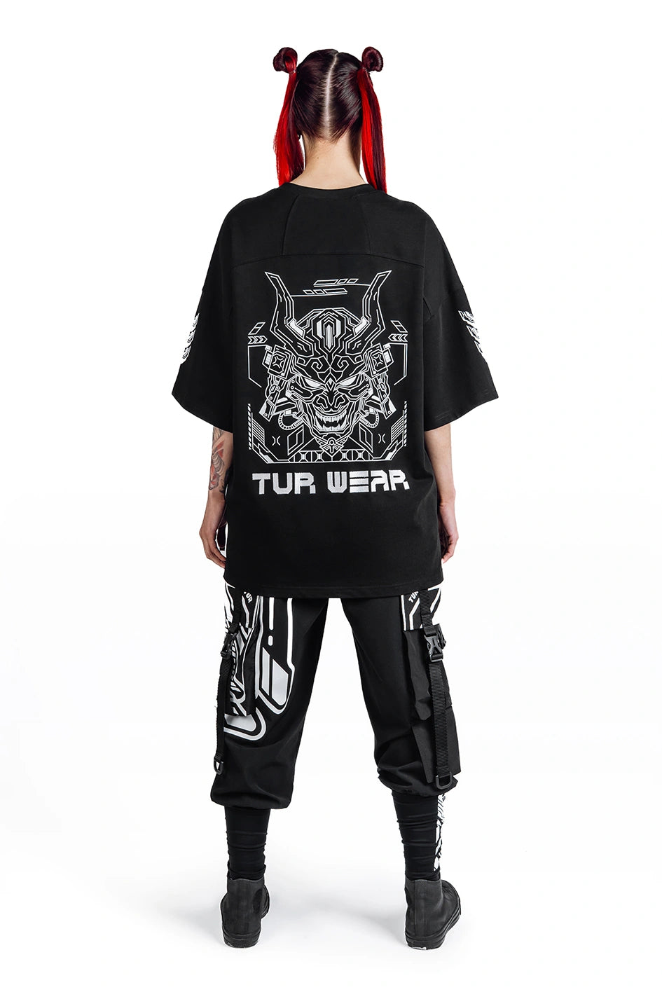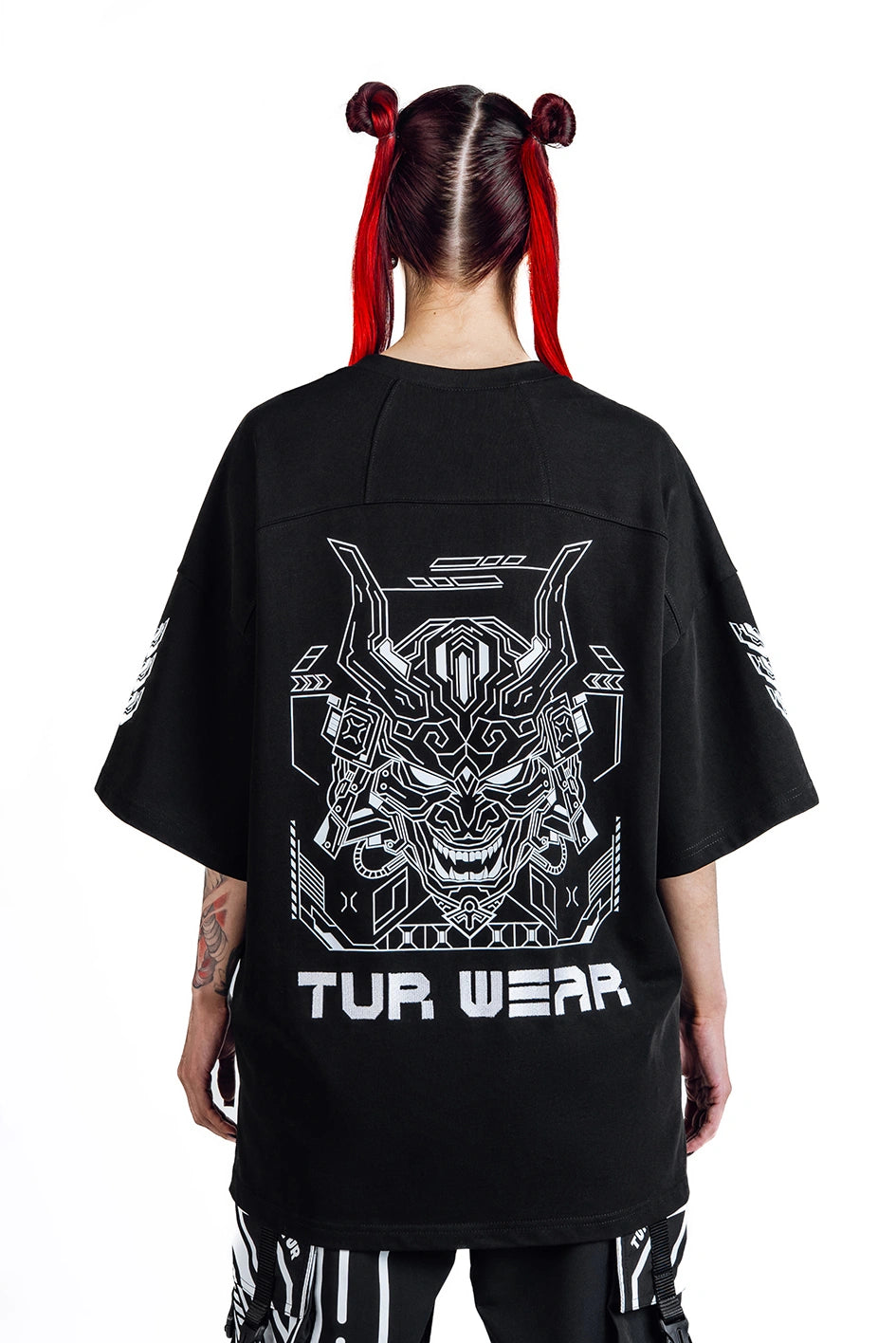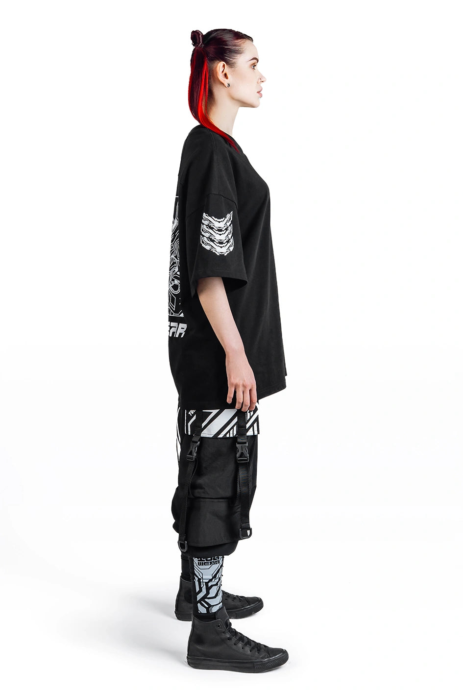 Oversize-T-Shirt mit verlängerter Silhouette und asymmetrischer Länge. Der Modellname Arasaka ist von der корпорації aus dem Universum Cyberpunk 2077 inspiriert, was sich im Design widerspiegelt. Der Ausschnitt ist im Kimono-Stil gestaltet und schafft eine charakteristische Geometrie im oberen Teil des Produkts. Auf dem Rücken befindet sich ein zusätzlicher Relief-Einsatz, der die Konstruktion verstärkt und Volumen hinzufügt. An der Seite befindet sich ein Schlitz für mehr Bewegungsfreiheit und bessere Passform. Das Modell wird durch grafische Prints und Stickerei ergänzt, die die Cyberpunk-Ästhetik unterstreichen. Das T-Shirt passt zu Looks im Stil Cyberpunk, Urban Samurai sowie zur alltäglichen urbanen Garderobe.