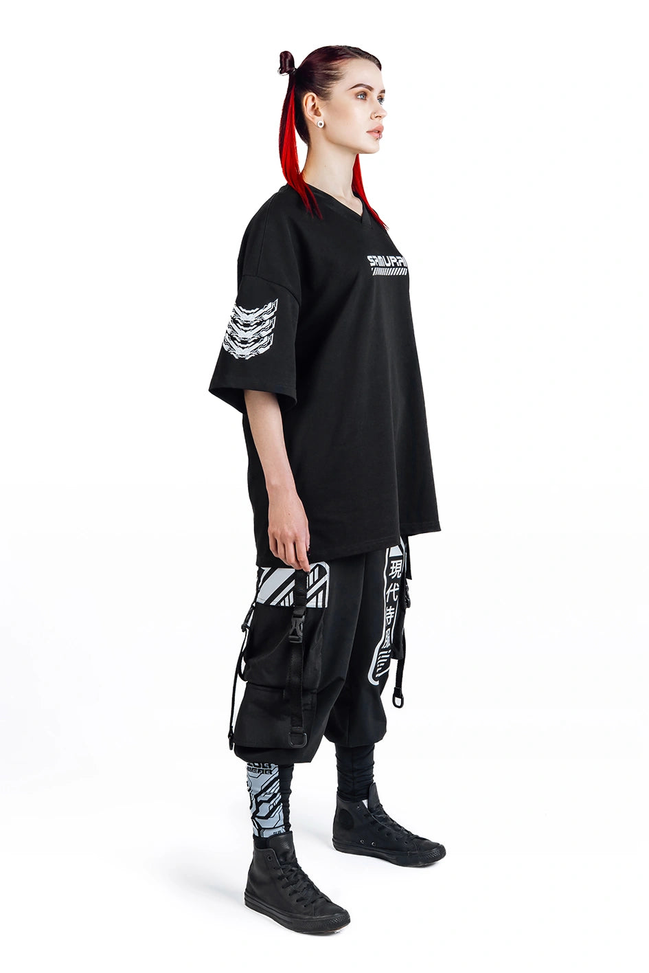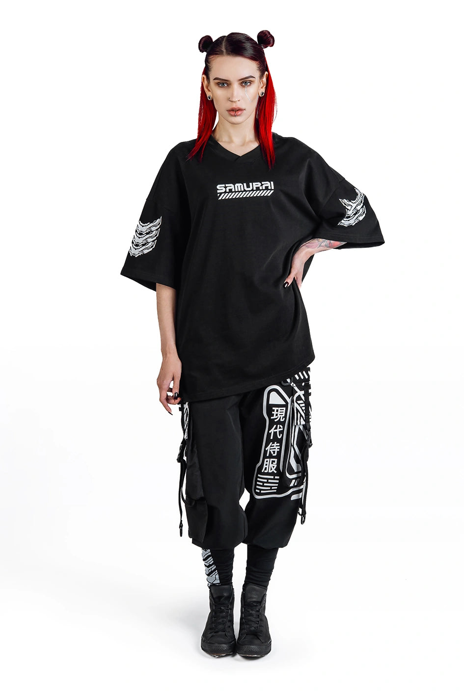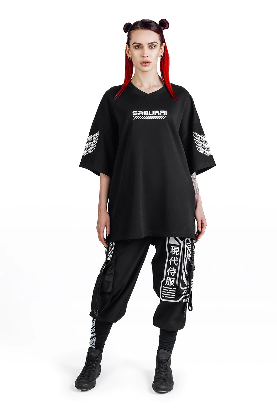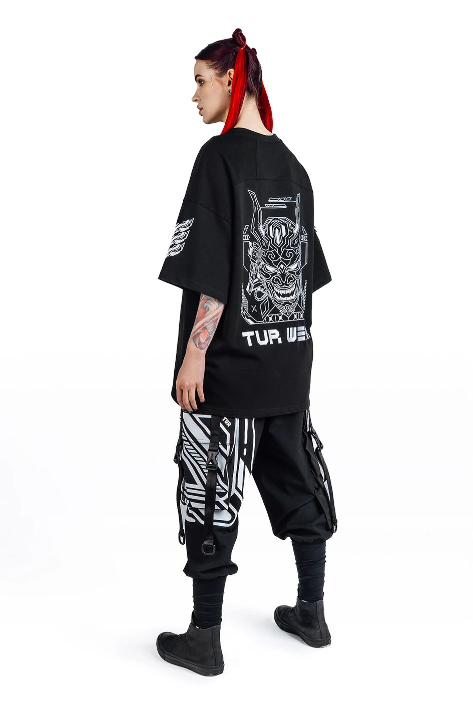Oversize-T-Shirt mit verlängerter Silhouette und asymmetrischer Länge. Der Modellname Arasaka ist von der корпорації aus dem Universum Cyberpunk 2077 inspiriert, was sich im Design widerspiegelt. Der Ausschnitt ist im Kimono-Stil gestaltet und schafft eine charakteristische Geometrie im oberen Teil des Produkts. Auf dem Rücken befindet sich ein zusätzlicher Relief-Einsatz, der die Konstruktion verstärkt und Volumen hinzufügt. An der Seite befindet sich ein Schlitz für mehr Bewegungsfreiheit und bessere Passform. Das Modell wird durch grafische Prints und Stickerei ergänzt, die die Cyberpunk-Ästhetik unterstreichen. Das T-Shirt passt zu Looks im Stil Cyberpunk, Urban Samurai sowie zur alltäglichen urbanen Garderobe.