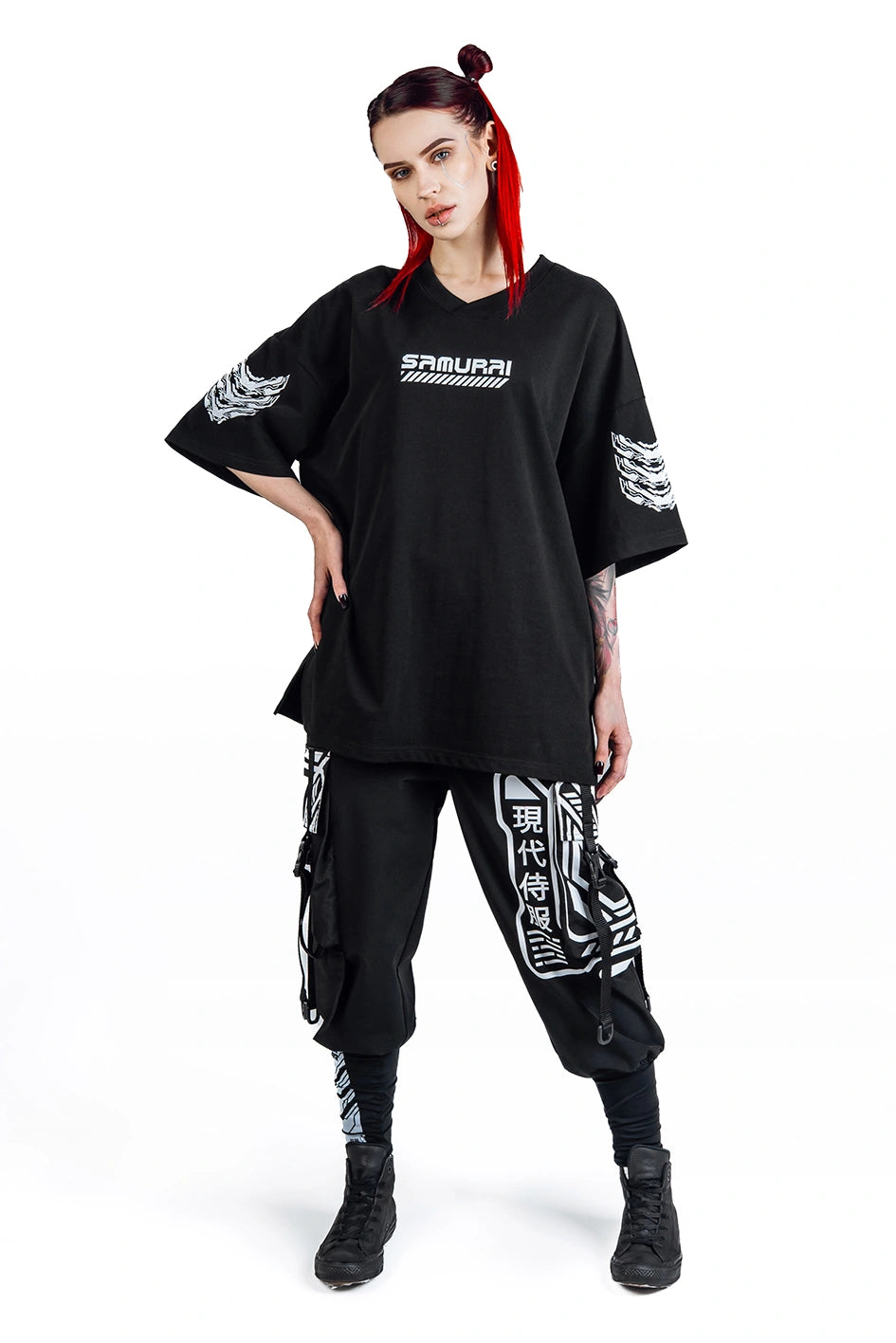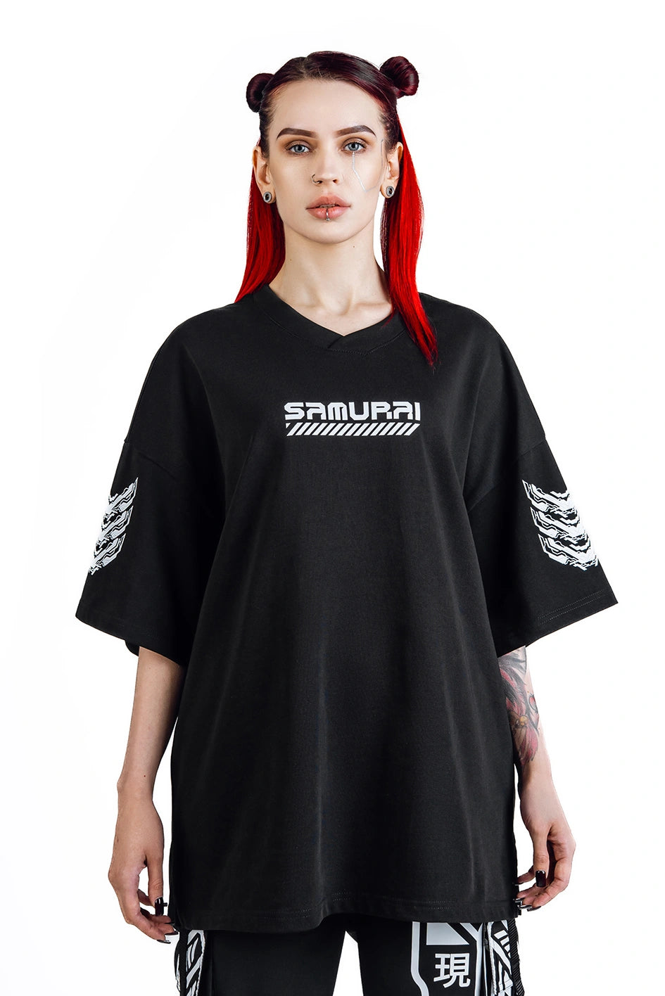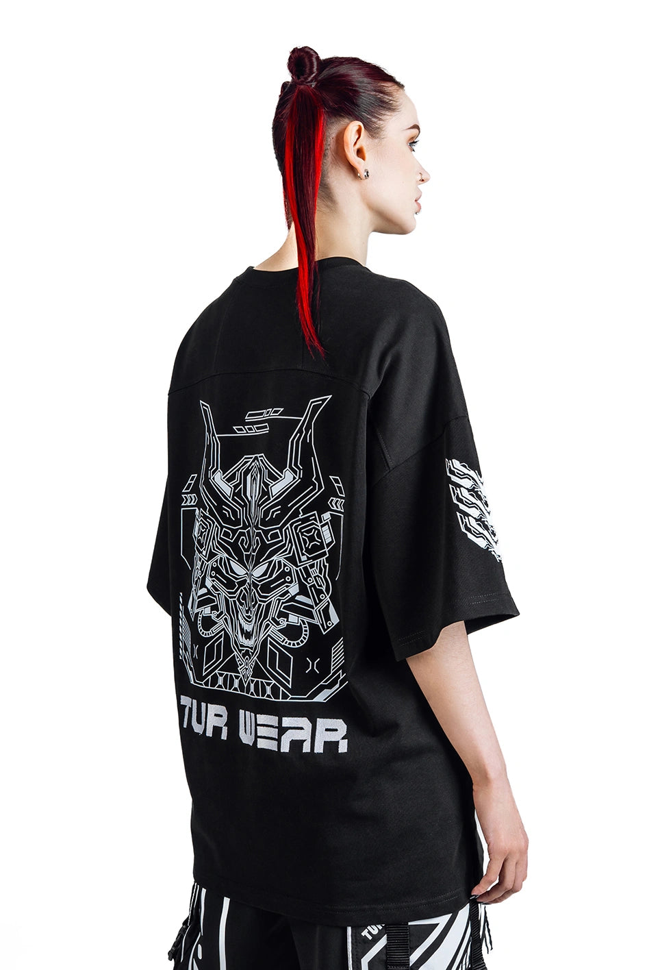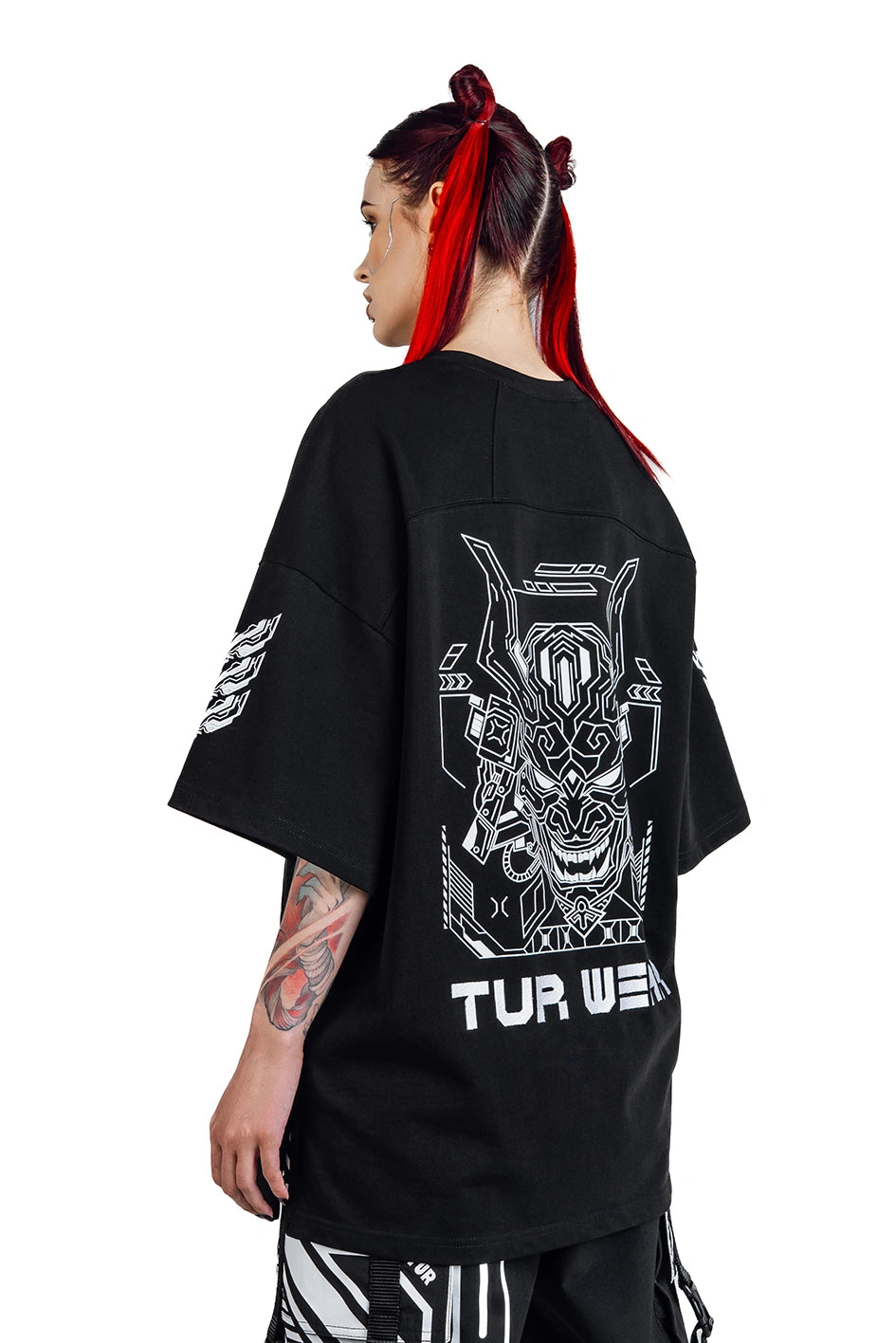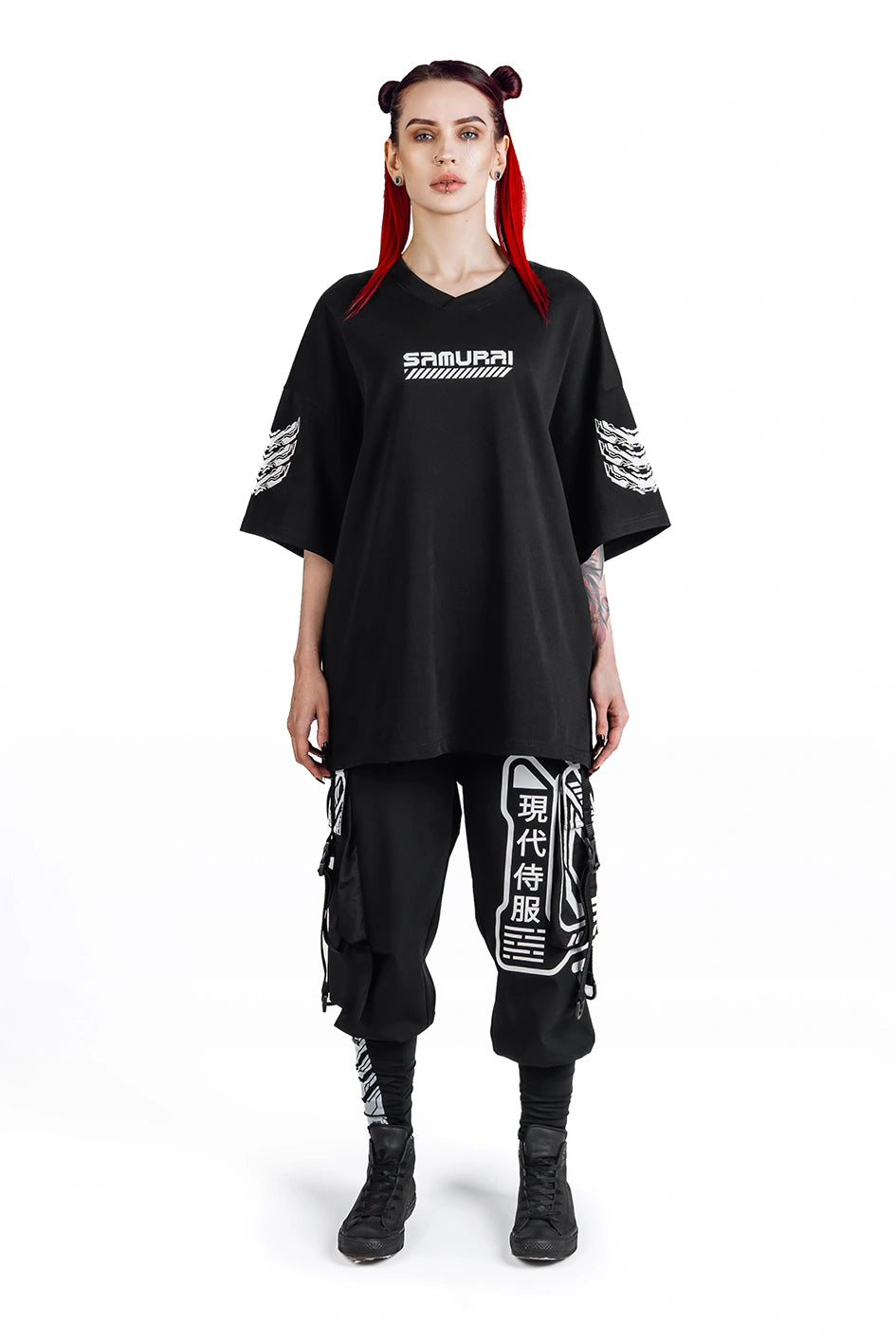 Oversize-T-Shirt mit verlängerter Silhouette und asymmetrischer Länge. Der Modellname Arasaka ist von der корпорації aus dem Universum Cyberpunk 2077 inspiriert, was sich im Design widerspiegelt. Der Ausschnitt ist im Kimono-Stil gestaltet und schafft eine charakteristische Geometrie im oberen Teil des Produkts. Auf dem Rücken befindet sich ein zusätzlicher Relief-Einsatz, der die Konstruktion verstärkt und Volumen hinzufügt. An der Seite befindet sich ein Schlitz für mehr Bewegungsfreiheit und bessere Passform. Das Modell wird durch grafische Prints und Stickerei ergänzt, die die Cyberpunk-Ästhetik unterstreichen. Das T-Shirt passt zu Looks im Stil Cyberpunk, Urban Samurai sowie zur alltäglichen urbanen Garderobe.