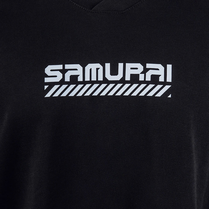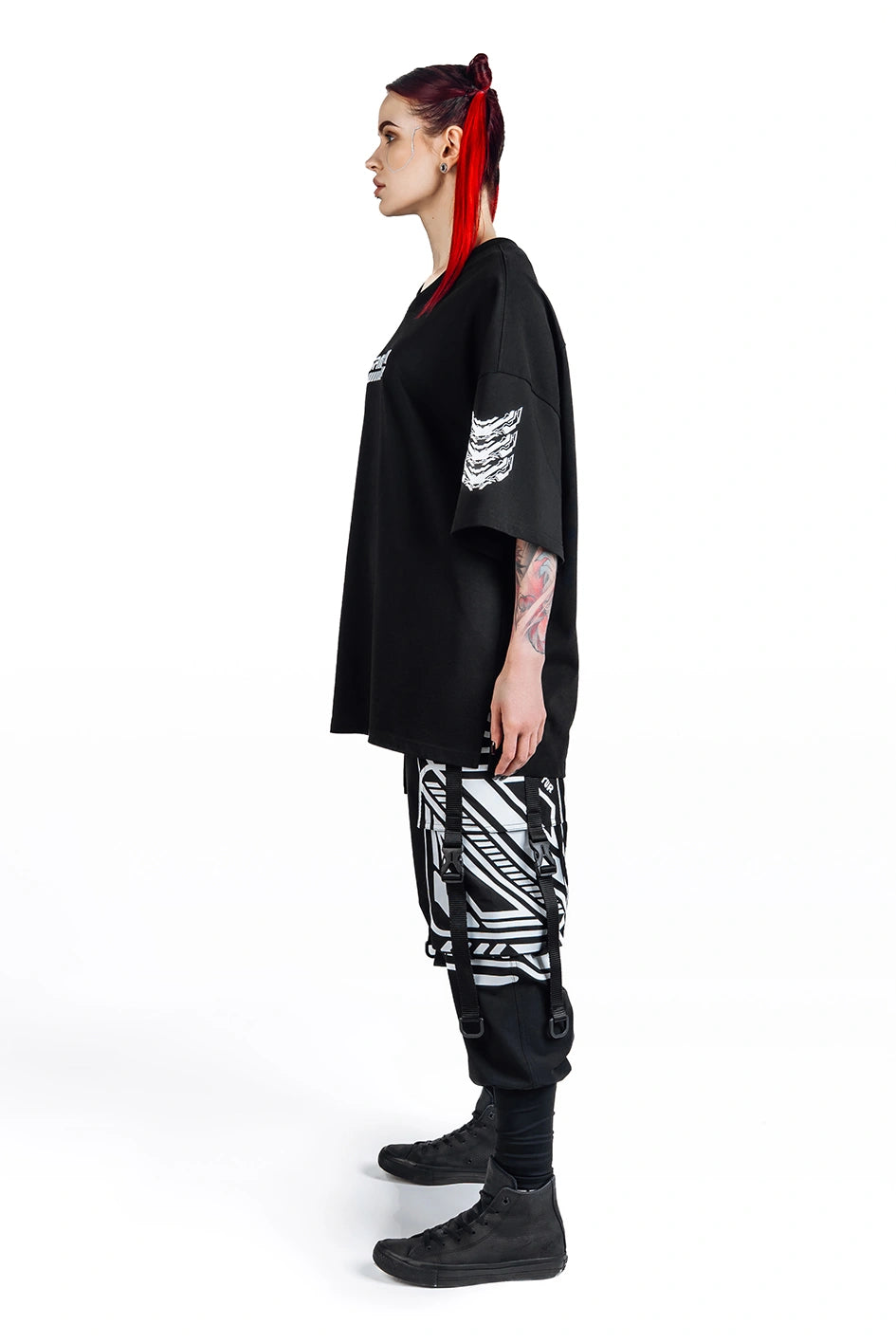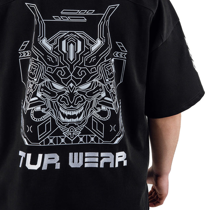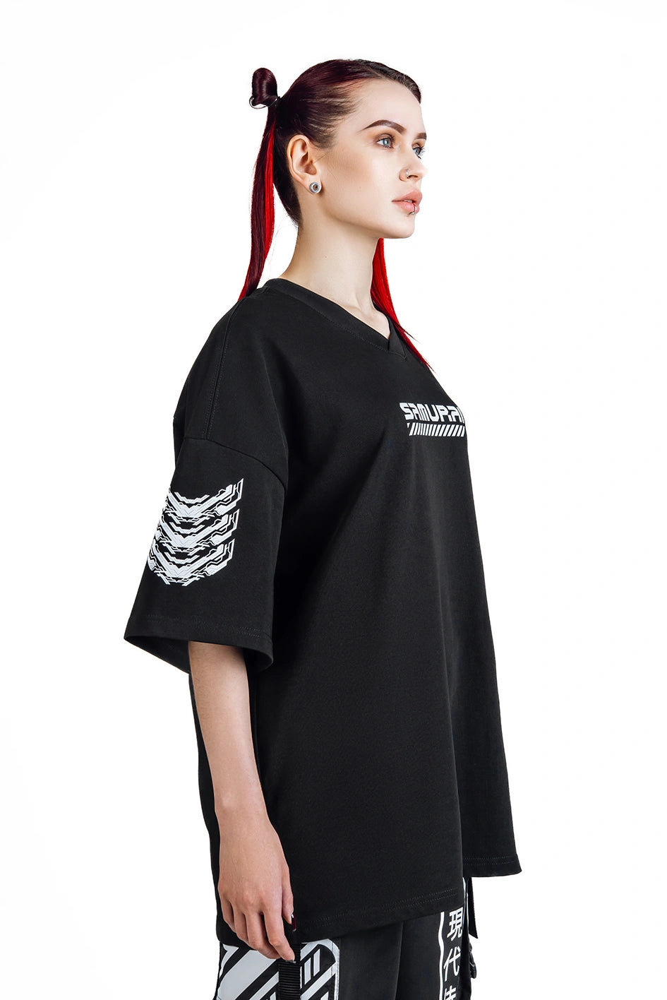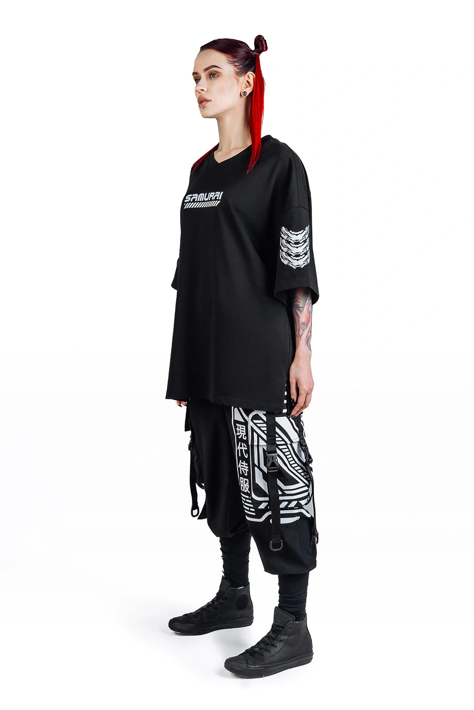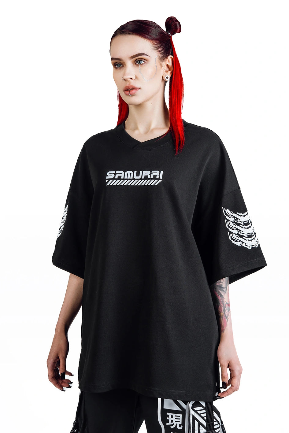 Oversize-T-Shirt mit verlängerter Silhouette und asymmetrischer Länge. Der Modellname Arasaka ist von der корпорації aus dem Universum Cyberpunk 2077 inspiriert, was sich im Design widerspiegelt. Der Ausschnitt ist im Kimono-Stil gestaltet und schafft eine charakteristische Geometrie im oberen Teil des Produkts. Auf dem Rücken befindet sich ein zusätzlicher Relief-Einsatz, der die Konstruktion verstärkt und Volumen hinzufügt. An der Seite befindet sich ein Schlitz für mehr Bewegungsfreiheit und bessere Passform. Das Modell wird durch grafische Prints und Stickerei ergänzt, die die Cyberpunk-Ästhetik unterstreichen. Das T-Shirt passt zu Looks im Stil Cyberpunk, Urban Samurai sowie zur alltäglichen urbanen Garderobe.