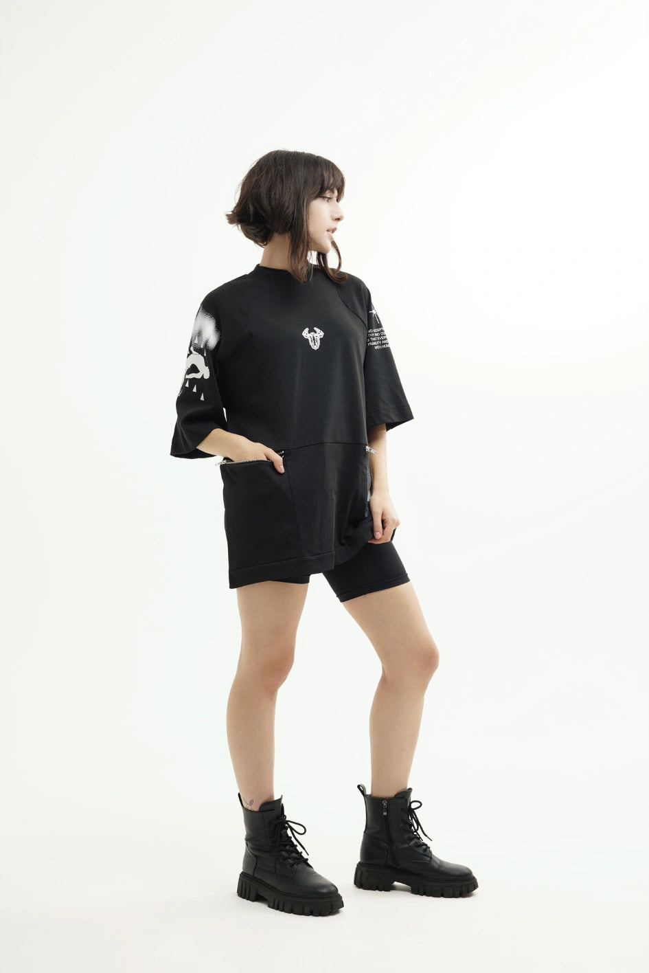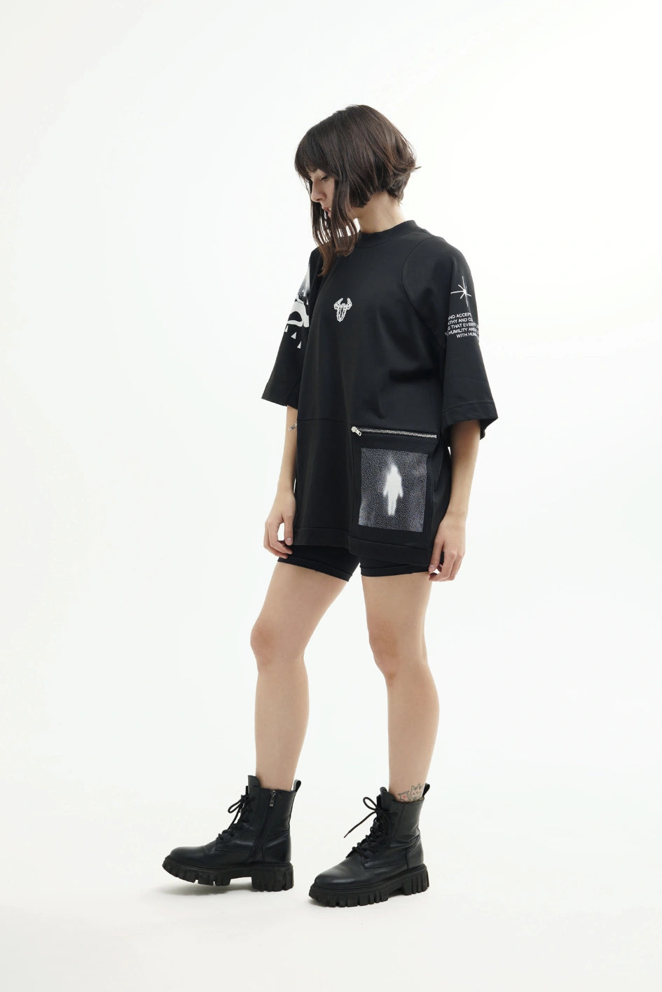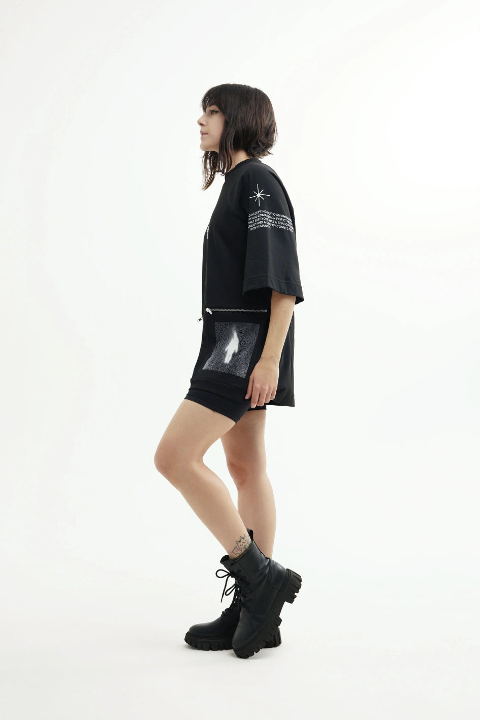 Lang geschnittenes T-Shirt aus dichtem Jersey, das Komfort und modernen Stil vereint. Auf der Vorderseite befinden sich zwei aufgesetzte Reißverschlusstaschen, die eine bequeme Aufbewahrung kleiner Gegenstände ermöglichen. Das Modell ist mit fünf weißen Aufdrucken versehen, die ihm Ausdruck und individuellen Charakter verleihen. Eine perfekte Wahl für alle, die Bequemlichkeit und modernes Design im Alltag schätzen.