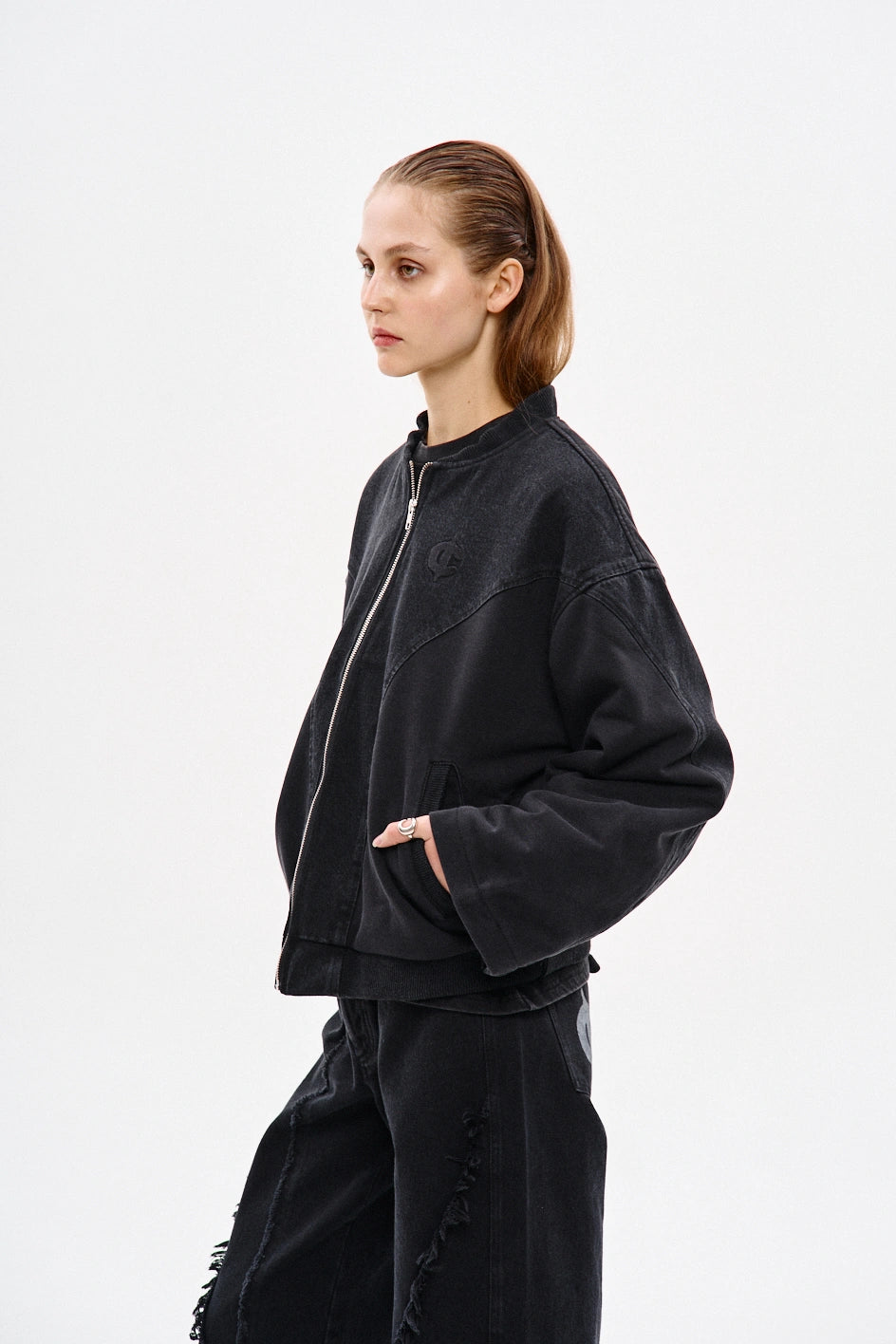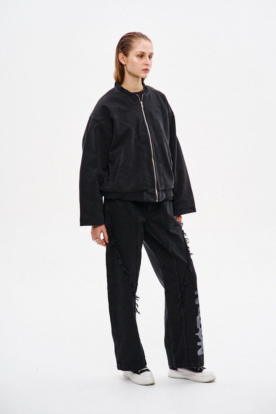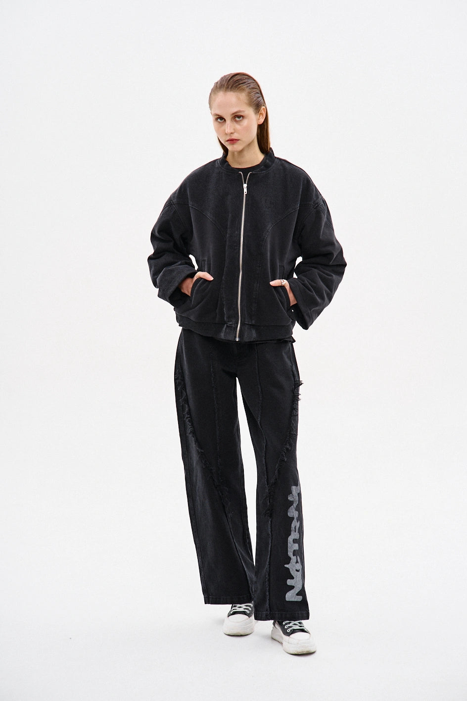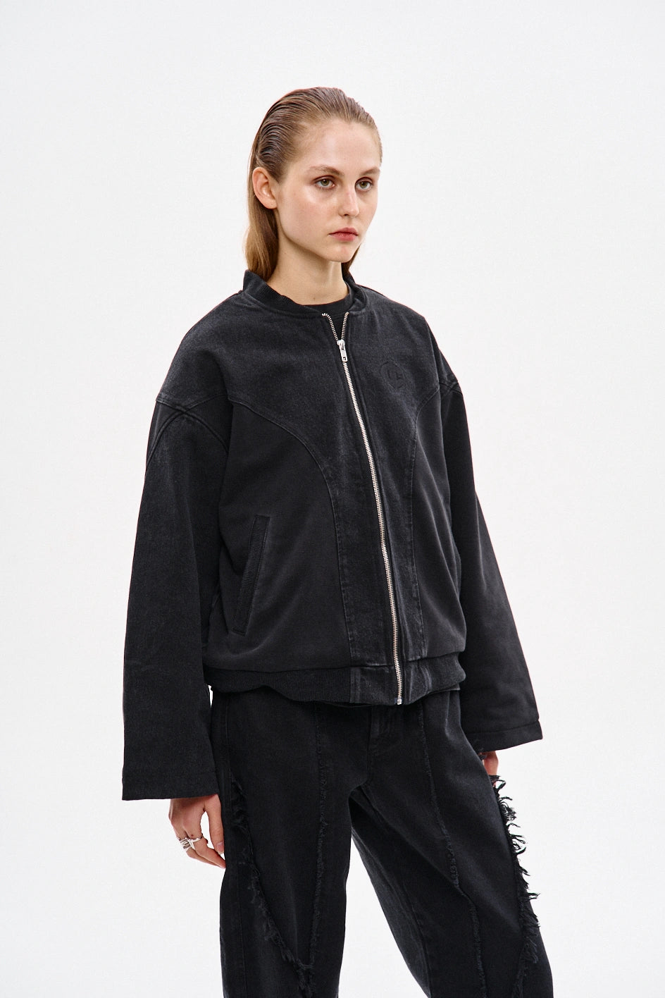 Damen-Bomberjacke im Oversize-Schnitt, gefertigt aus Denim und dichtem Strick, der einem industriellen Waschprozess unterzogen wurde. Die Ärmel weisen eine asymmetrische Stoffkombination auf, die der Silhouette Dynamik verleiht. Kragen, Saum und Taschenleisten bestehen aus dichtem Rippstrick. Innen befindet sich eine Tasche im Futter. Zentraler Verschluss – Metallreißverschluss. Das gestickte Markenlogo befindet sich auf der linken Vorderseite und im unteren Rückenbereich – dezent, aber charakterstark.