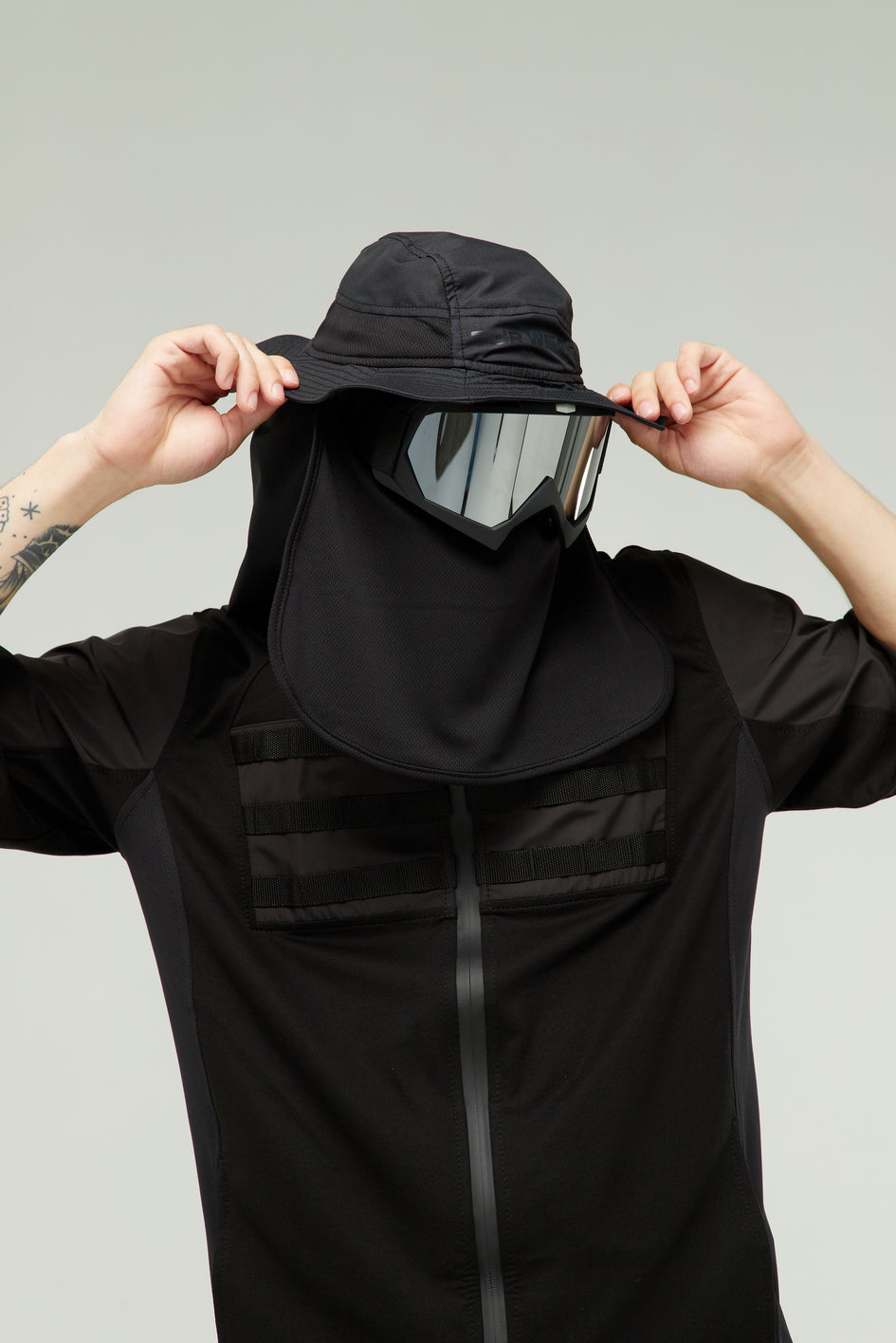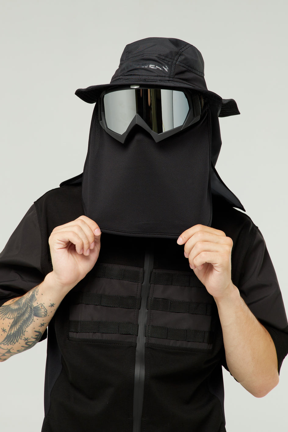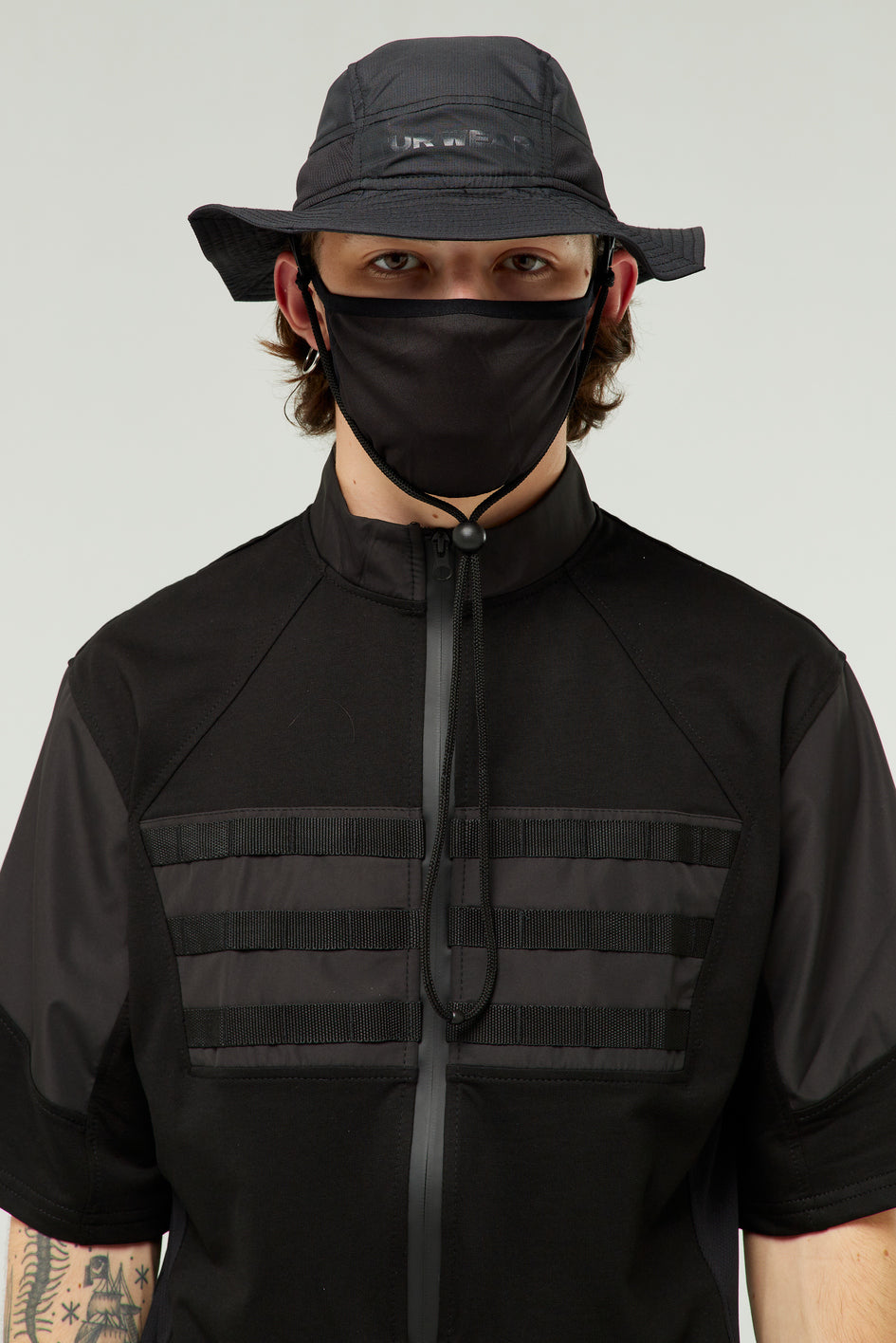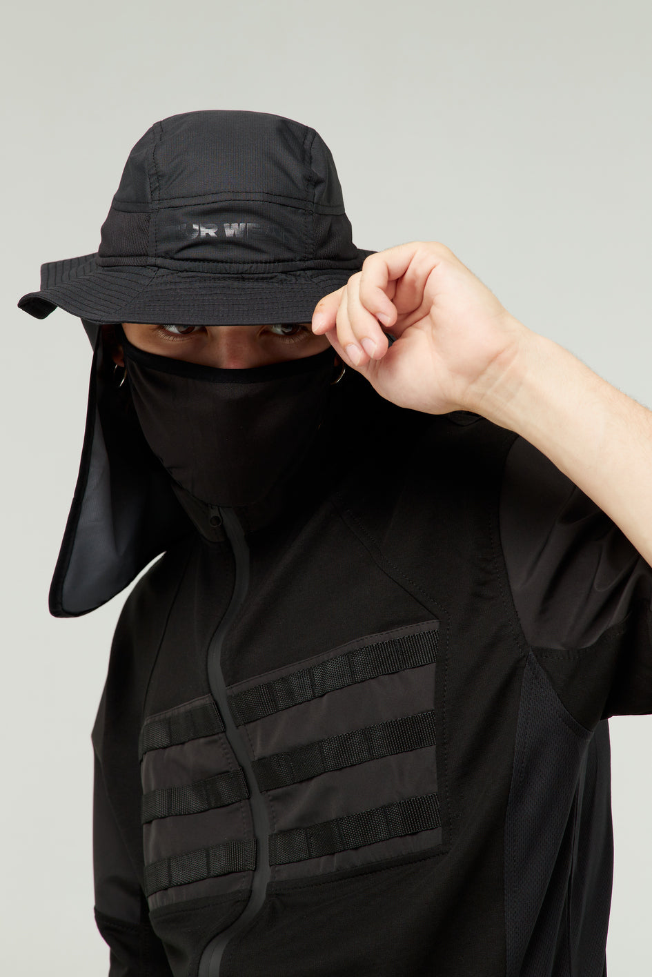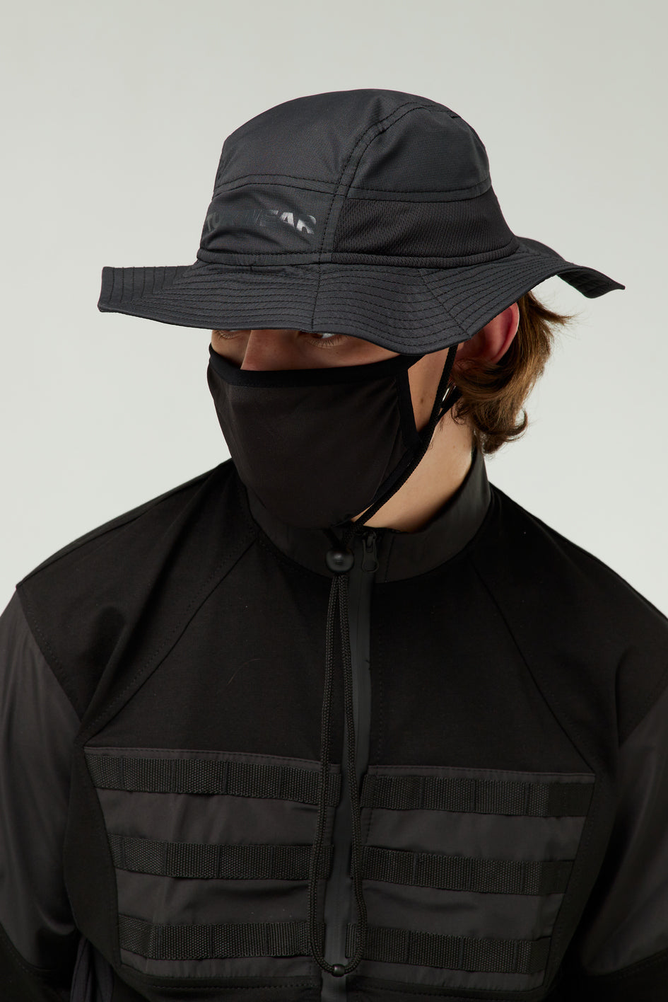 Fischerhut aus dünnem, wasserabweisendem Material mit Mesh-Einsätzen an den Seiten für Belüftung. Innenfutter aus Baumwolle. Vorne schwarzer Print „TUR WEAR“. Zum Hut gehört ein Mesh-Schutz für komfortables Atmen, hinten ein Ripstop-Schutz sowie eine Kordel für bequemes Tragen (Schutz und Kordel sind abnehmbar).