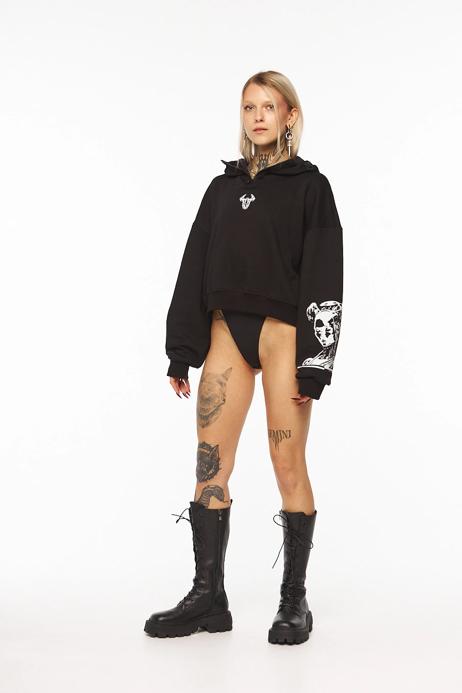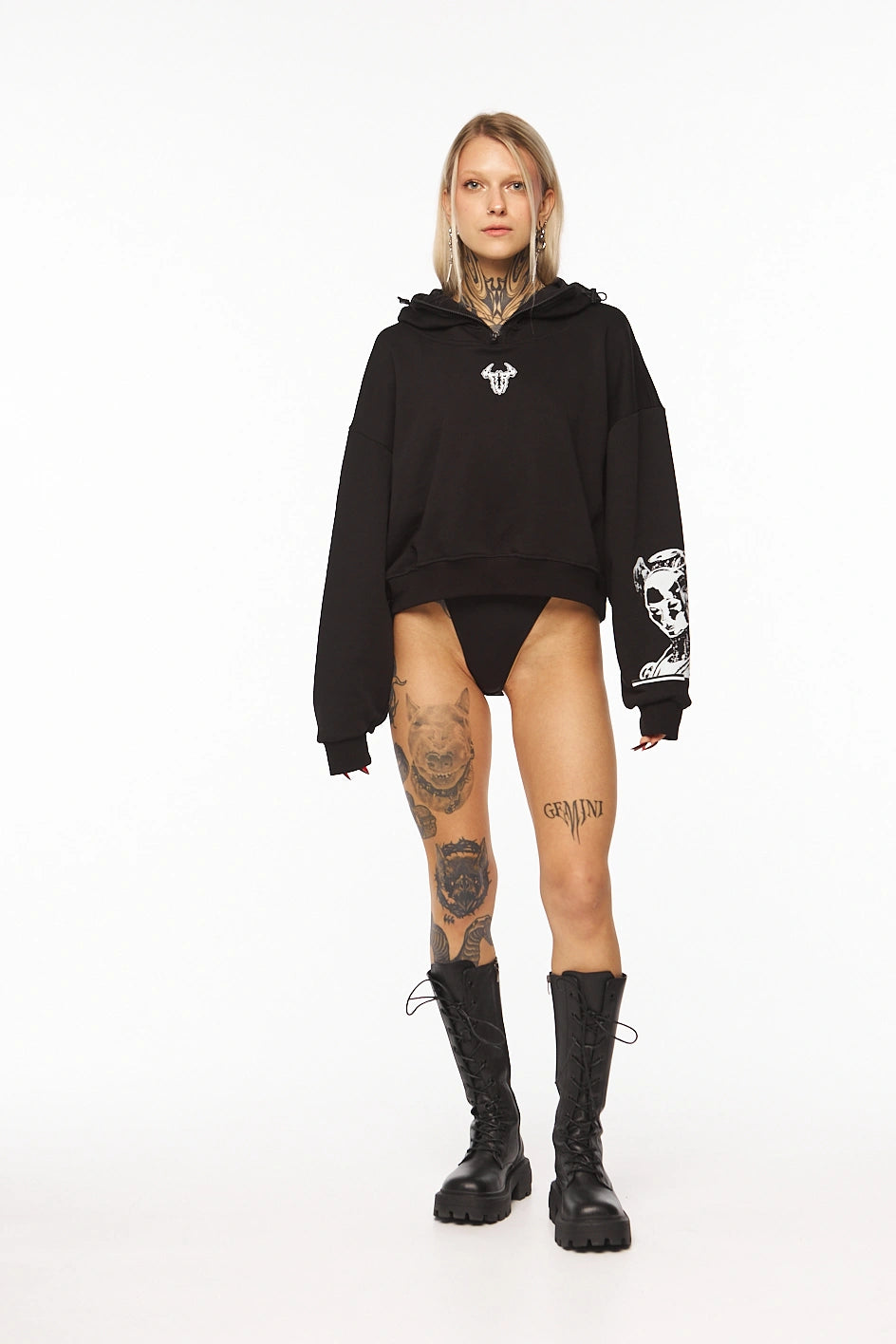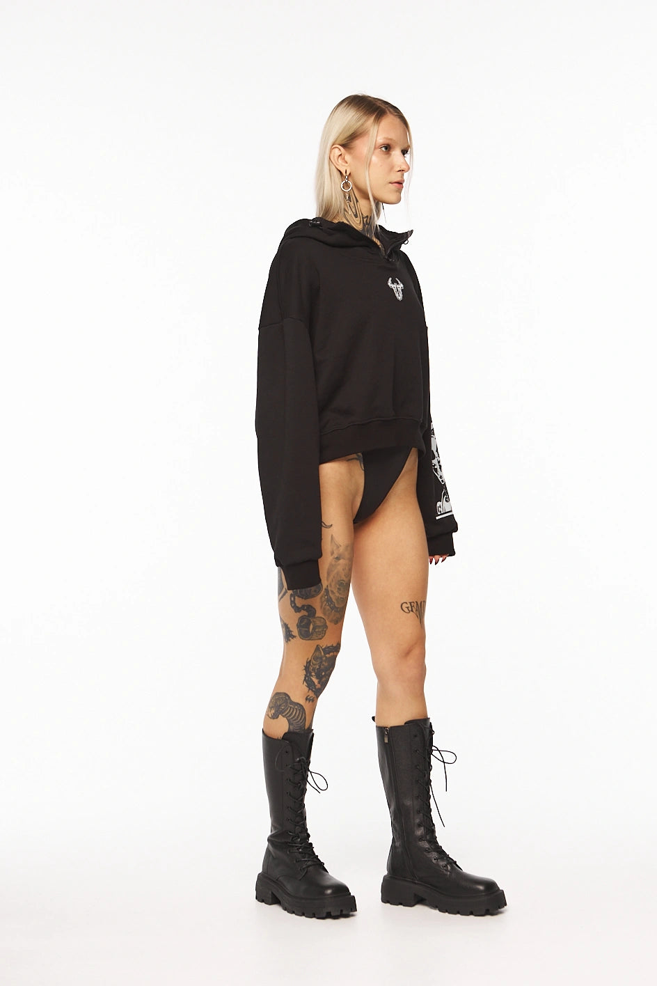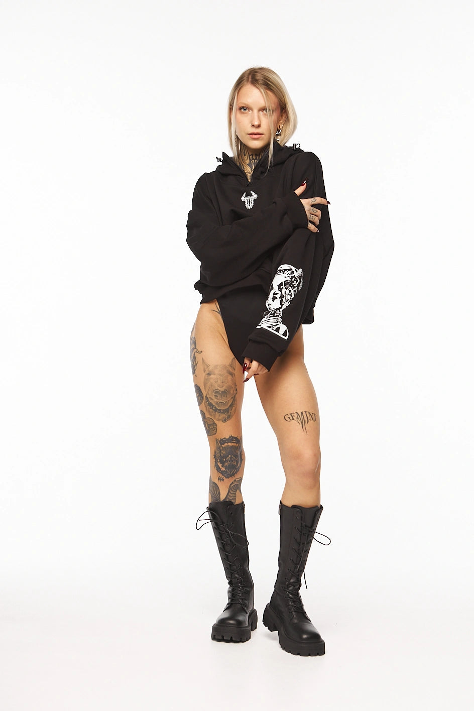 Hoodie-Body mit weitem Schnitt, bestehend aus zwei Teilen: das Oberteil aus dichtem Strick mit Kapuze und hohem Ausschnitt mit Reißverschluss, das Unterteil als Body-Imitation aus Biflex-Stoff mit Knopfverschluss am unteren Ende. Verziert mit 3 weißen Prints.