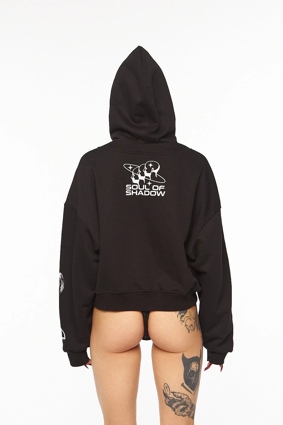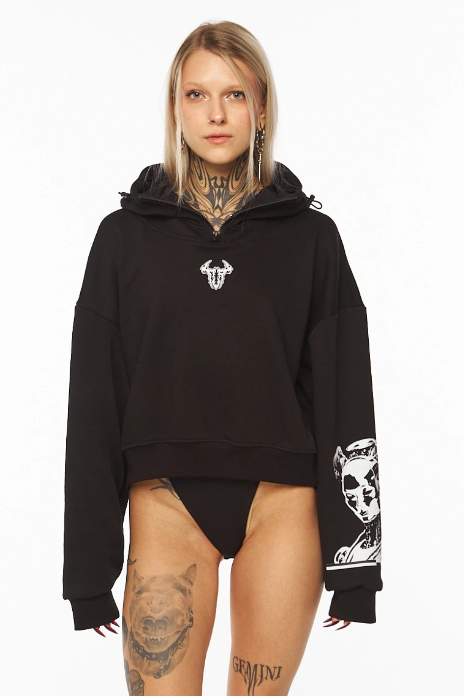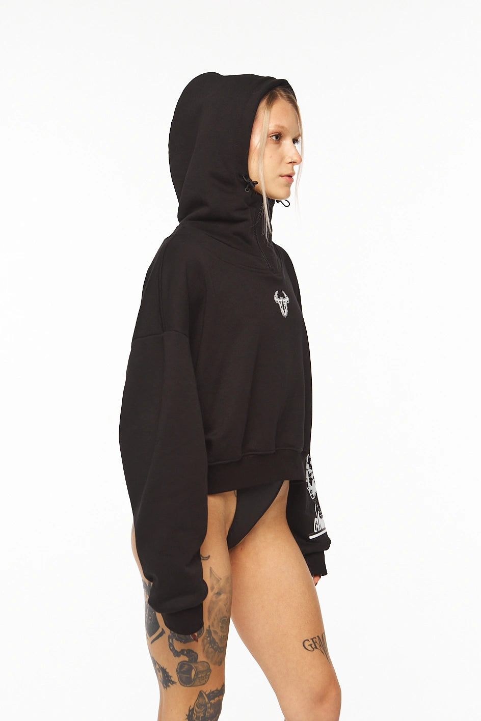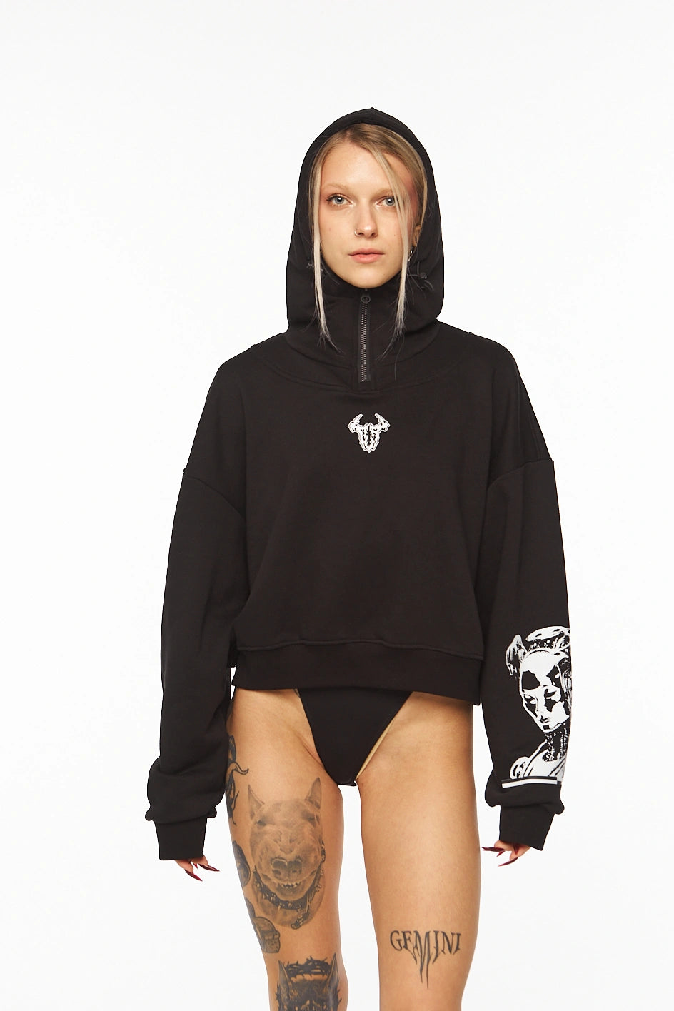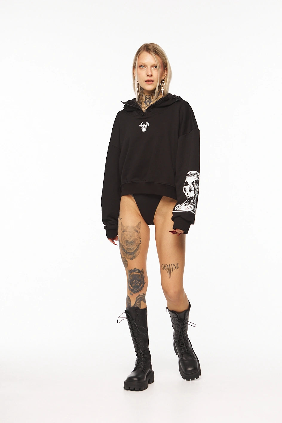 Hoodie-Body mit weitem Schnitt, bestehend aus zwei Teilen: das Oberteil aus dichtem Strick mit Kapuze und hohem Ausschnitt mit Reißverschluss, das Unterteil als Body-Imitation aus Biflex-Stoff mit Knopfverschluss am unteren Ende. Verziert mit 3 weißen Prints.