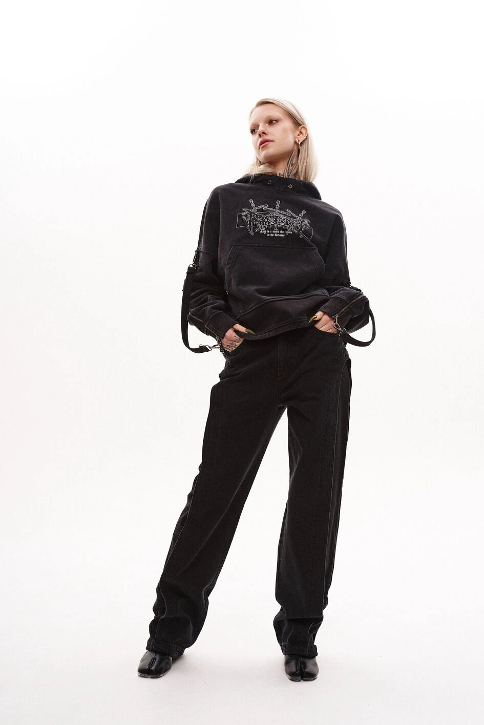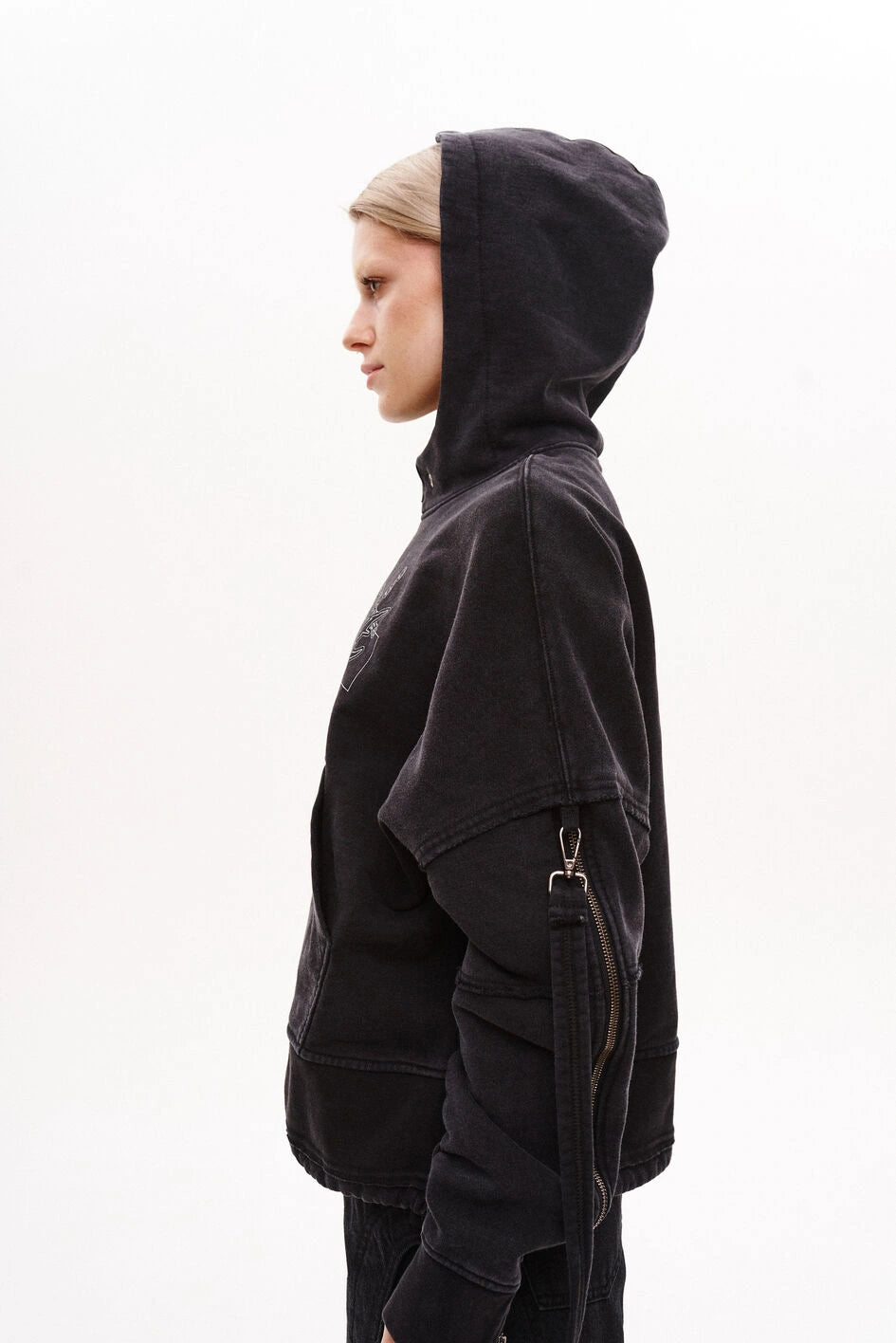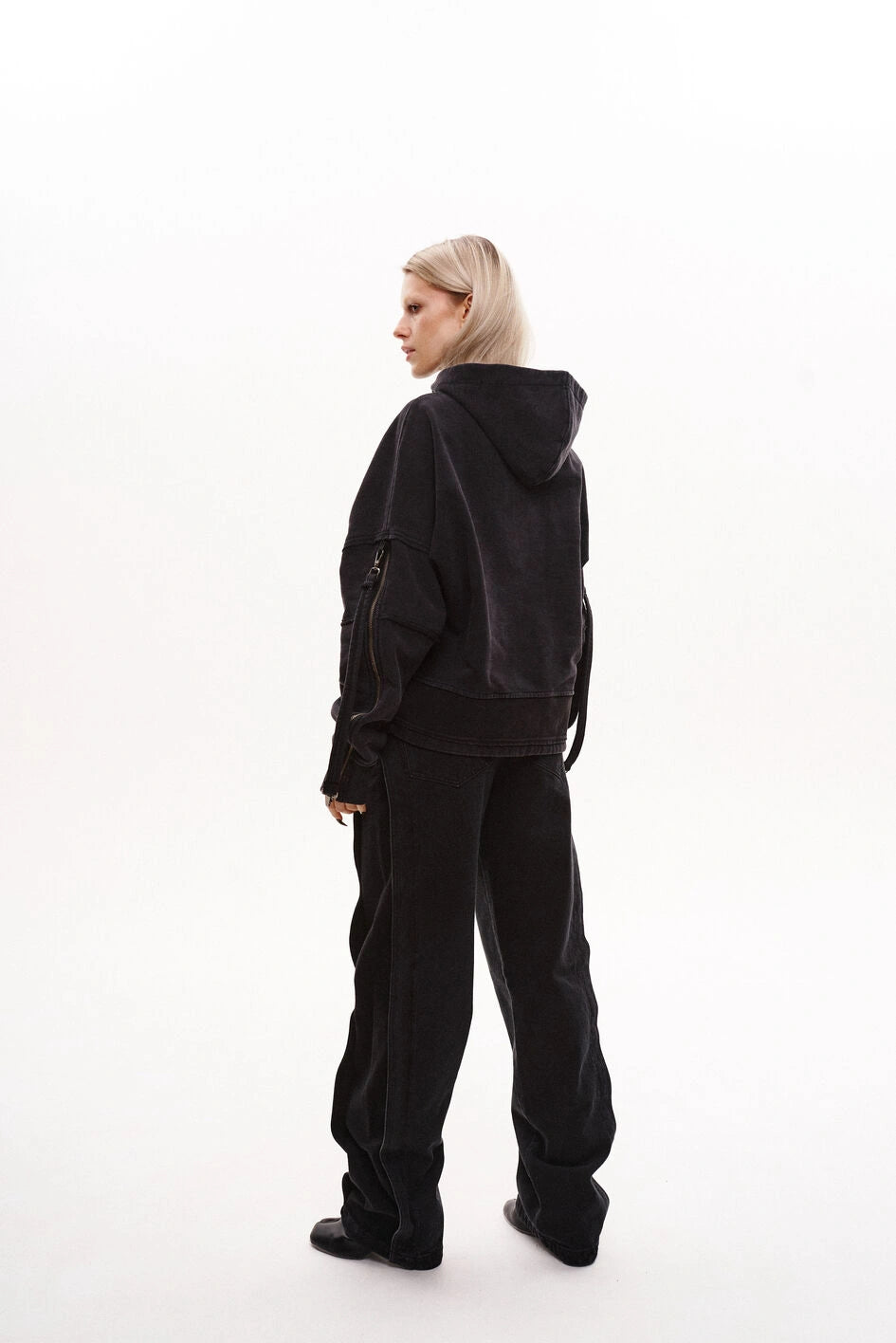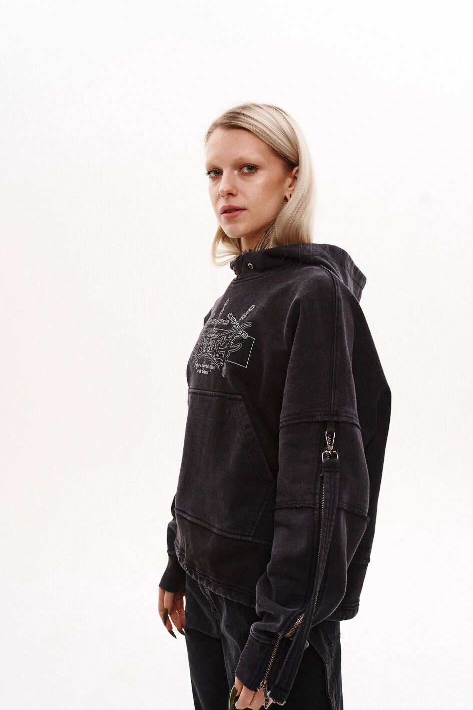 Oversize-Hoodie aus dicht gewebtem Strick (500 g/m²). Für den ausgewaschenen Farbeffekt wurde der Stoff industriell gewaschen. Die Kapuze hat eine einfache Naht und einen kleinen dreieckigen Einsatz aus Band vorne. Der untere Saum besteht aus zwei Teilen eines Bandes (vorne und hinten), deren untere Enden offen sind; dazwischen befindet sich ein Tunnel aus dem Hauptmaterial mit rundem Gummizug und Stoppern im Bereich der Seitennähte. Armausschnitt und horizontale Ärmelreliefs haben offene Ausschnitte. In der Mitte des Ärmels, von der Achsel bis zum Saum, befindet sich ein Metallreißverschluss. Eine Schlaufe für einen Karabiner mit dekorativem Band aus dem Hauptmaterial ist am Armausschnitt oberhalb des Reißverschlusses angebracht. Vorne befindet sich eine Kängurutasche.