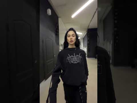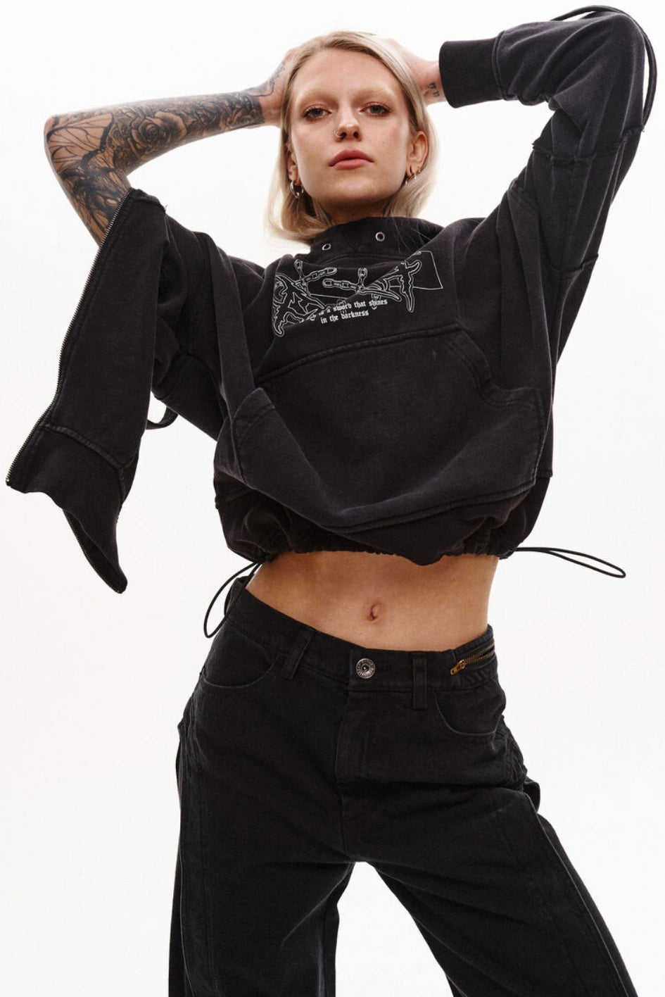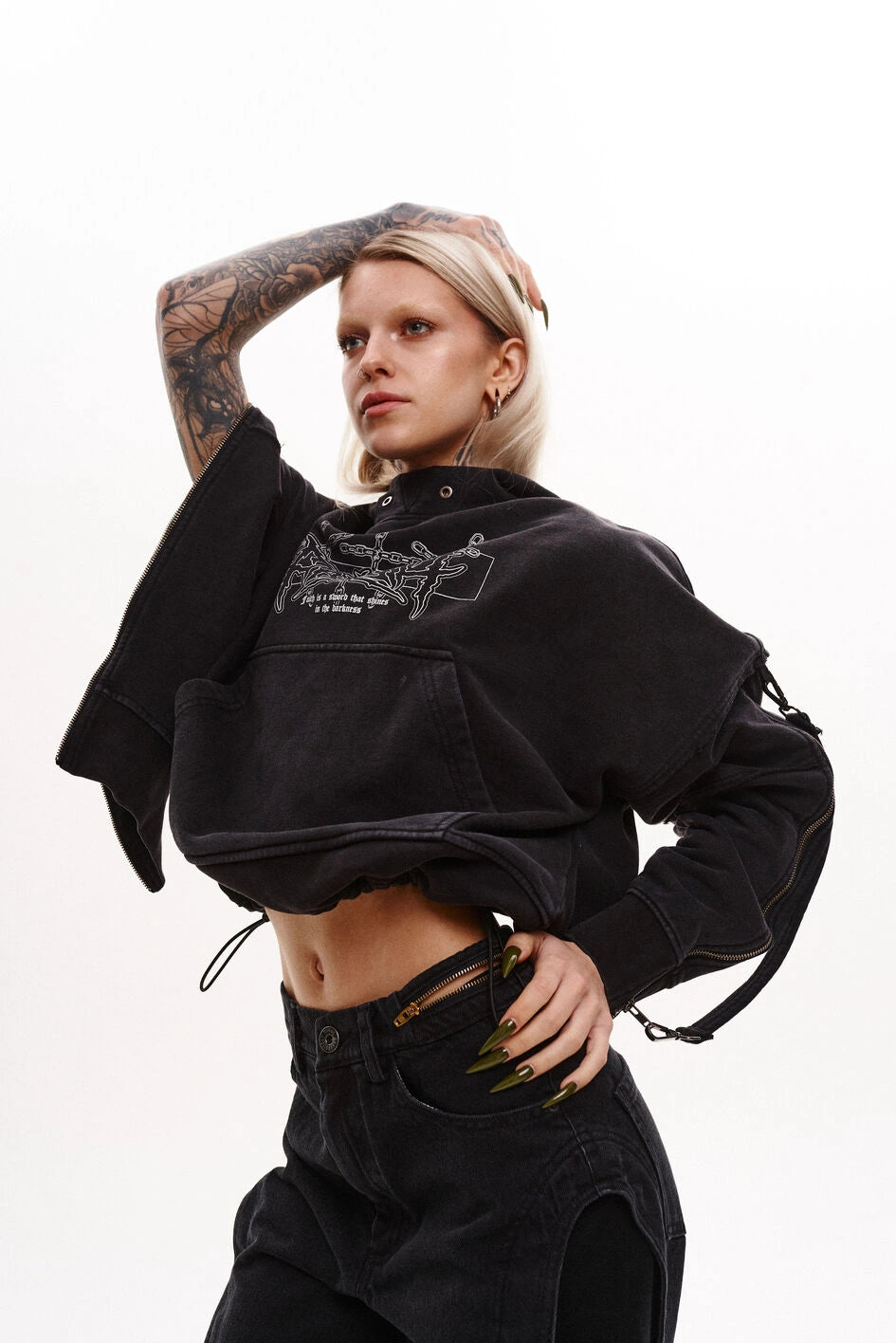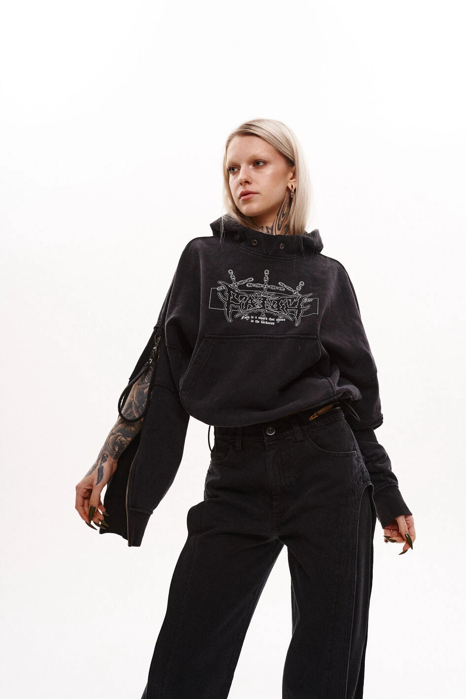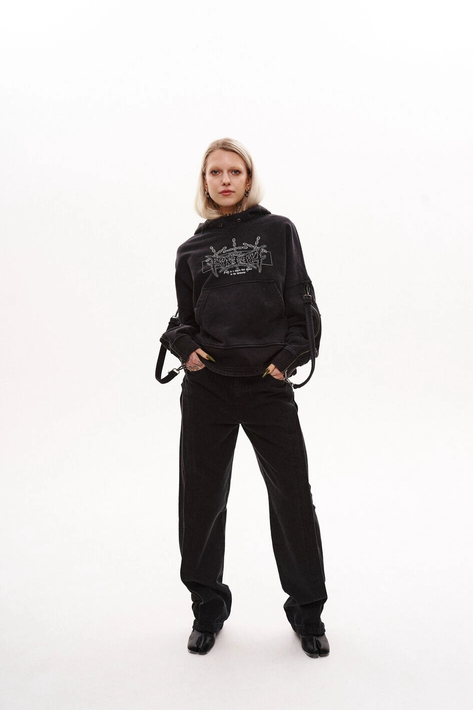 Oversize-Hoodie aus dicht gewebtem Strick (500 g/m²). Für den ausgewaschenen Farbeffekt wurde der Stoff industriell gewaschen. Die Kapuze hat eine einfache Naht und einen kleinen dreieckigen Einsatz aus Band vorne. Der untere Saum besteht aus zwei Teilen eines Bandes (vorne und hinten), deren untere Enden offen sind; dazwischen befindet sich ein Tunnel aus dem Hauptmaterial mit rundem Gummizug und Stoppern im Bereich der Seitennähte. Armausschnitt und horizontale Ärmelreliefs haben offene Ausschnitte. In der Mitte des Ärmels, von der Achsel bis zum Saum, befindet sich ein Metallreißverschluss. Eine Schlaufe für einen Karabiner mit dekorativem Band aus dem Hauptmaterial ist am Armausschnitt oberhalb des Reißverschlusses angebracht. Vorne befindet sich eine Kängurutasche.