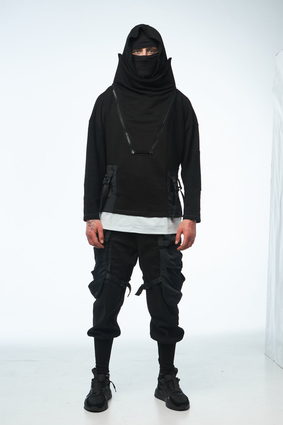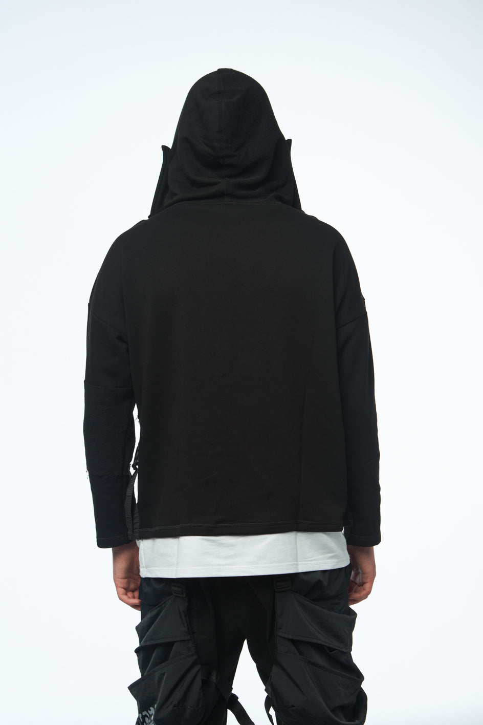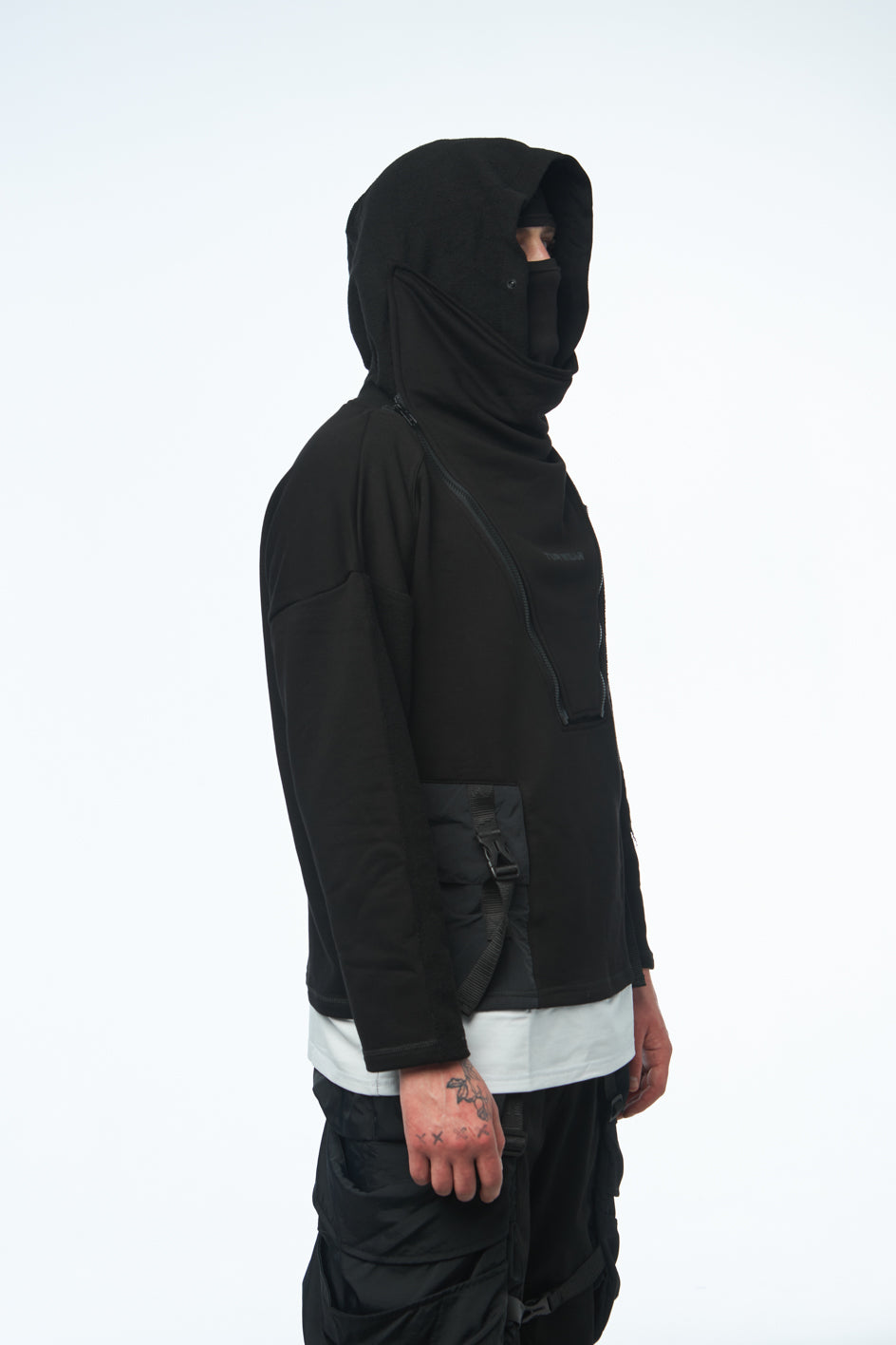 Oversize-Hoodie mit hohem Kragen. Am unteren Saum ist weißer Stoff eingenäht, der ein T-Shirt imitiert. Am unteren Teil befinden sich zwei eingesetzte Taschen mit Klappen aus Jacquard. Die Klappen werden mit Schnallen verschlossen. Die Vorderseite der Kapuze ist doppellagig, um die Form besser zu halten. Funktionaler schwarzer „Tur wear“-Print auf der Brust.