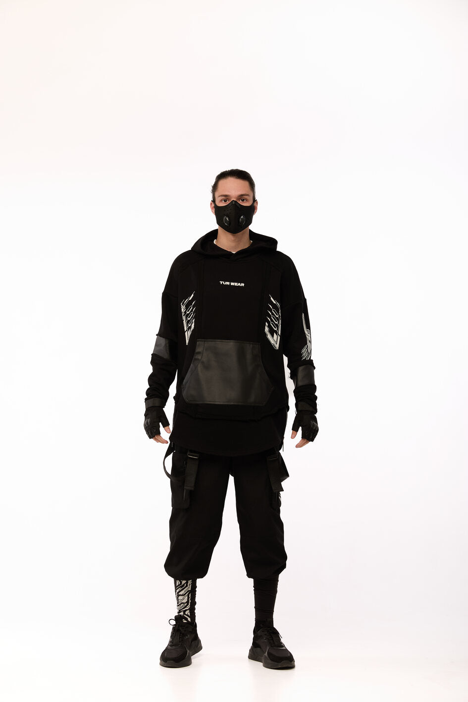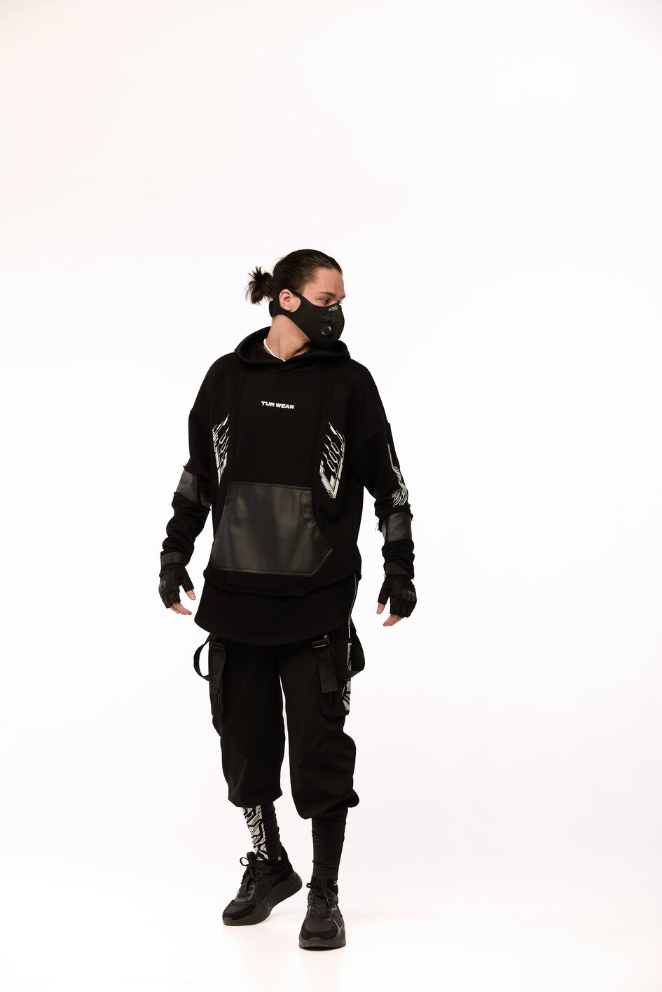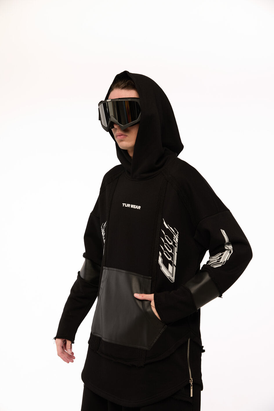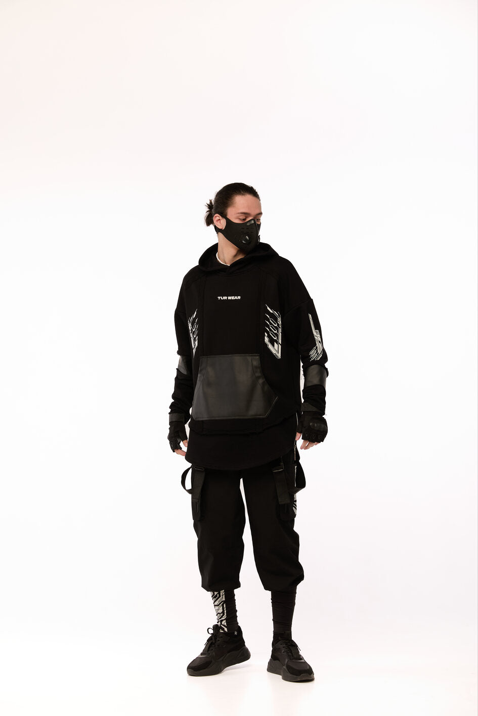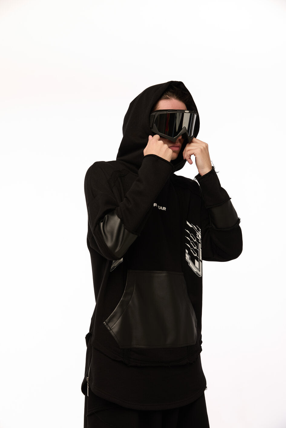 Oversize-Hoodie mit dekorativen Nähten und rohen Kanten. Die aufgenähte Tasche und die Einsätze an den Ärmeln bestehen aus Kunstleder. Der untere Teil des Hoodies ist doppellagig: Die obere Schicht hat rohe Kanten, die untere ist gefüttert und hat seitliche Schlitze, in die Metallreißverschlüsse eingearbeitet sind. Auf dem Hoodie befinden sich fünf weiße Drucke: auf dem Rücken, auf der mittleren und seitlichen Vorderseite sowie am linken Ärmel. Die Kapuze ist geräumig und erinnert an die Kapuzen von Mänteln.