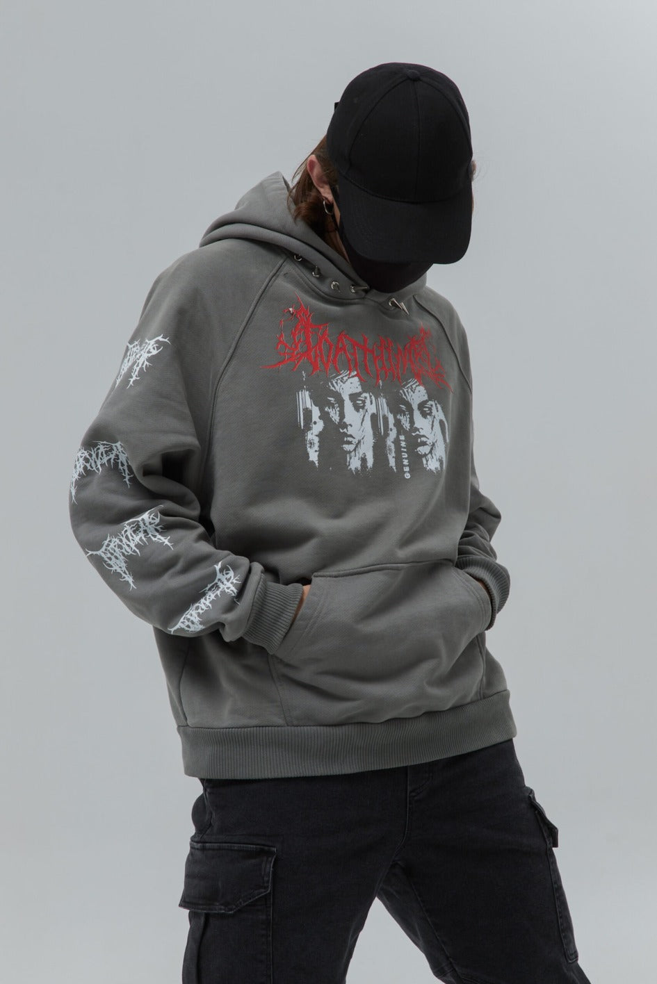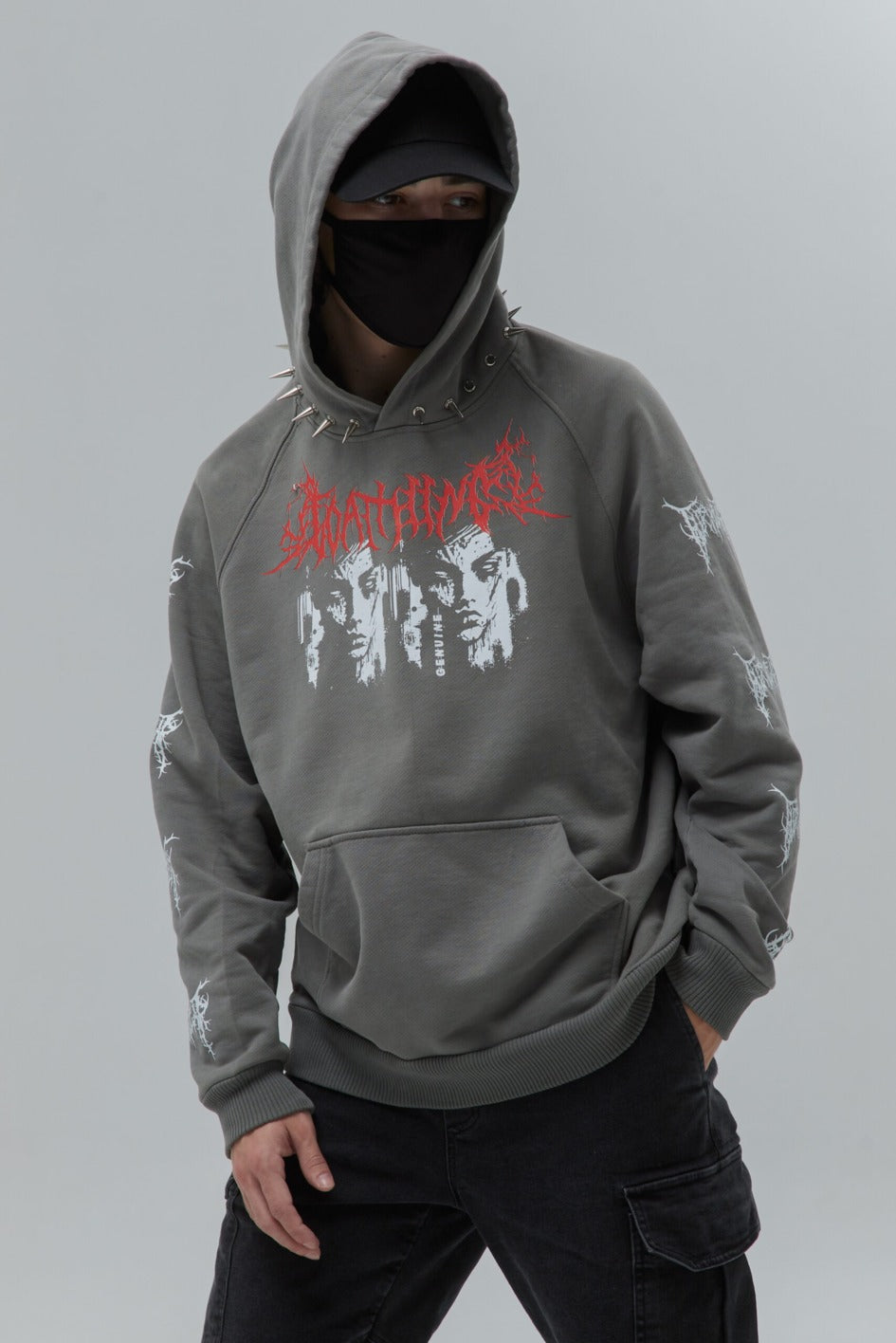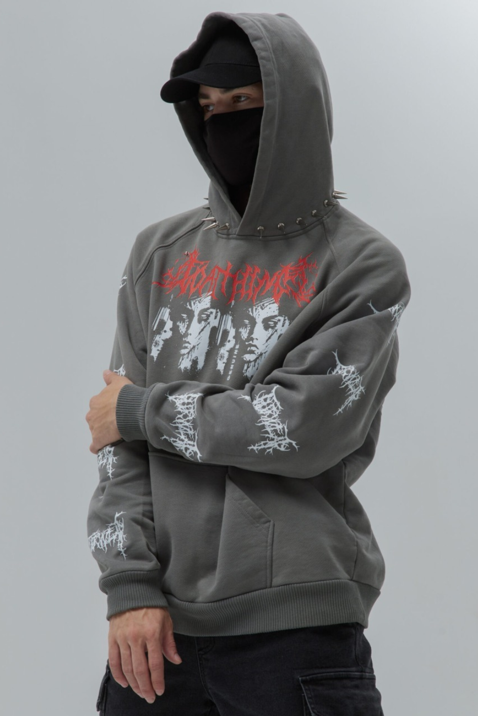 Bawełniana bluza wykonana z gęstego materiału poddanego wstępnemu praniu. Na piersi i rękawach znajduje się nadruk wykonany metodą sitodruku. Dekoracyjne metalowe ćwieki wokół szyi nadają całości charakterystycznego wyglądu. Dzięki specjalnemu procesowi prania każdy egzemplarz ma unikalny efekt, dlatego może różnić się od przedstawionego na zdjęciu.