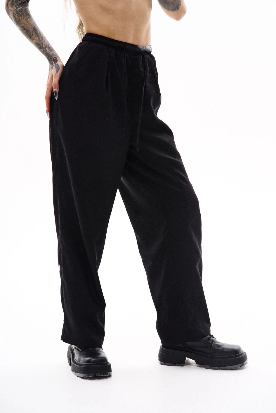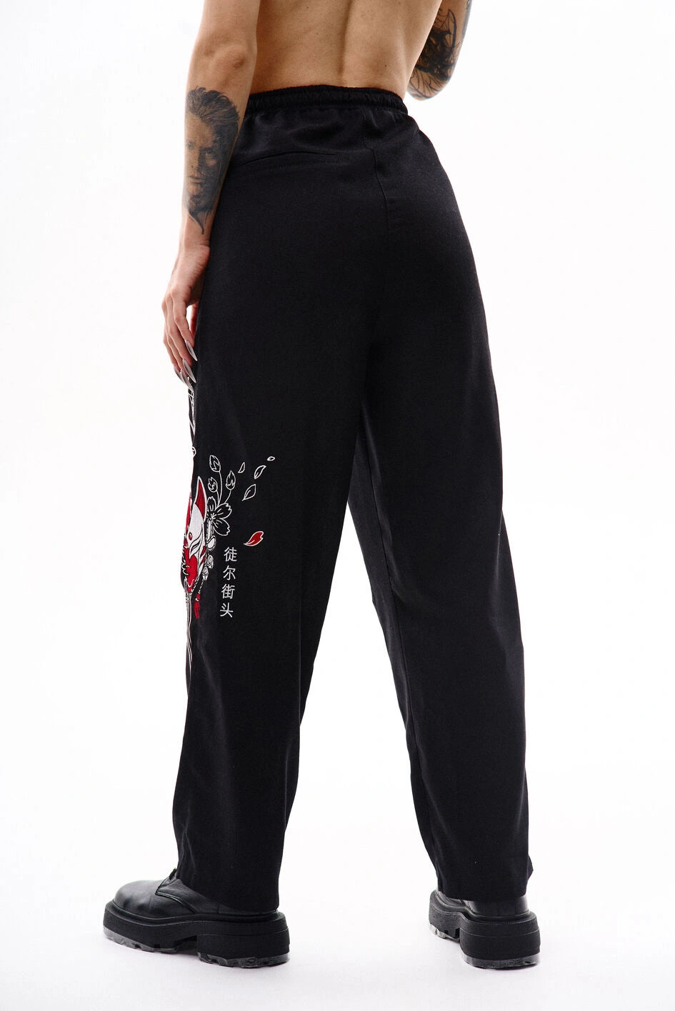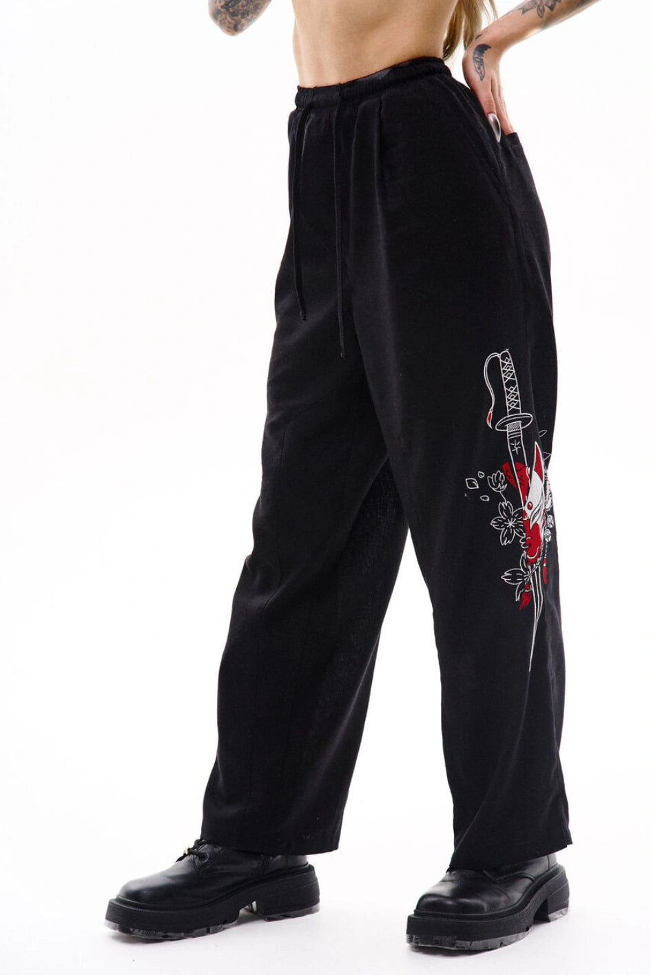 Weite Leinenhose mit regulierbarem Kordelzug und Gummibund. Japanischer Print auf dem linken Hosenbein. Zwei schräge Eingrifftaschen oben, Vordertaschen mit Kordelzug und eine Gesäßtasche. Perfekt kombinierbar mit dem Kimono Hideko oder oversized T-Shirts.