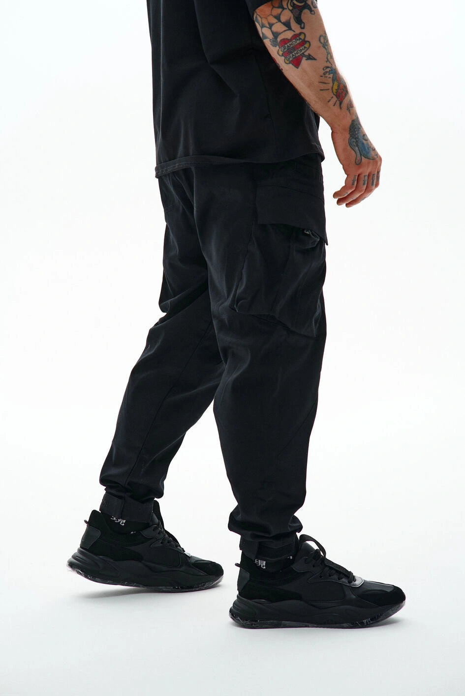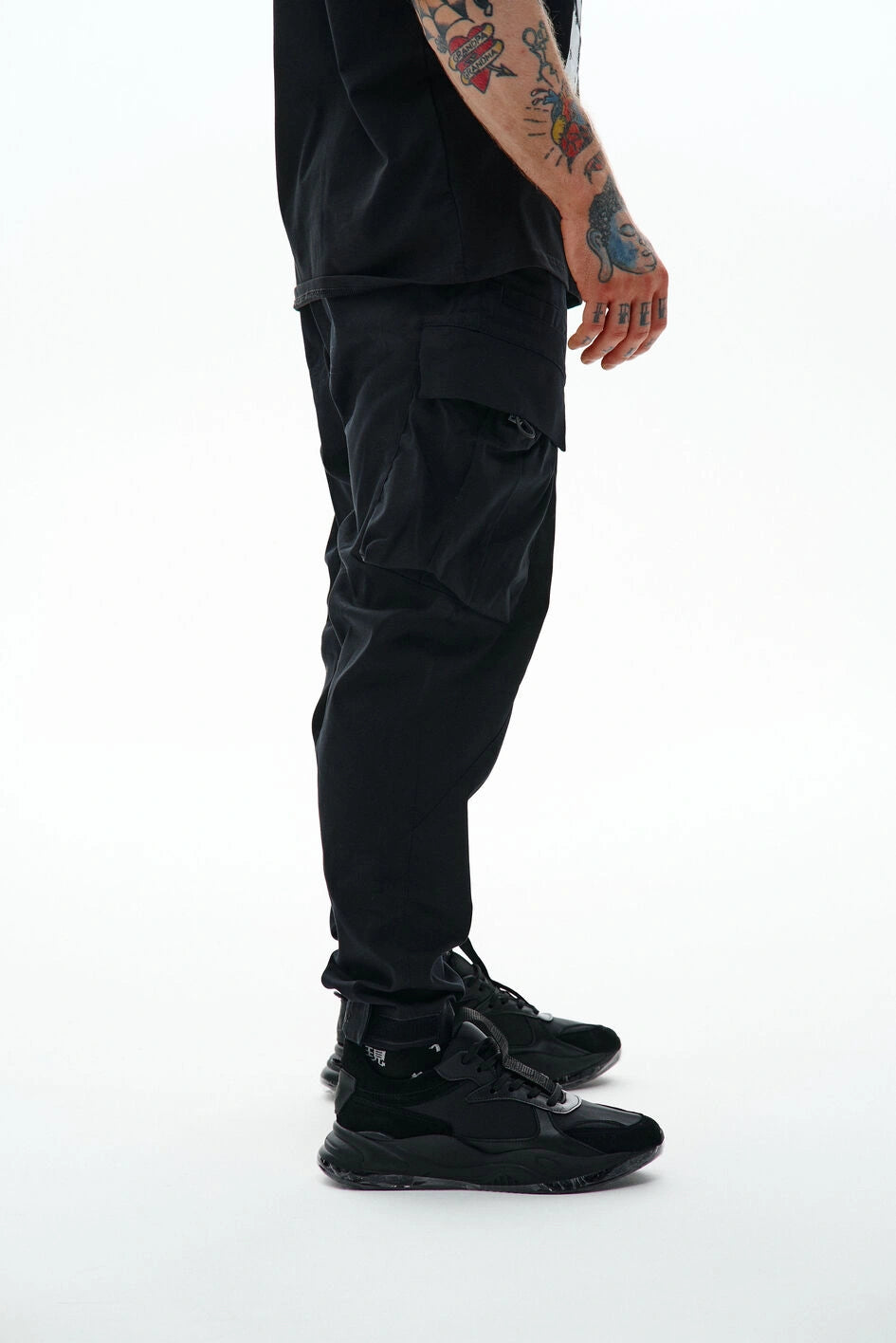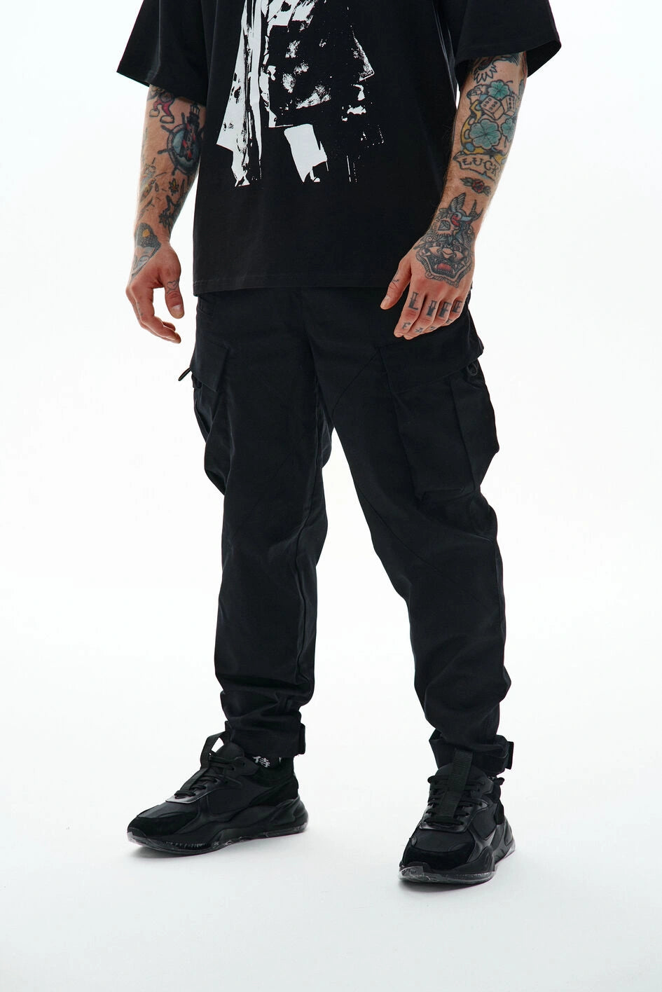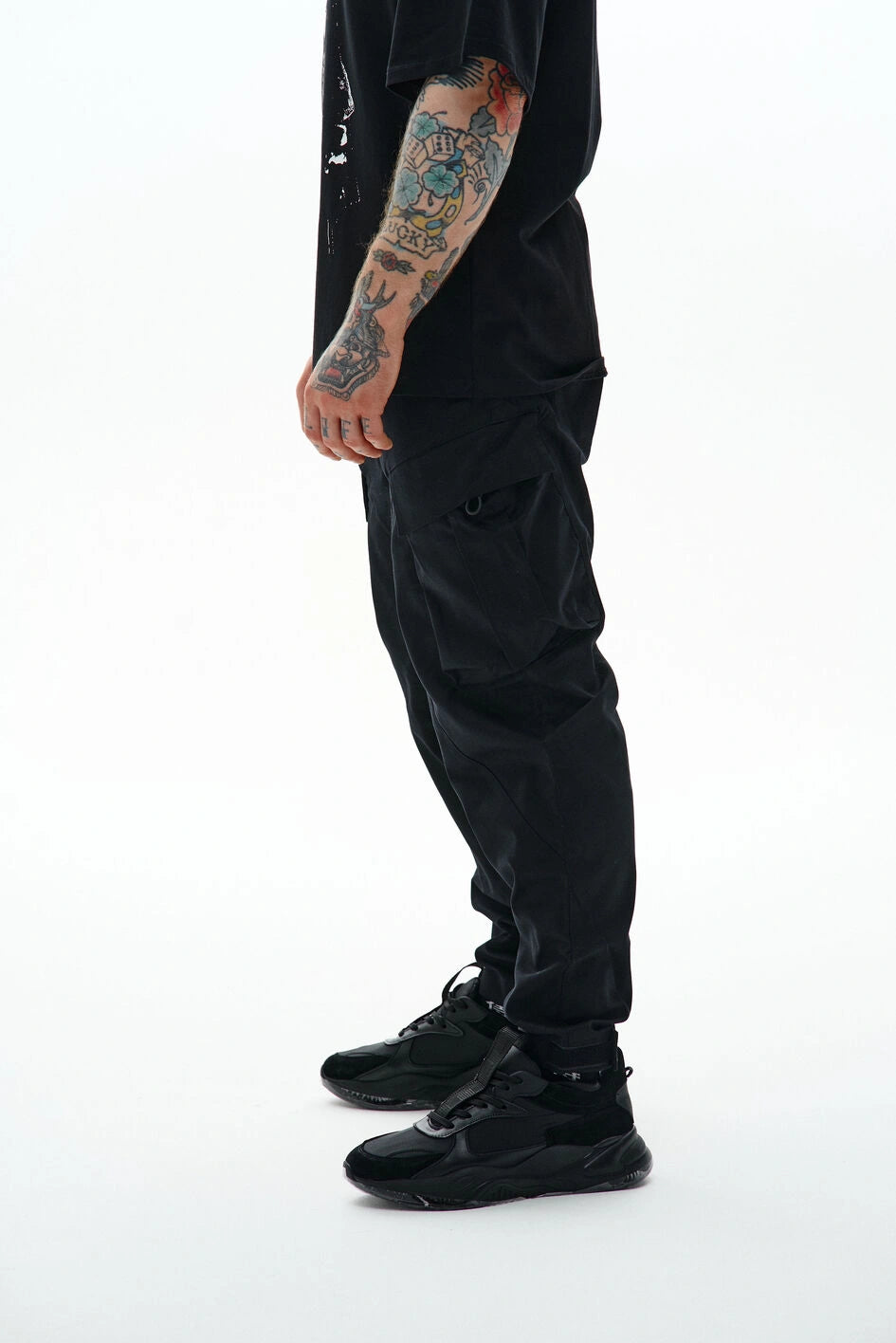 Locker geschnittene Hose. Im Bund befindet sich ein Gummizug mit Kordel. Insgesamt sechs Taschen: zwei aufgesetzte Taschen mit Kordeln und Clips, zwei Eingrifftaschen, zwei Gesäßtaschen. Am Bund ein Halbring für Karabiner und Haken. Die Manschetten sind mit Klettverschluss verstellbar, auf den Aufnähern befindet sich eine schwarze Markenstickerei.