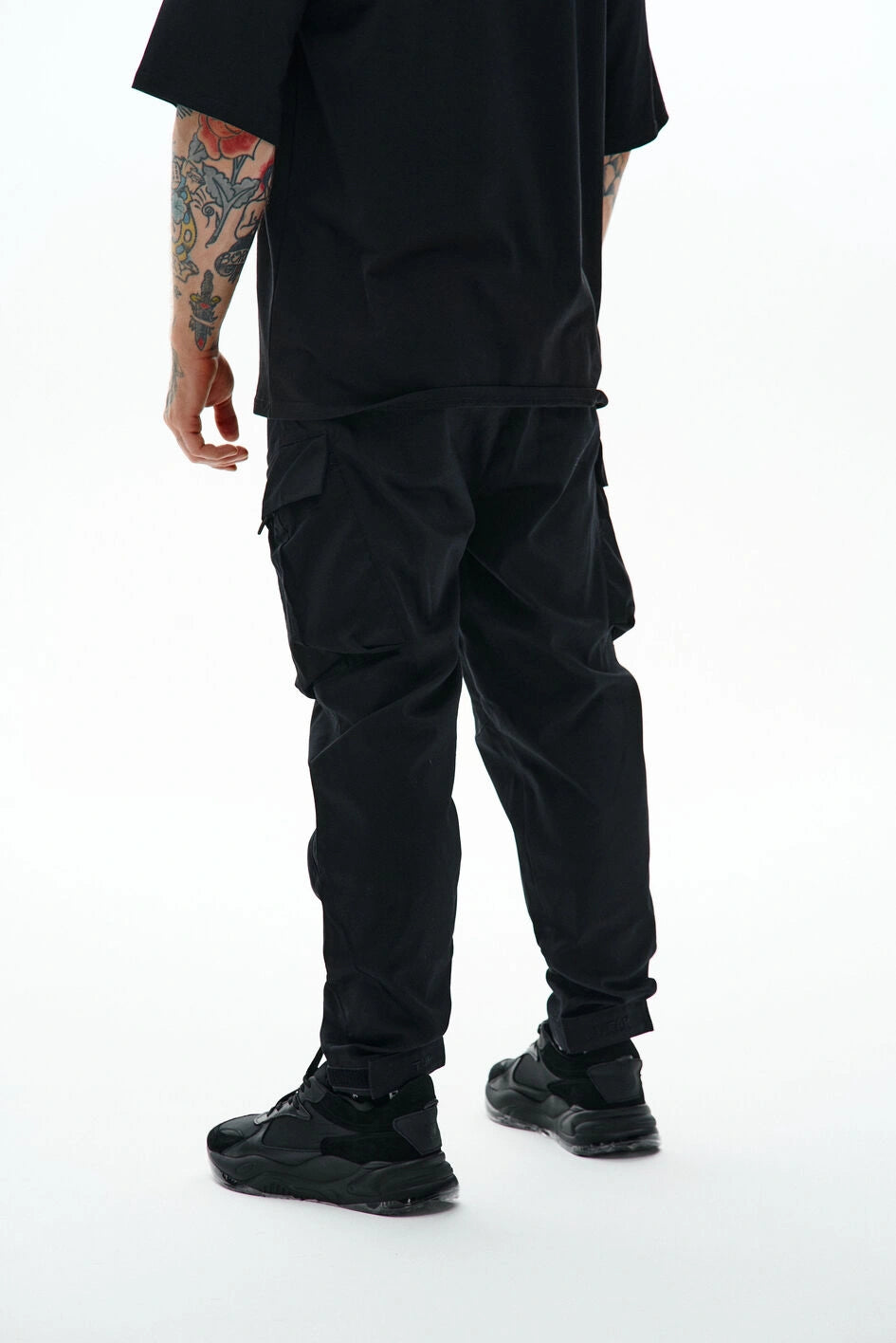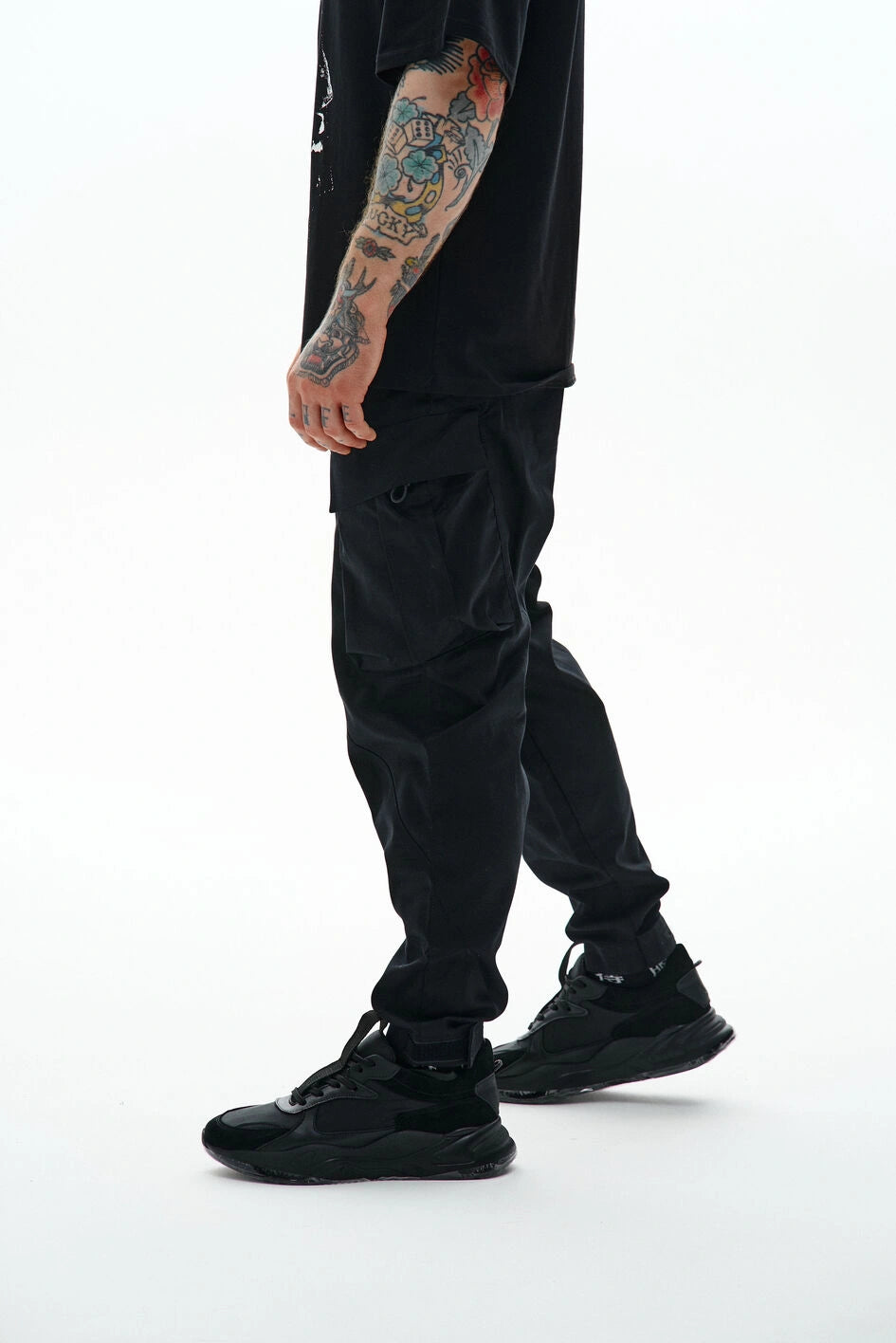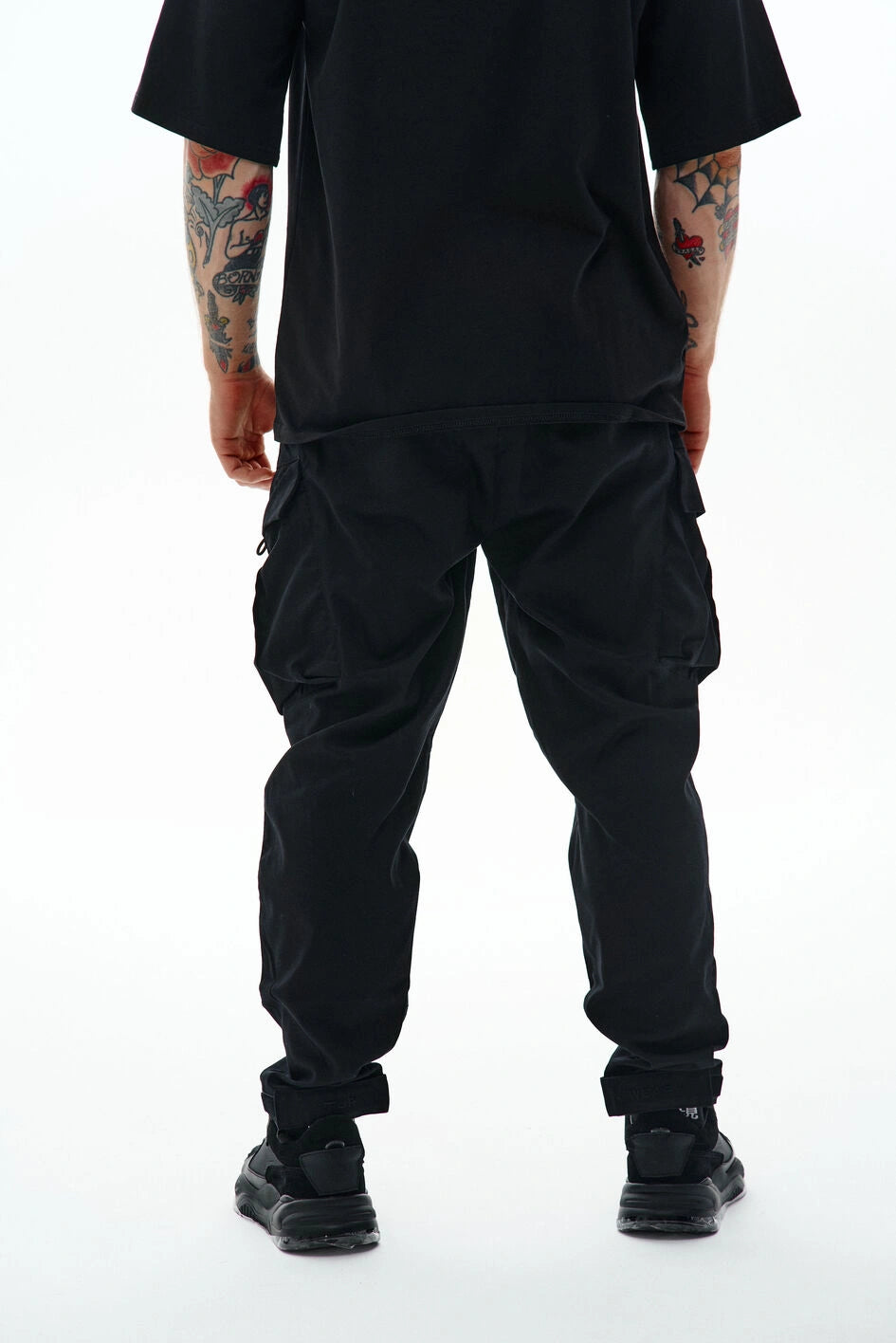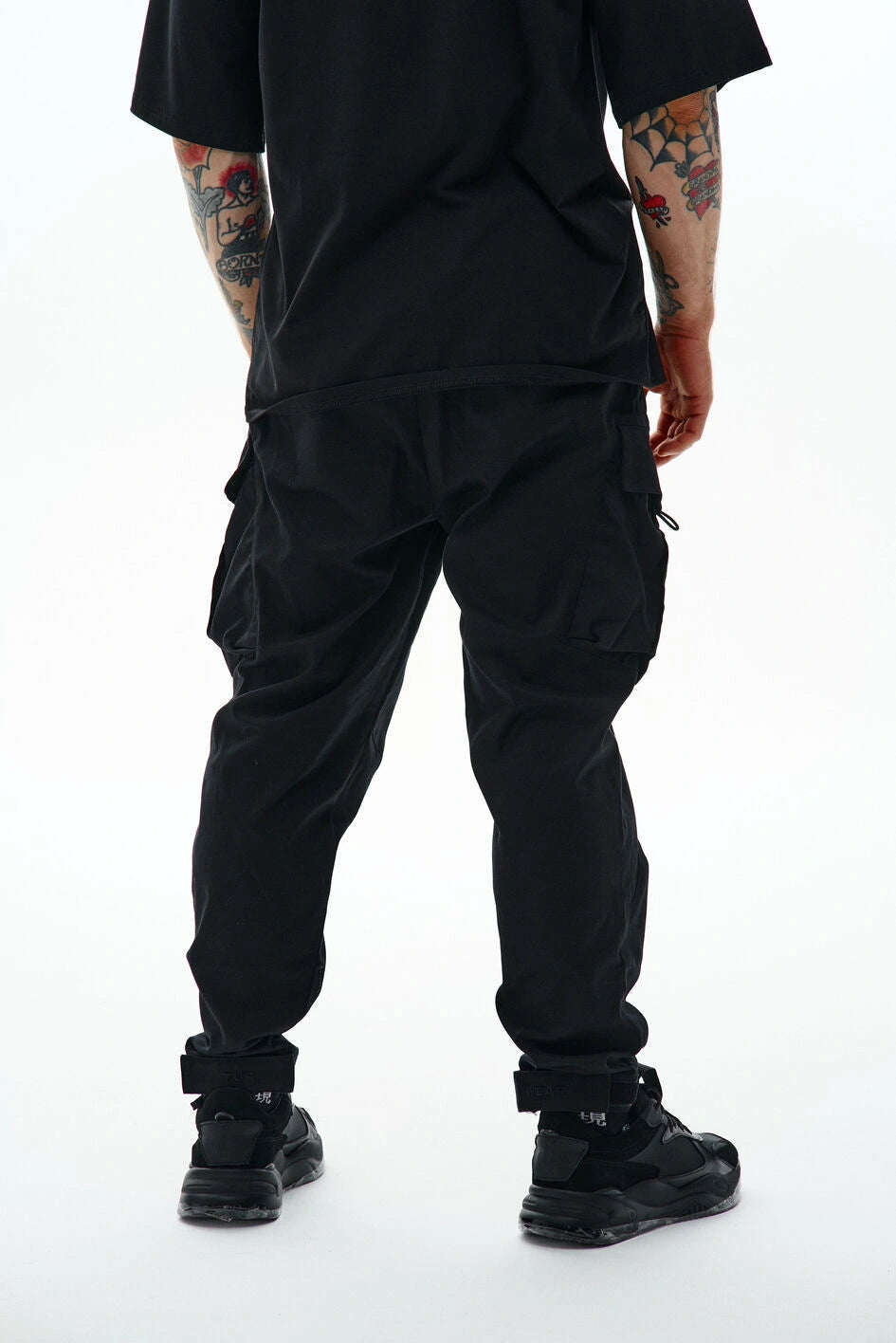 Locker geschnittene Hose. Im Bund befindet sich ein Gummizug mit Kordel. Insgesamt sechs Taschen: zwei aufgesetzte Taschen mit Kordeln und Clips, zwei Eingrifftaschen, zwei Gesäßtaschen. Am Bund ein Halbring für Karabiner und Haken. Die Manschetten sind mit Klettverschluss verstellbar, auf den Aufnähern befindet sich eine schwarze Markenstickerei.