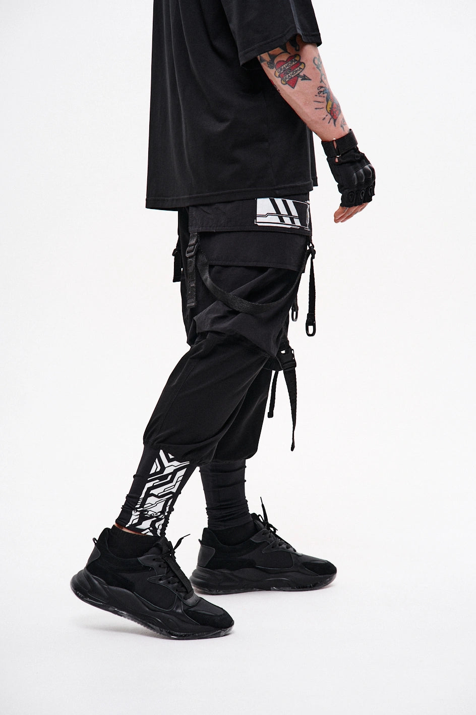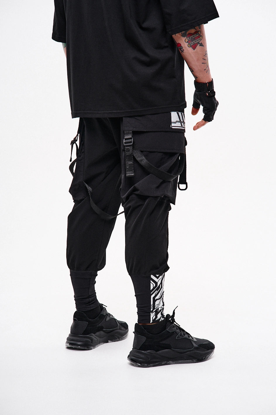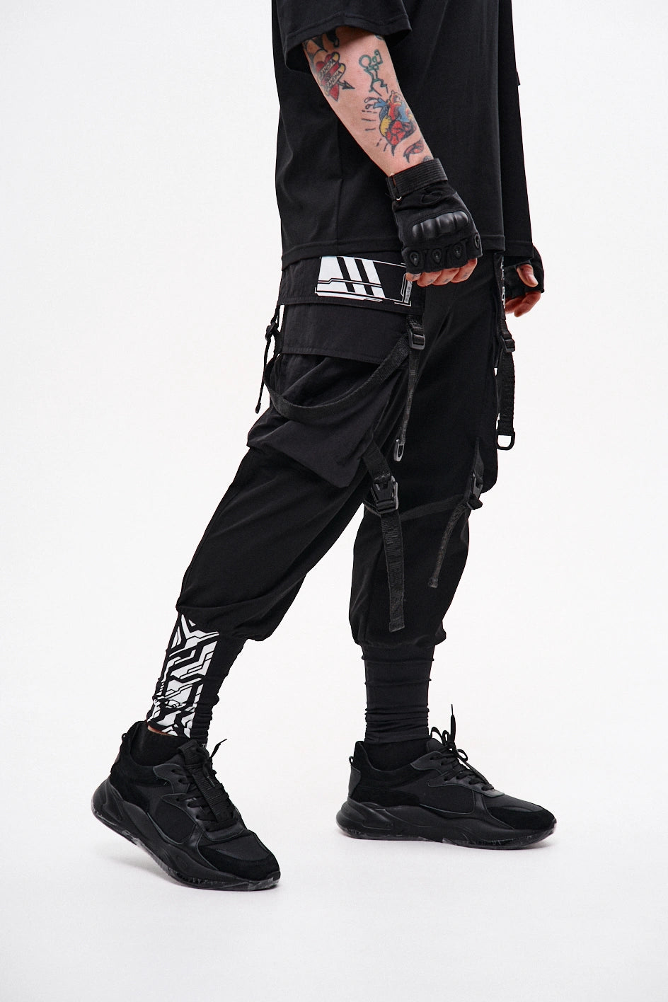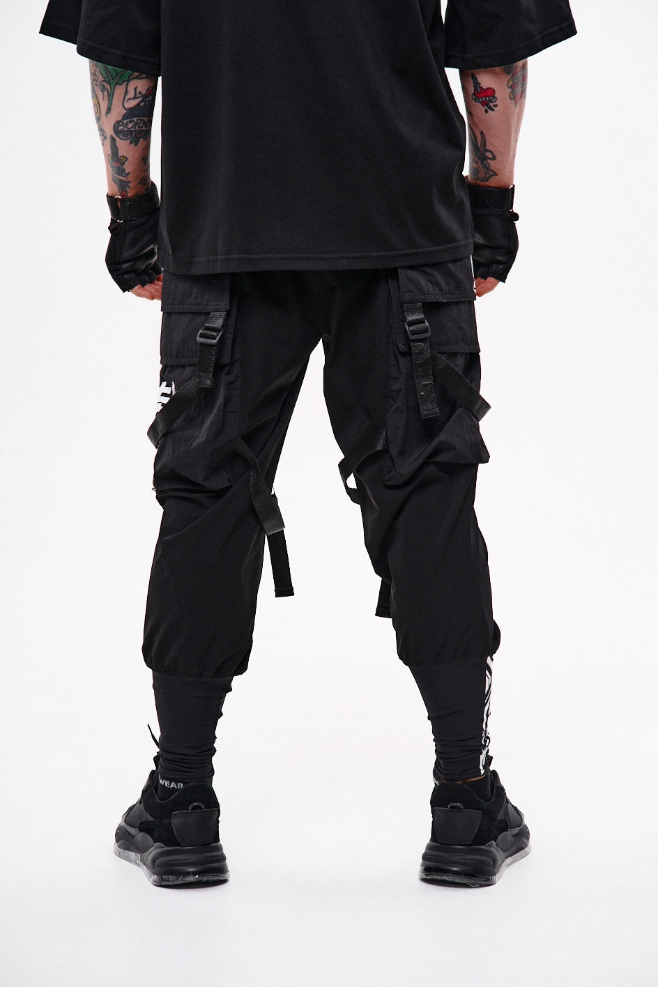 Lockere Cargo-Hose mit hohen Bündchen aus dichtem, elastischem Nylon. Auf dem rechten Bündchen ein Aufdruck. Sechs aufgesetzte Taschen – die oberen Klappentaschen überlappen die Seitentaschen und erzeugen so einen Layering-Effekt. Dekorative Bänder mit Schnallen an den Knien ermöglichen die Regulierung der Beinweite. Bänder, die die Ecken der oberen Taschen verbinden, enden in Halbringen – daran lassen sich Magazintaschen oder Schlüsselanhänger befestigen. Ein weiteres Halbring ist in die vordere Gürtelschlaufe integriert. Die Hose hat Gürtelschlaufen und einen innenliegenden Gummizug für bequemen Sitz. Verschluss – Knopfleiste. Vier Cyberpunk-Prints betonen den Charakter des Modells. Die Seitentaschen sind nach dem Muster der Cargo-Hose „Cyber“ konstruiert.
