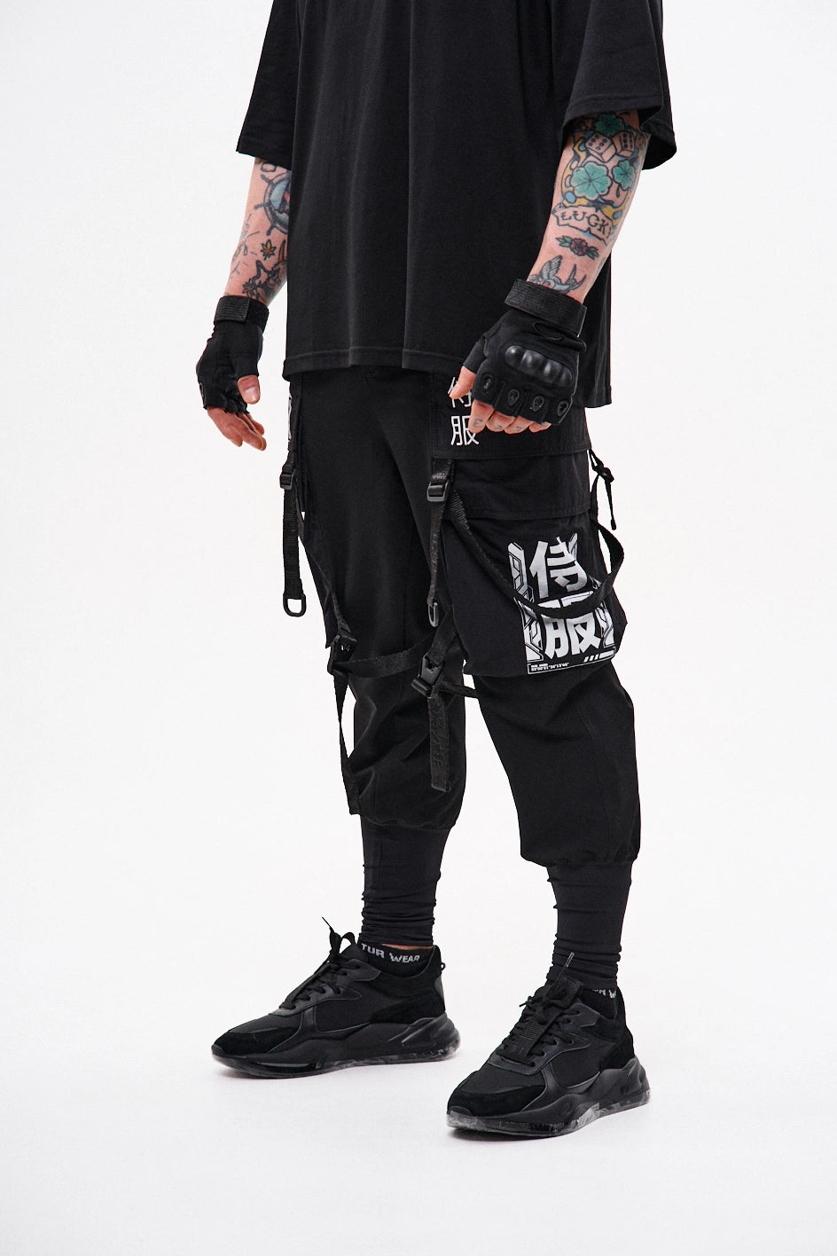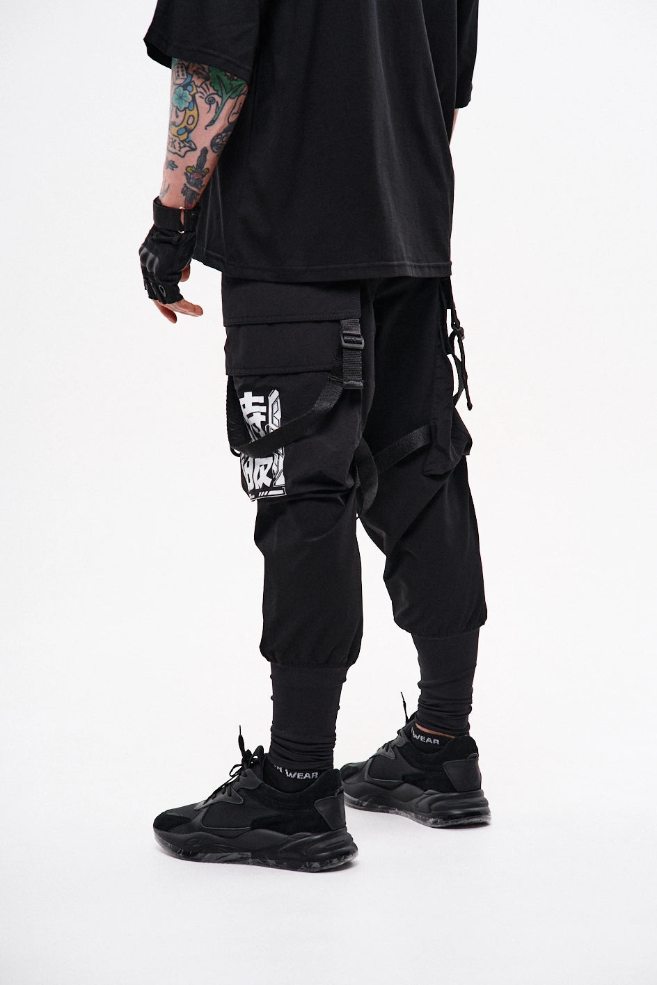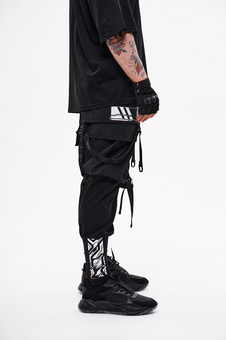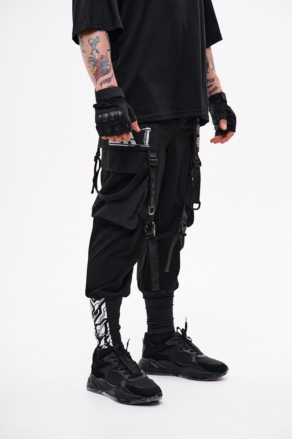 Lockere Cargo-Hose mit hohen Bündchen aus dichtem, elastischem Nylon. Auf dem rechten Bündchen ein Aufdruck. Sechs aufgesetzte Taschen – die oberen Klappentaschen überlappen die Seitentaschen und erzeugen so einen Layering-Effekt. Dekorative Bänder mit Schnallen an den Knien ermöglichen die Regulierung der Beinweite. Bänder, die die Ecken der oberen Taschen verbinden, enden in Halbringen – daran lassen sich Magazintaschen oder Schlüsselanhänger befestigen. Ein weiteres Halbring ist in die vordere Gürtelschlaufe integriert. Die Hose hat Gürtelschlaufen und einen innenliegenden Gummizug für bequemen Sitz. Verschluss – Knopfleiste. Vier Cyberpunk-Prints betonen den Charakter des Modells. Die Seitentaschen sind nach dem Muster der Cargo-Hose „Cyber“ konstruiert.