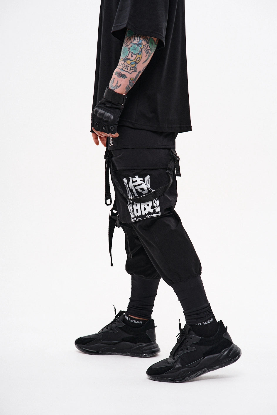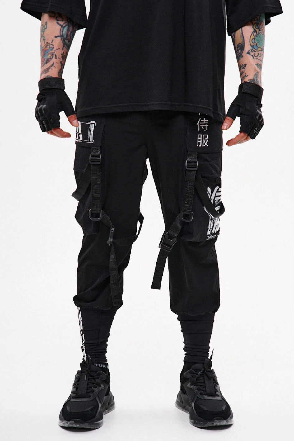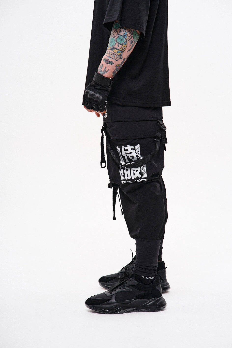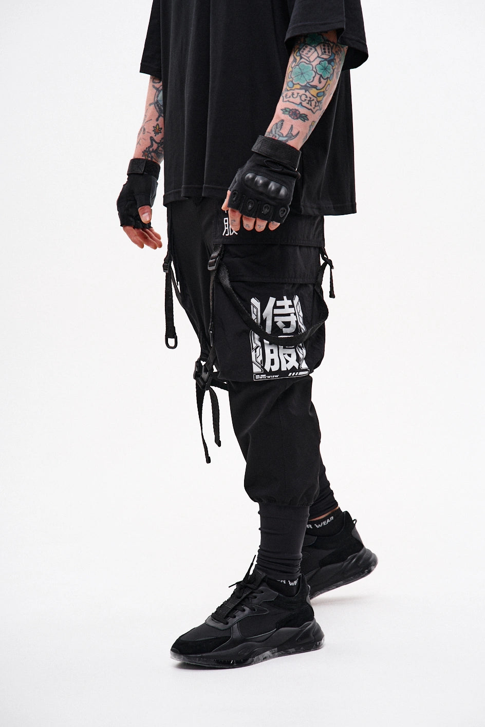 Lockere Cargo-Hose mit hohen Bündchen aus dichtem, elastischem Nylon. Auf dem rechten Bündchen ein Aufdruck. Sechs aufgesetzte Taschen – die oberen Klappentaschen überlappen die Seitentaschen und erzeugen so einen Layering-Effekt. Dekorative Bänder mit Schnallen an den Knien ermöglichen die Regulierung der Beinweite. Bänder, die die Ecken der oberen Taschen verbinden, enden in Halbringen – daran lassen sich Magazintaschen oder Schlüsselanhänger befestigen. Ein weiteres Halbring ist in die vordere Gürtelschlaufe integriert. Die Hose hat Gürtelschlaufen und einen innenliegenden Gummizug für bequemen Sitz. Verschluss – Knopfleiste. Vier Cyberpunk-Prints betonen den Charakter des Modells. Die Seitentaschen sind nach dem Muster der Cargo-Hose „Cyber“ konstruiert.